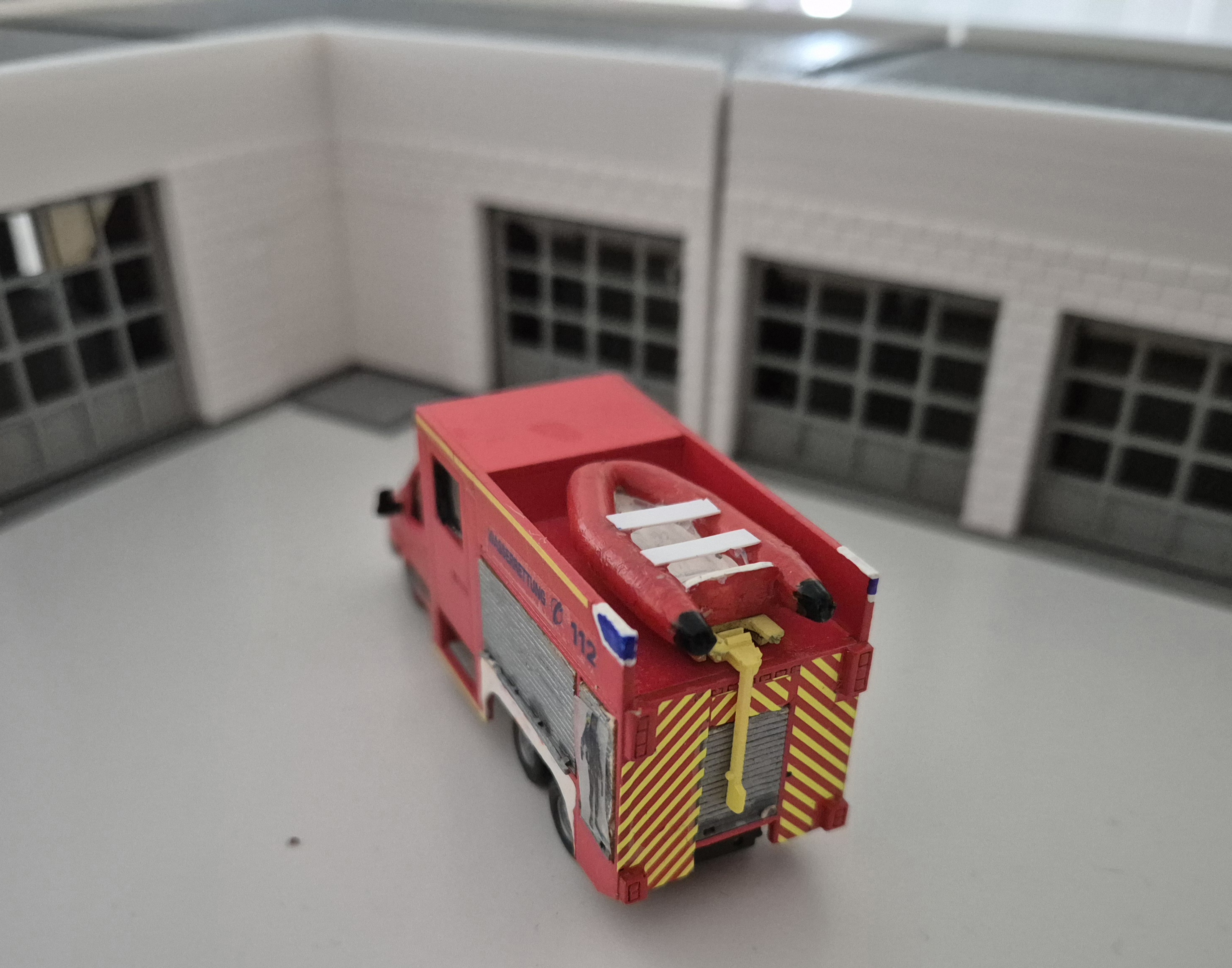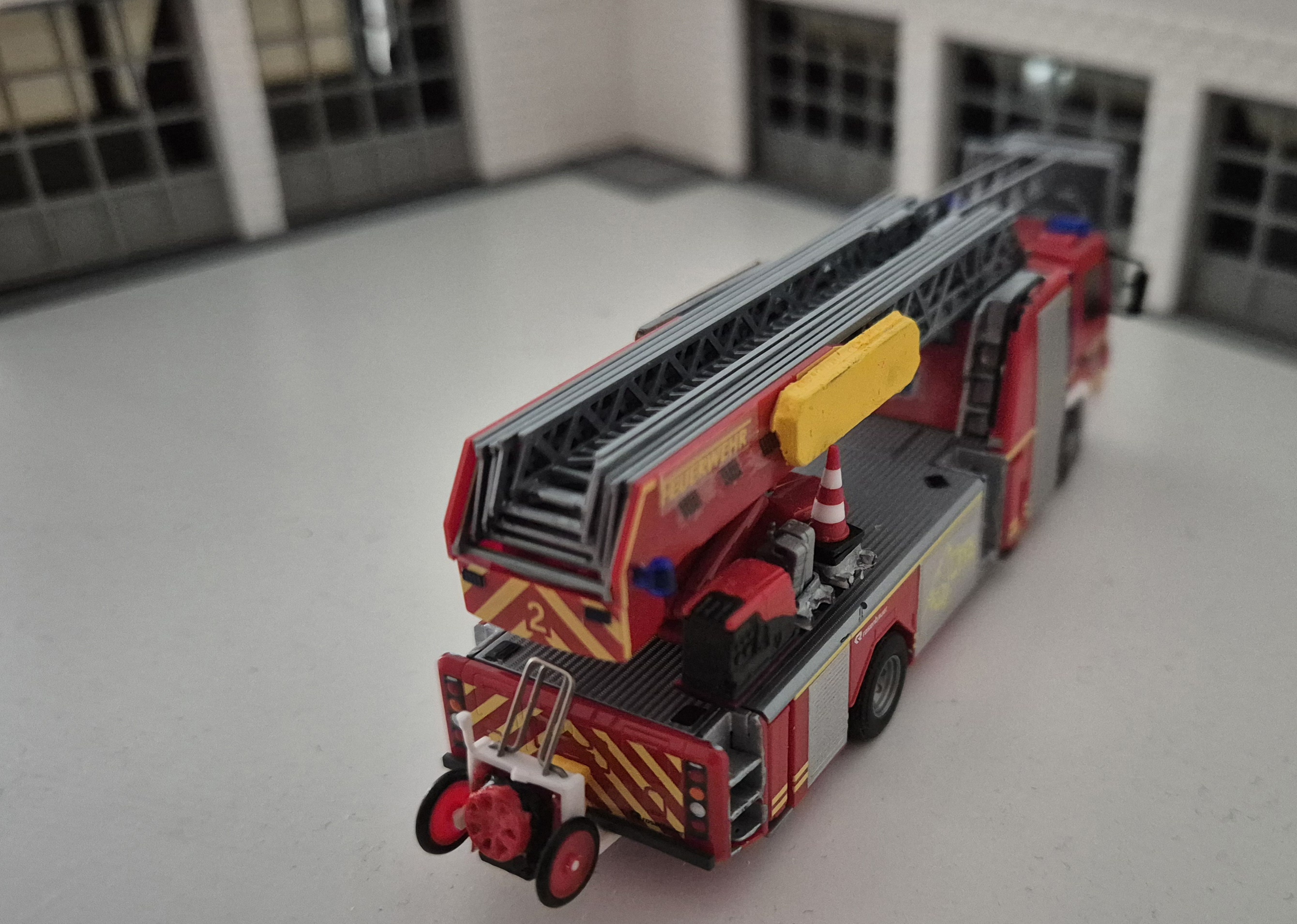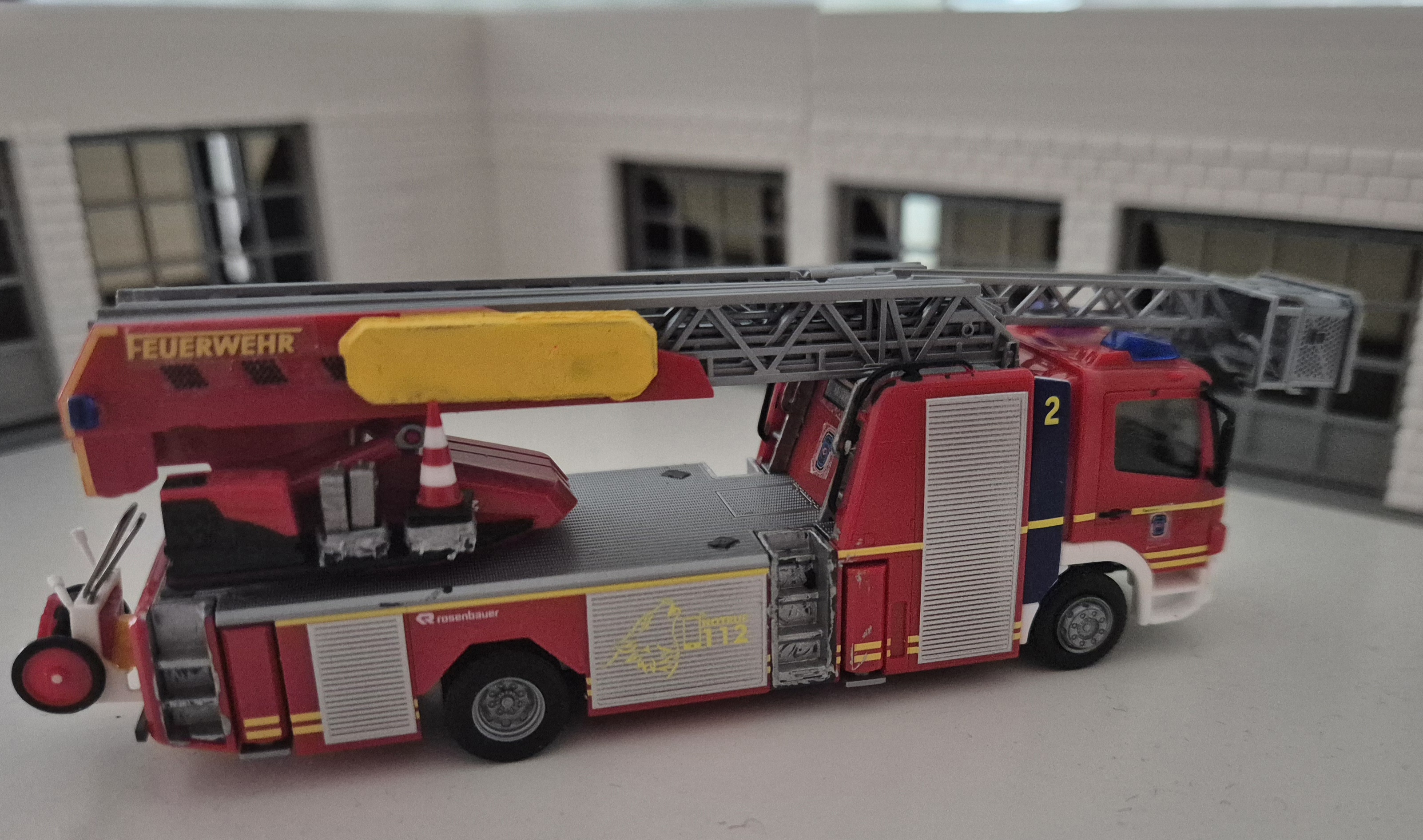 Guten Morgen, ich zeige euch hier das 2. Hubrettungsfahrzeug der freiwilligen Feuerwehr Bad Löwenheim-Reinhardshausen. Aufgrund der vielen Kur und Rehakliniken im Stadtteil Reinhardshausen und der Größe des Stadtgebietes Bad Löwenheim sowie der Topographie ist, neben der Hubrettungsbühne in Bad Löwenheim Mitte, die DLaK Reinhardshausen notwendig. Aufgrund eines Ausfalls des Vorgängerfahrzeugs musste kurzfristig Ersatz beschafft werden, dies geschah durch den Ankauf eines Leasingfahrzeugs der Firma Rosenbauer-Metz. Das Modell entstand aus dem Herpamodell der BF Gelsenkirchen, das mit Decals und vielen Kleinteilen aufgewertet wurde. So ist zb. eine Schleifkorbtrage von Athearn, ein Spineboard, die original KTL sowie ein Resinlüfter auf Rietzehaspel verbaut.