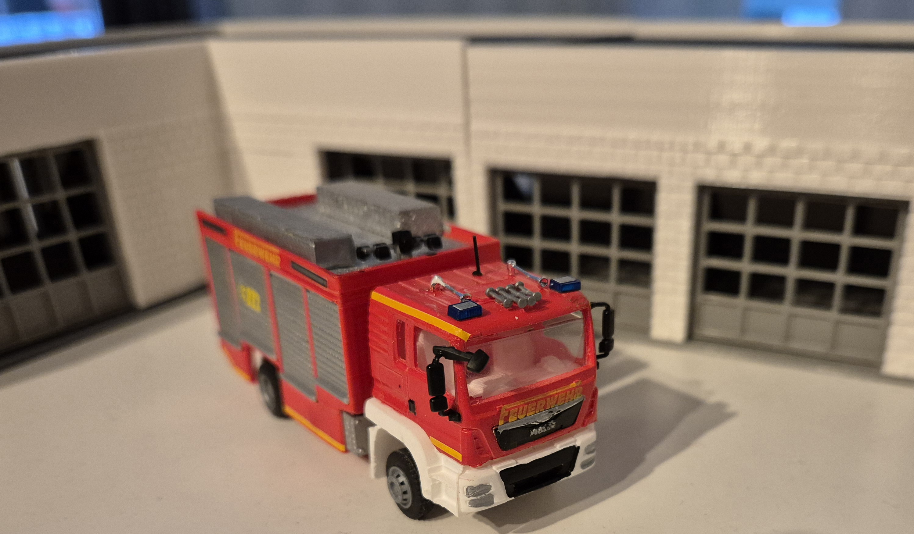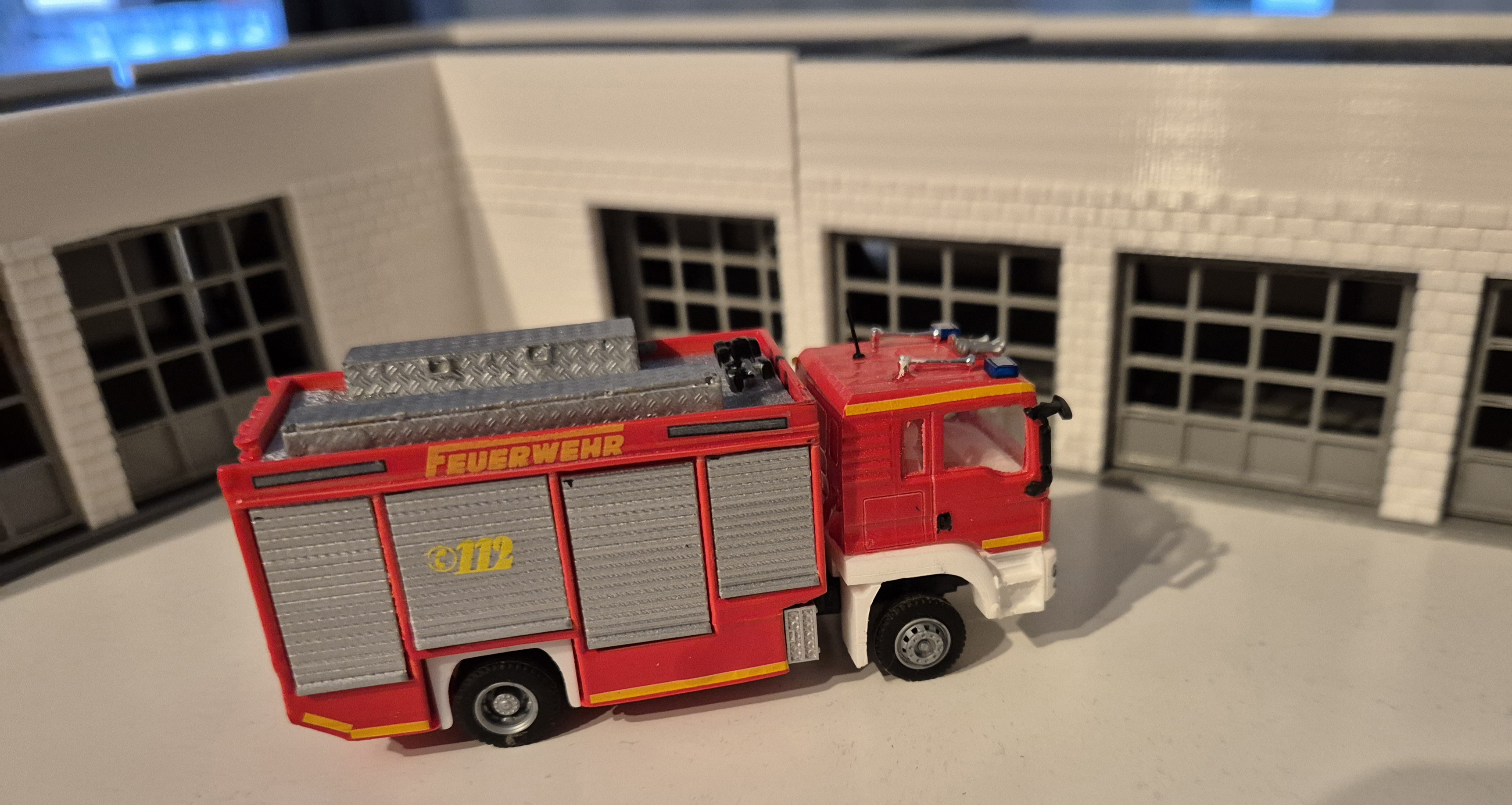 Vielen lieben Dank, Henning. Ich mache dann gleich mal weiter mit dem Rüstwagen der Feuerwehr Bad Löwenheim Mitte auf MAN TGM mit einem Aufbau von Walser. Das Modell entstand aus einer Kabine von Allgäu Modellbau und einem 3D-Druck-Aufbau von Ronny Mandler. Das Modell wurde in RAL 3000 lackiert und mit diversen Kleinteilen und Decals versehen.