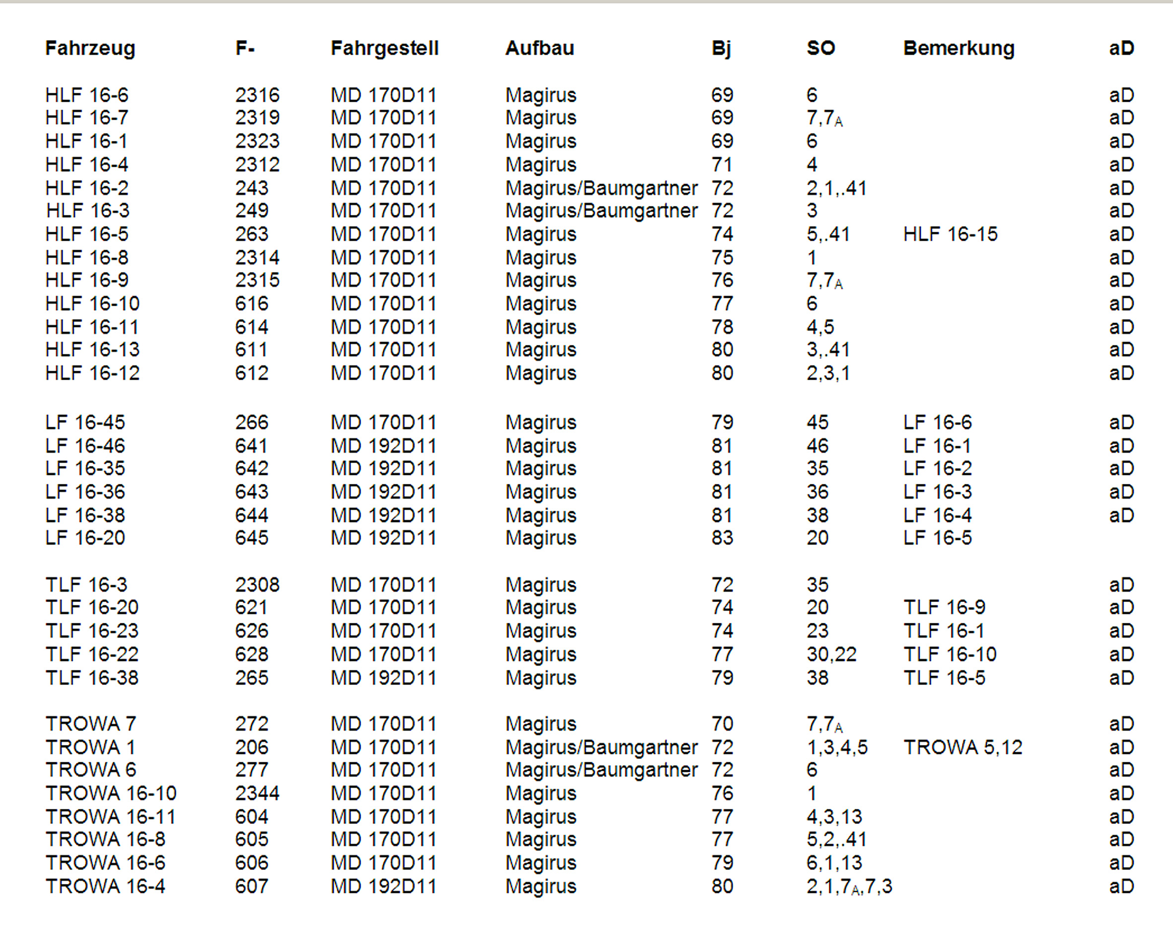 Bei den Fotos und Daten der Magirus D mit Magirus-Aufbau fasse ich der Einfachheit halber unter "Löschfahrzeuge" alle LF, HLF, TLF und TROWA zusammen. Außerdem hatte ich vorhin aus Versehen die Eckhauber mitgezählt.
