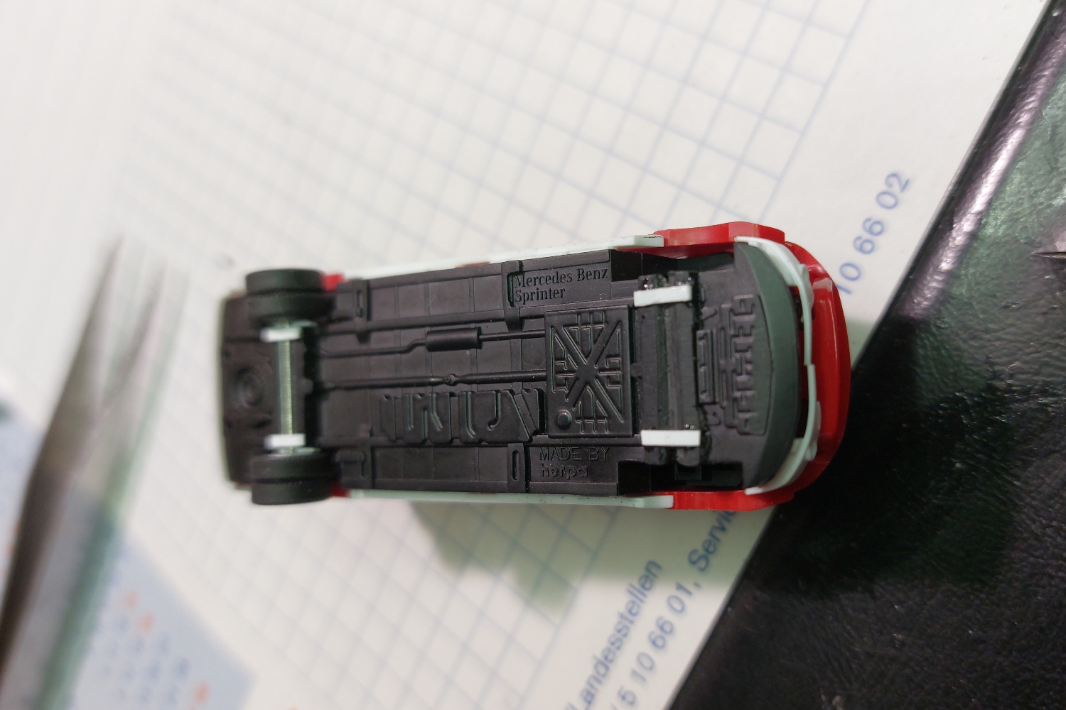 Der Dachträger ist aus einer dünnen schwarzen Kunststoff Platte und Teile aus der Bastelkiste entstanden.