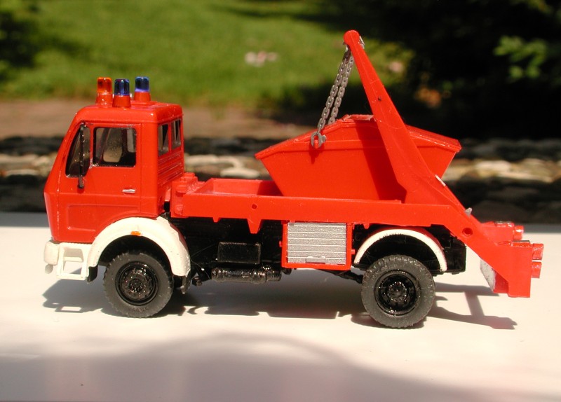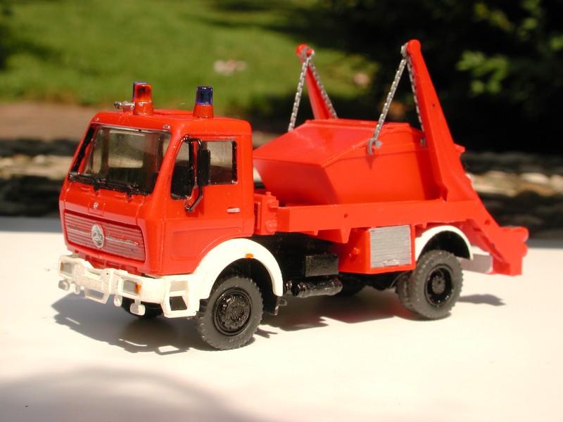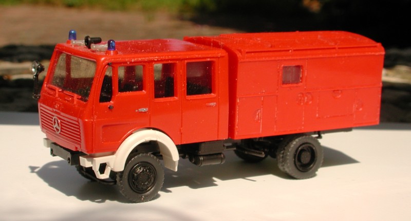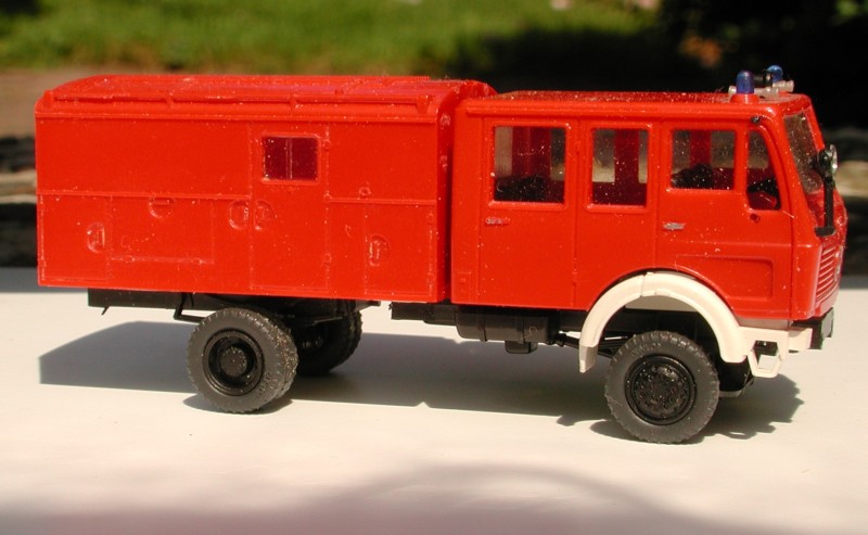 Im Übrigen konnte ich von Preiser nur einen NG-Absetzer mit martialischer Geländebereifung ergoogeln und einen mit für meinen Geschmack zu langem Straßenfahrgestell. Dieser hier hat die 3,2 m Radstand und den "zahmen" Allradlook, den auch die anderen "normalen" Preiser-Feuerwehren haben, und gefällt mir wesentlich besser als die beiden Serienmodelle.