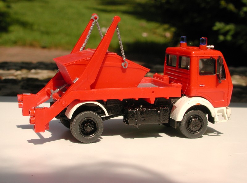 Was mir gar nicht gefallen wollte, waren die rote Ladefläche mit Auswerfermarken (mit Humbrol-polieralufarben lackierter Displayschutzfolie beklebt) und die exponierten Rückleuchten, die ich deswegen in runde (Evergreen), nach Absetzkipperart in "Stahlblechrohre" (Wattestäbchen) getunnelte umgebaut habe. Die Anschlagflächen der Kipparme sind mit "Alublech" vor Lackschäden geschützt. Und das zusätzliche Gelblicht hat der Wagen, da sein Verwendungszweck es mitunter erfordert, andere Verkehrsteilnehmer auch dann vor unorthodoxen Rangiermanövern zu warnen, wenn gerade kein Einsatz im engeren Sinne vorliegt.