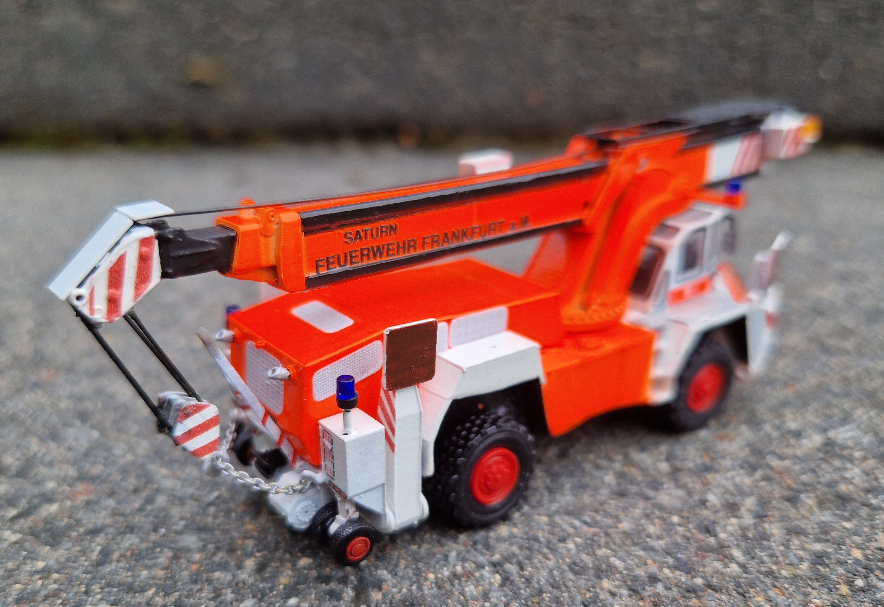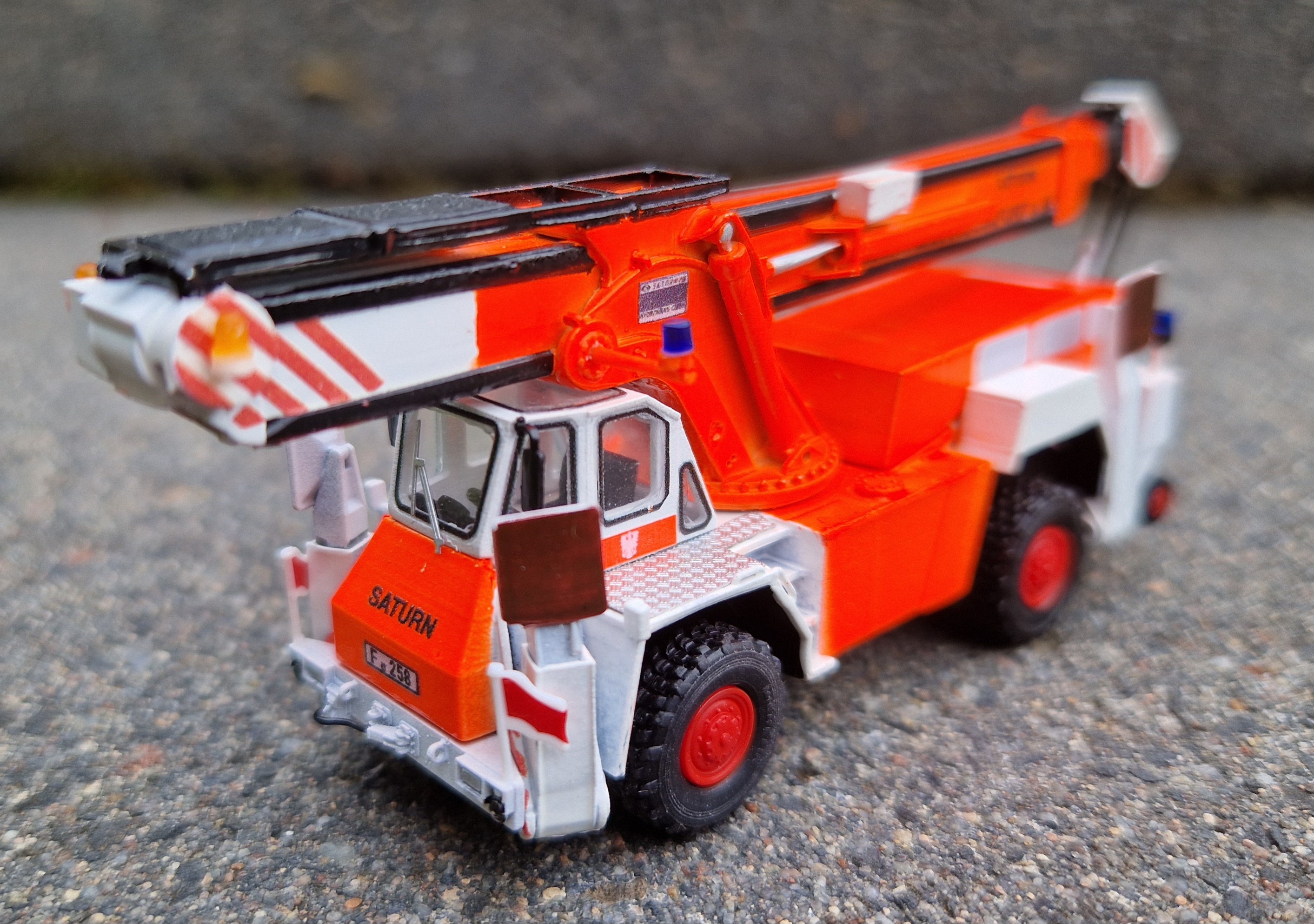 Als letztes Modell möchte ich gerne noch den Saturn-Kran zeigen. Der Bausatz ist ebenfalls von Hawener, wurde jedoch mit anderer Bereifung versehen. Im Gegensatz zu den vorher gezeigten Frankfurter Modellen ist dieses in tagesleuchtrot lackiert.
