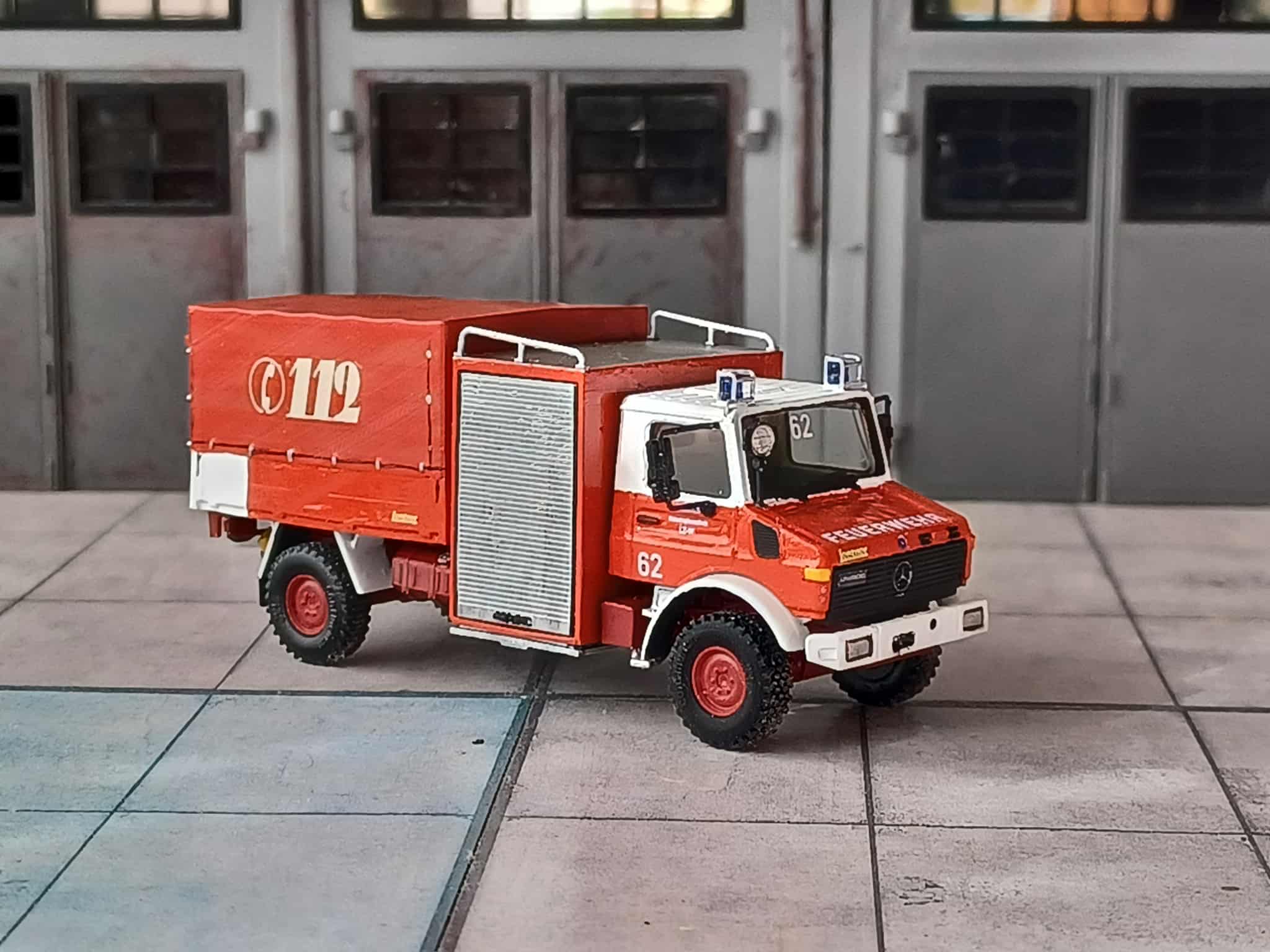 1988 beschaffte man einen neuen Rüstwagen RW1 auf Mercedes-Benz Unimog U 1300 L, U 435 mit Aufbau Metz. Das Fahrzeug stammt aus der gleichen Lieferung wie für Hamburg. Abweichend ist hier kein Schlauchboot verlastet. Das Fahrzeug steht bis heute noch im Reservedienst. Das Modell entstand aus einem Roco Grundmodell mit 3D Druck Aufbau von Niklas Bürger, dazu ein Paar Kleinteile und Decals