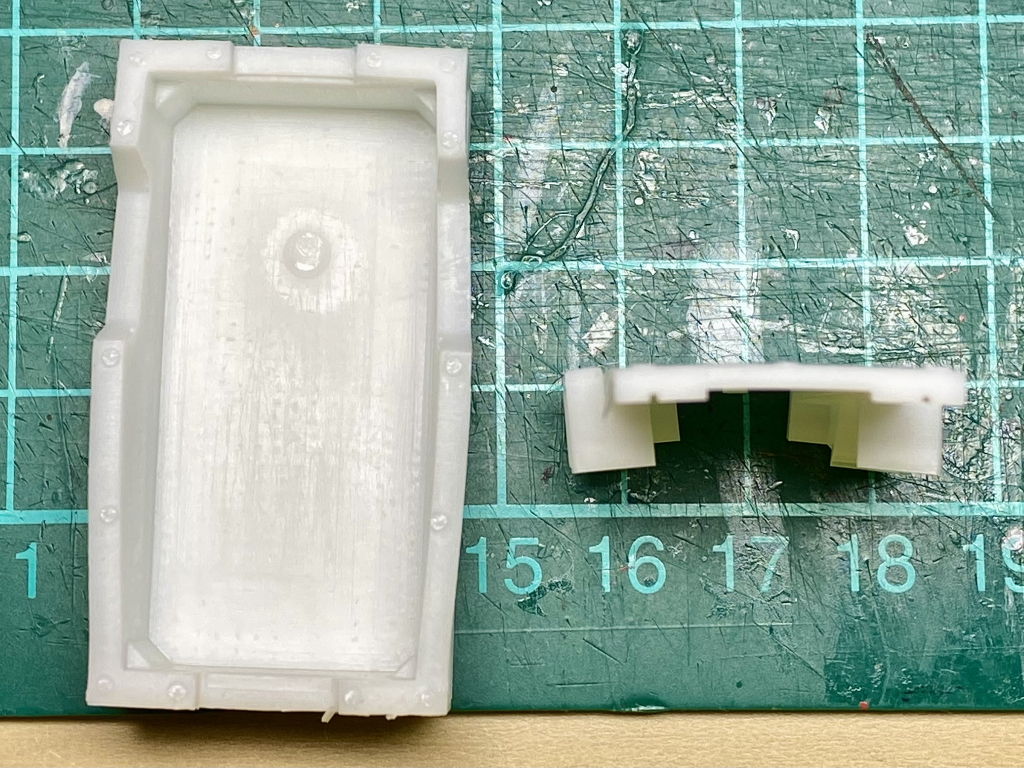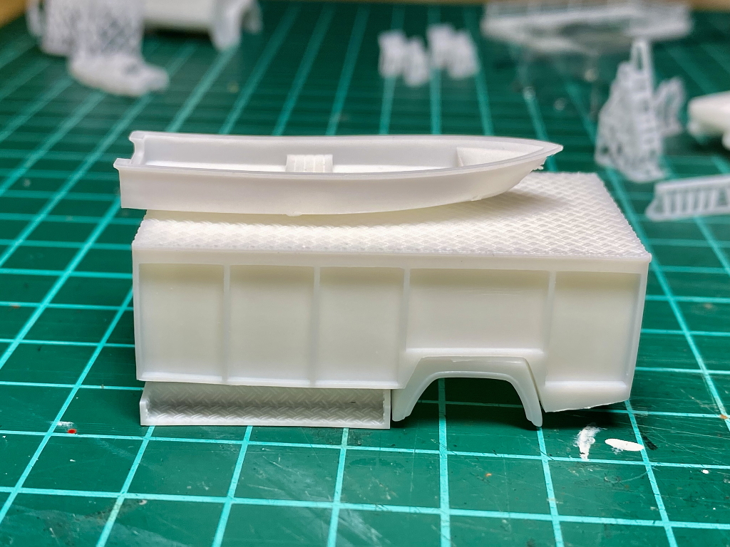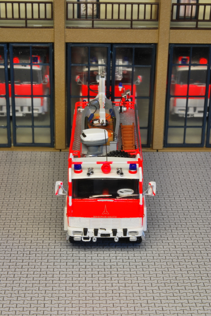 Hierbei handelt es sich um den Kleinserienbausatz von Allgäu Modellbau des ehemaligen Bootswagens der BF Frankfurt a.M. von 1969, der 1981 auf einer Einsatzfahrt umstürzte und anschließend vermutlich verschrottet wurde. Den singelbereiften Magirus D habe ich aus der Schachtel heraus gebaut. Lediglich bei den Felgen habe ich welche vom Roco Unimog verwendet. Außerdem erhielt die Kabine größere Blaulichter, Pressluftfanfaren von Remember! und einen Lautsprecher von Roco. Das Boot habe ich zusätzlich mit Paddeln, Schwimmwesten und einem Rettungsring bestückt. Das Seilgehänge des Bootes entstand aus Bindfäden und Ösen aus der Bastelkiste. Der Ladekran wurde mit Hydraulikleitungen versehen und die Scheinwerfer am Lichtmast mit Kabeln aus 0,3 mm Rundprofil. Ansonsten liegt auf dem Dach noch ein selbstgebauter Abgasschlauch aus Gitarrensaite. Der Bausatz beinhaltet viele Bauteile aus dem 3D-Druck. Leider ist mir die sehr filigrane Reserveradhalterung beim Abtrennen des Stützgerüstes zerbrochen. Sie habe ich mit Kunststoffprofilen selbst rekonstruiert.