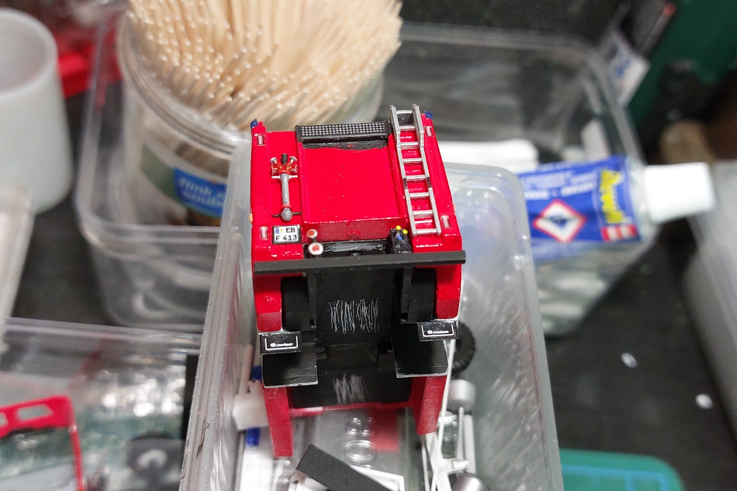 Am Aufbau wurde für den KAT eine Öffnung geschaffen. Wasser-, Schaum-Ab- und Eingänge wurden aus Evergreen Rundprofilen gefertigt. Innen wurden zwei Atemschutzgeräte für den A-Trupp eingebaut, und das Heck erhielt zusätzliche Details.