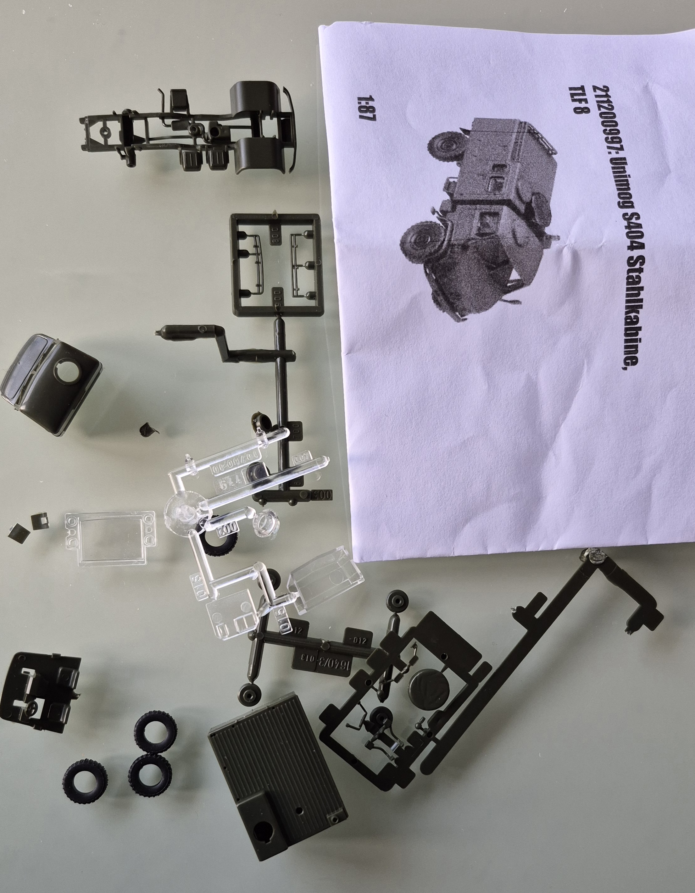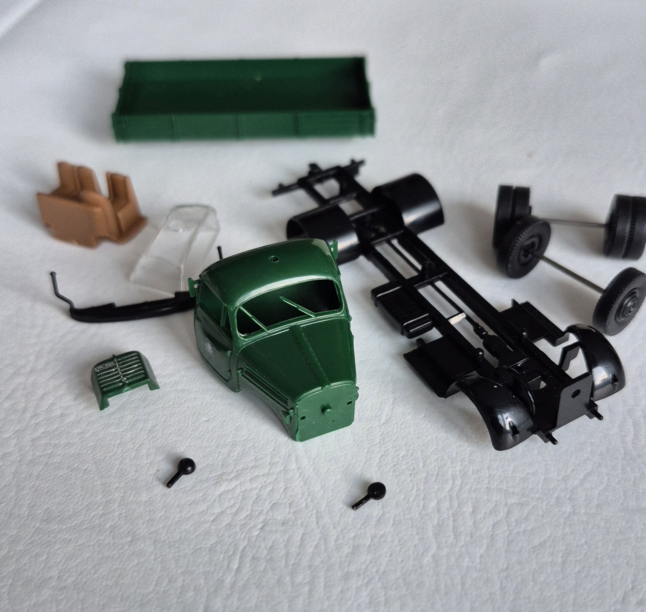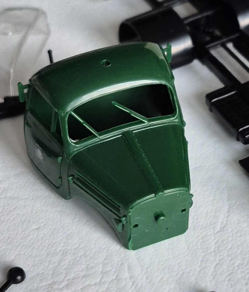 Es geht weiter: die Kabine ist jetzt grundiert und hat neue Trittstufen (dafür jetzt keine Peilstangen mehr, abgebrochen). Aber Ersatz in Form von Insektennadeln ist schon unterwegs. Am Fahrgestell sind schon mal neue Scheinwerfer, Reservekanister und eine neue Kupplung angebracht. Habe gerade beim fotografieren gemerkt, daß das Teil gar keinen Auspuff hat- da muß ich auch noch was zusammentackern.