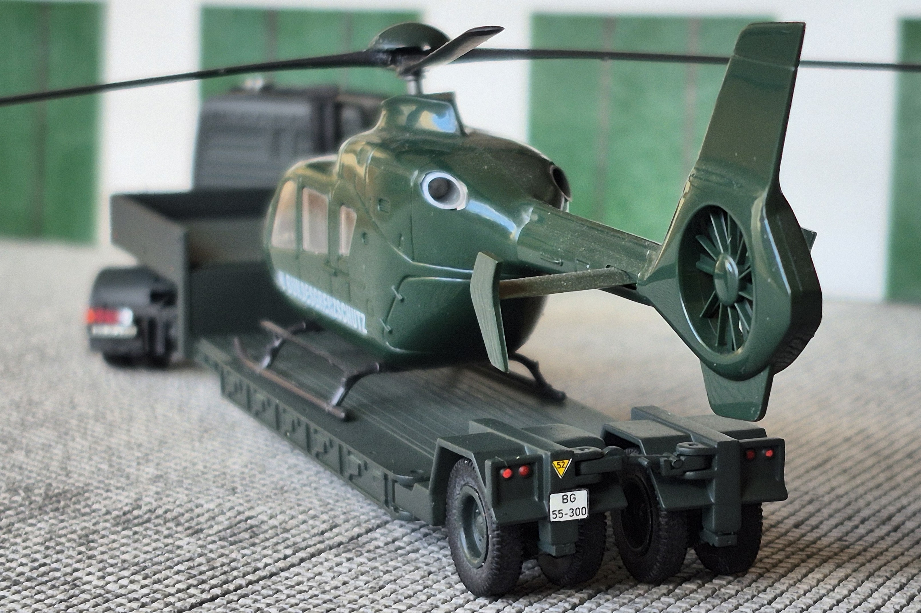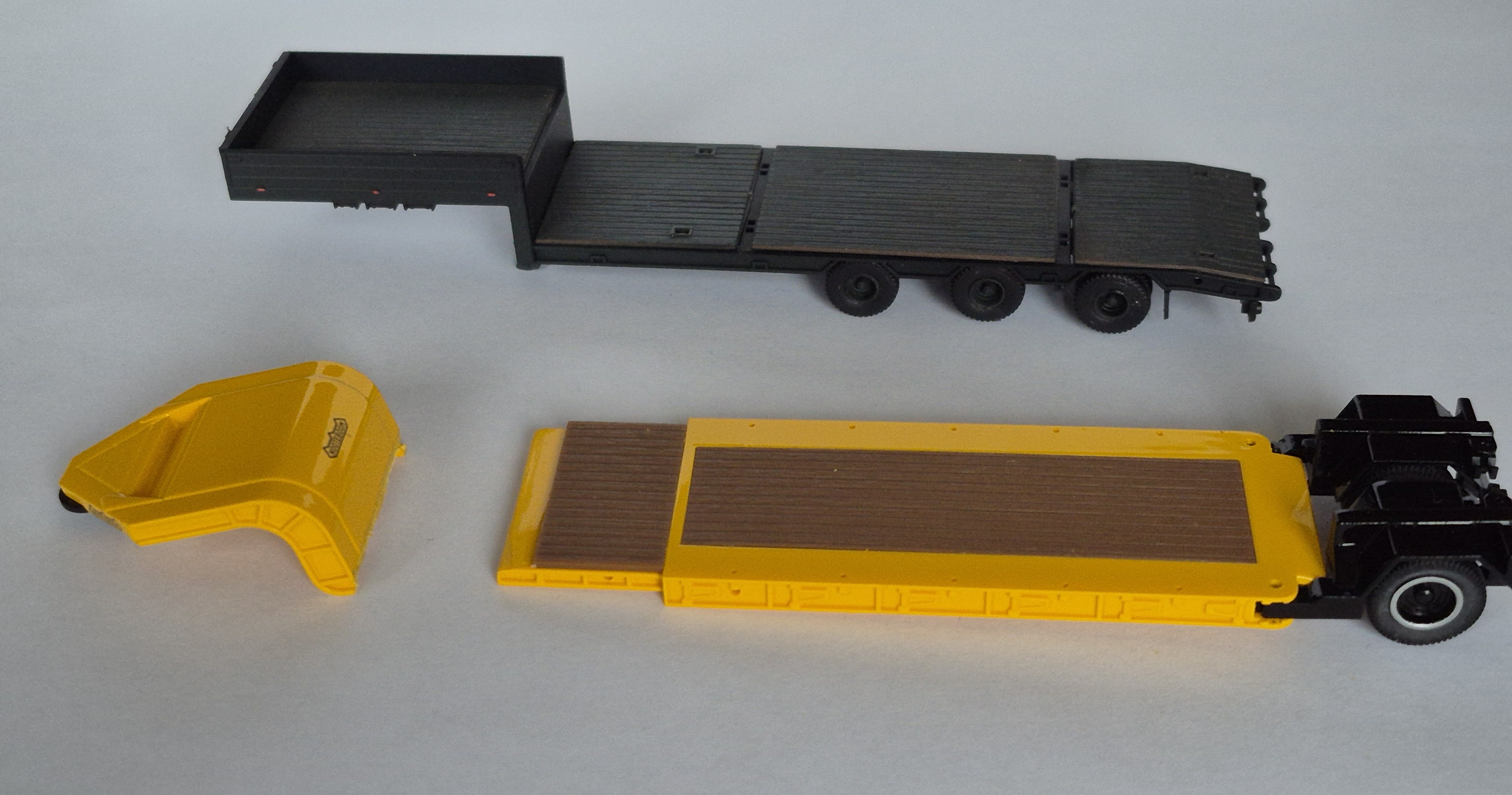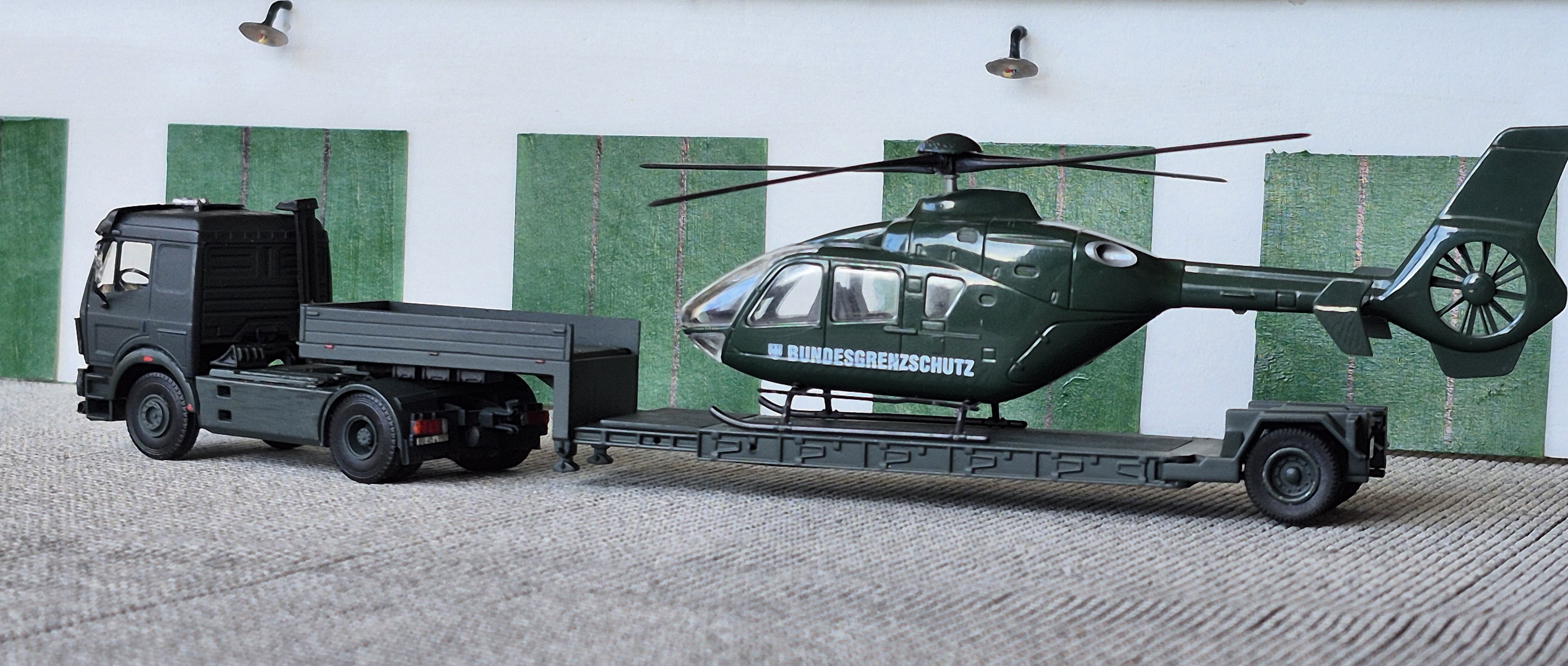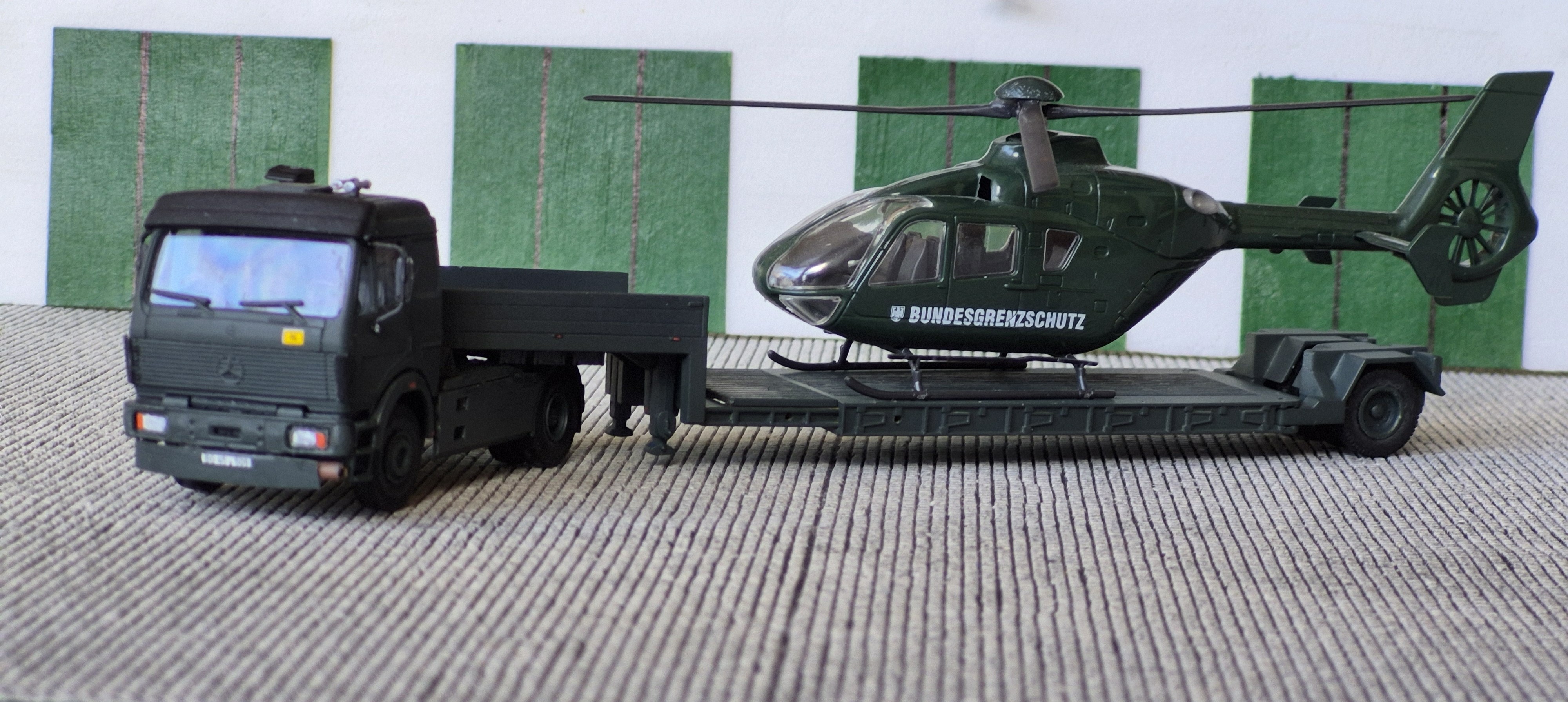 Gestern habe ich meinen Hubschraubertransport etwas überarbeitet. Frank Kleinschmidt hatte mich ja auf einen Auflieger mit einer Achse aufmerksam gemacht. Konnte den jetzt in der Bucht für kleines Geld abstauben. Dann aus zwei einen gemacht und jetzt sieht der Transporter dem Original doch hoffentlich sehr ähnlich!
