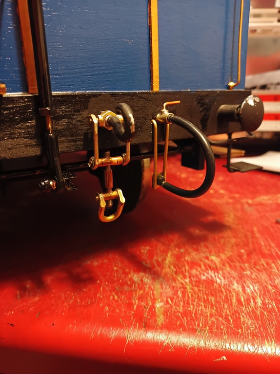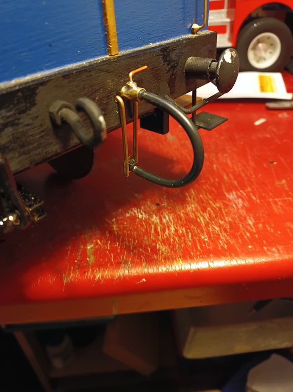 Also musste eine Feststellbremse her. Nach einigem Suchen wurde ich fündig. Die Feststellbremse sollte auch bei Vorführungen gut erreichbar sein. Hier bot sich die Variante an mit der Bremskurbel im Dachbereich, die bei sehr alten Wagen eine Zeit lang verwendet wurde. Auch die Pufferbohle bekam ein Update.