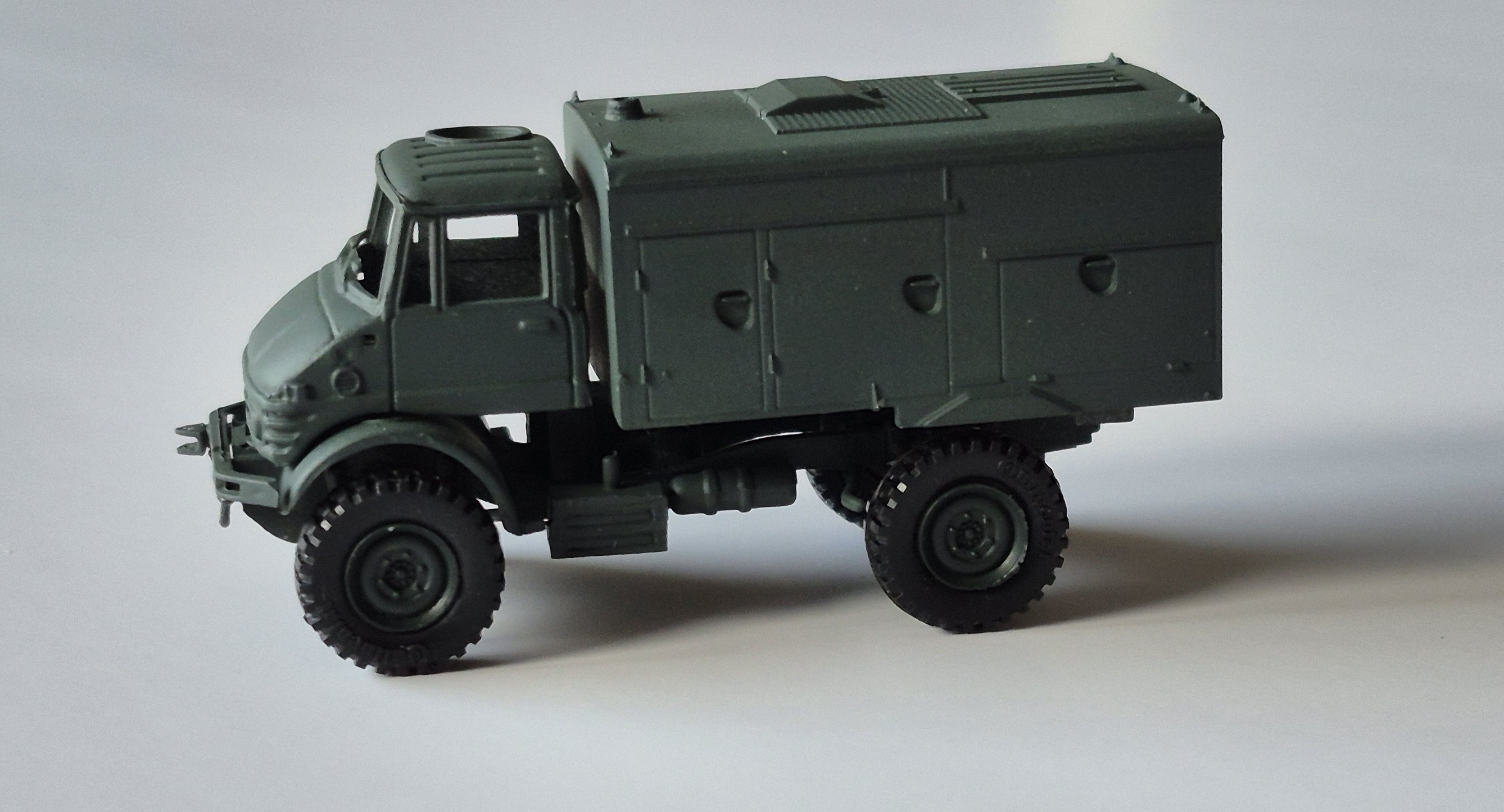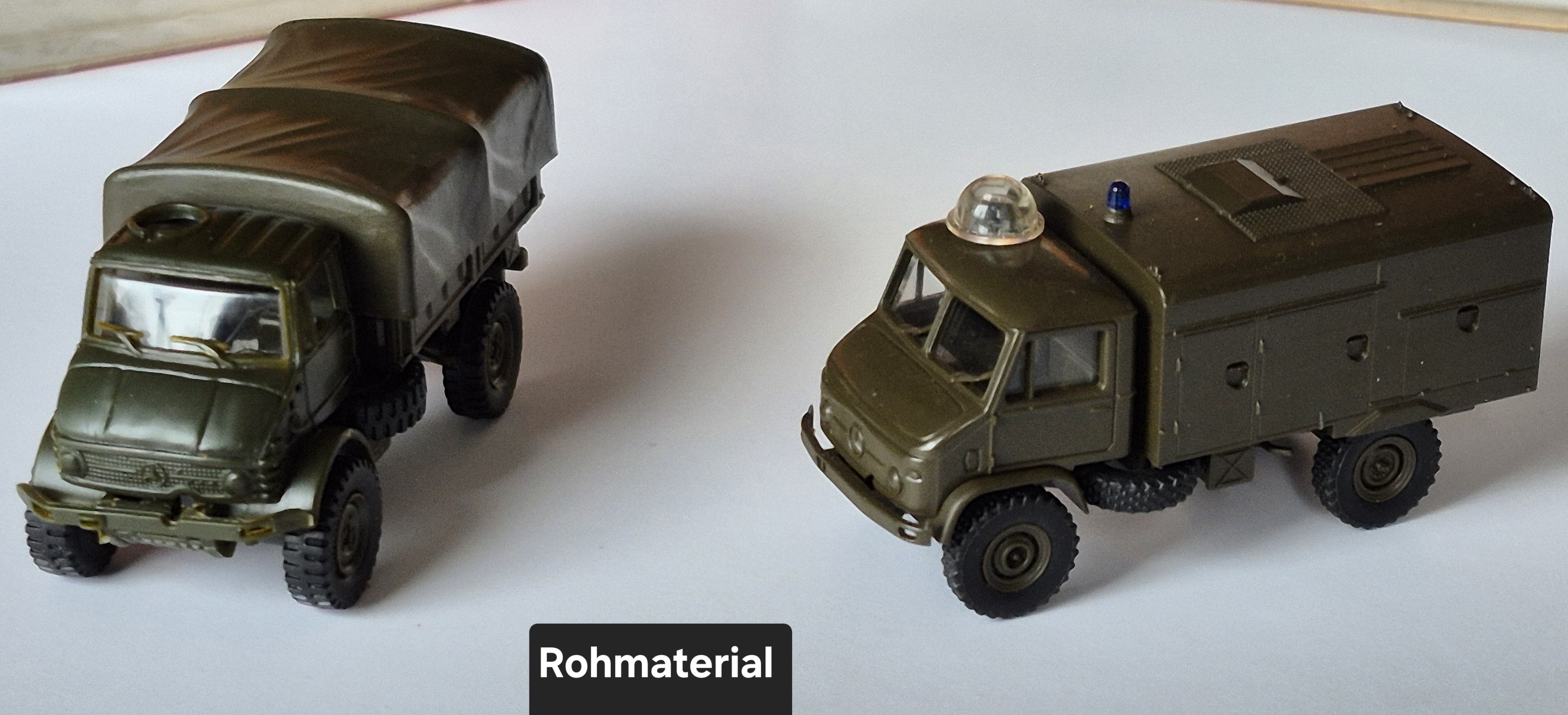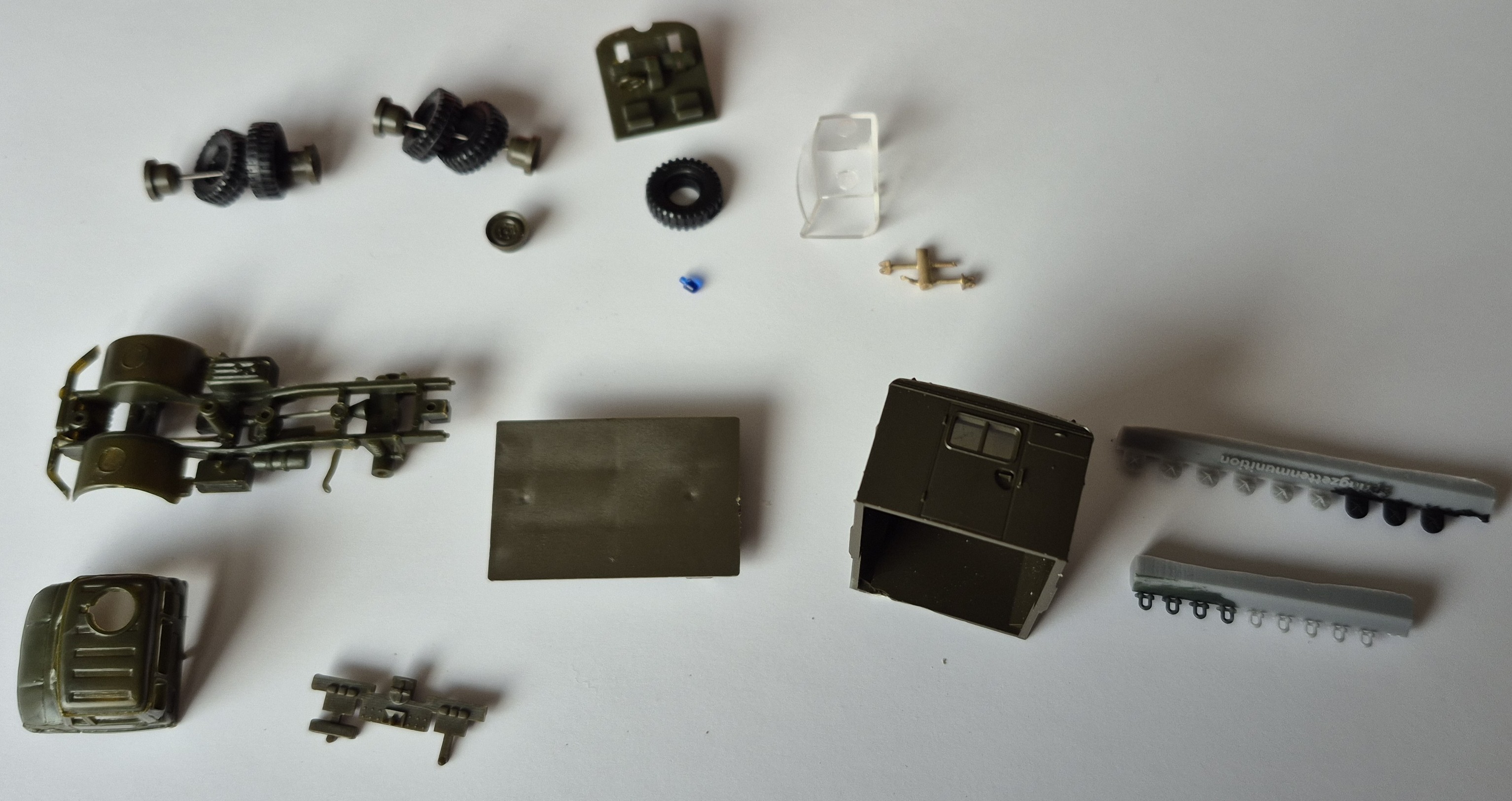 Da ich kein Feiermaier bin, habe ich mich ans Werk gemacht, sprich aus zweien einen. Änderungen gab es nur am Kofferaufbau, da mußte ein Stück anpassen, damit der auf das 416er- Fahrgestell paßt, das angespritzte Leitkreuz wurde entfernt. Am Fahrerhaus (das tatsächlich nicht so toll aussieht) wurde ein überflüssiges Loch so gut wie möglich zugespachtet und eine neue Kupplung und Schäkel angebracht. Während der neue Lack trocknet, kümmere ich mich um die Hecktraverse. Dann ist wieder Warten angesagt, sind noch Kleinteile von Remember und TruckMo unterwegs.