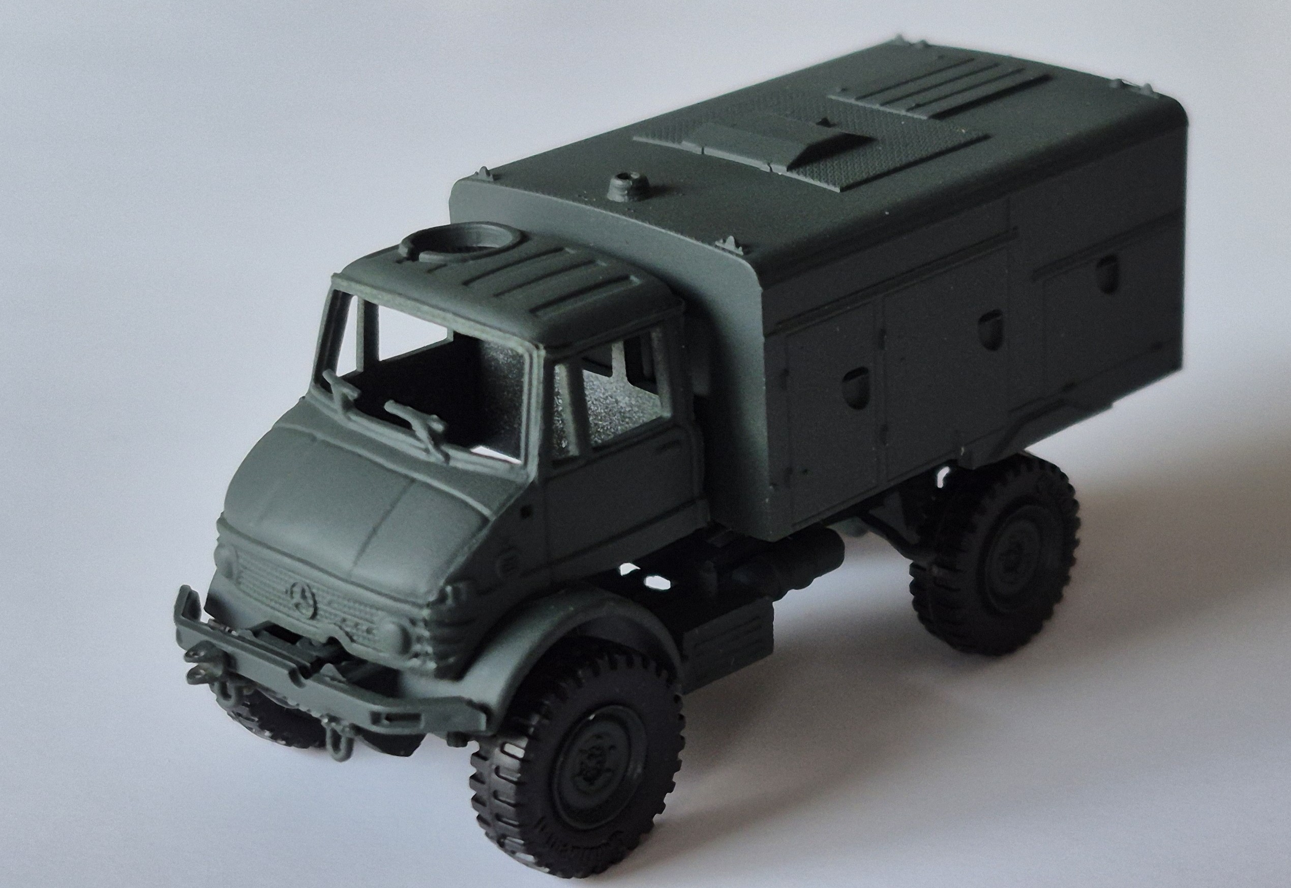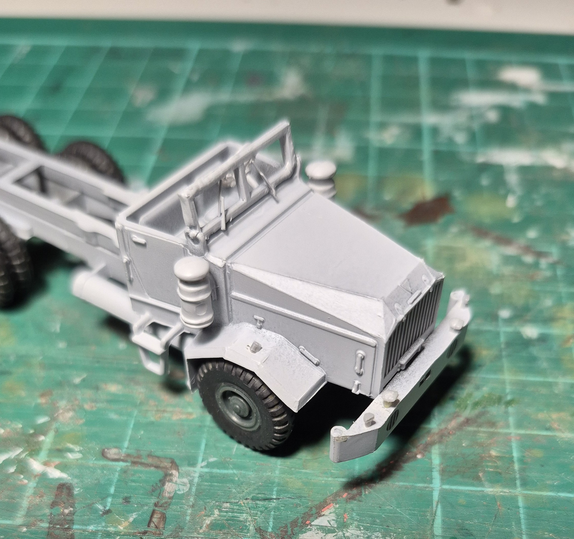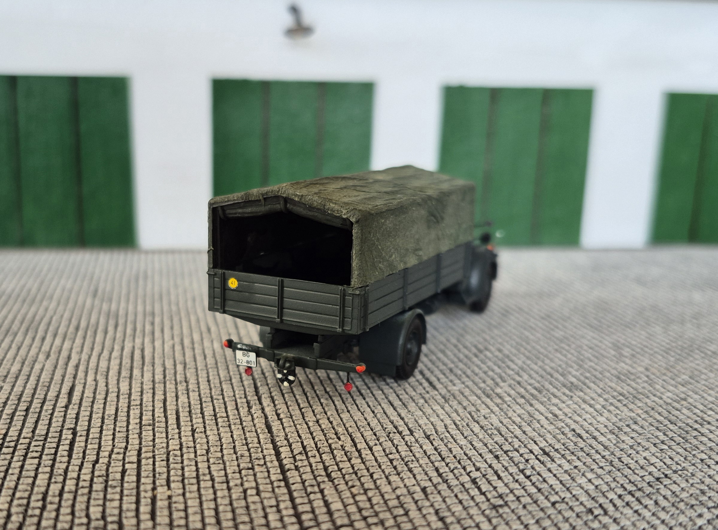 Da ich kein Feiermaier bin, habe ich mich ans Werk gemacht, sprich aus zweien einen. Änderungen gab es nur am Kofferaufbau, da mußte ein Stück anpassen, damit der auf das 416er- Fahrgestell paßt, das angespritzte Leitkreuz wurde entfernt. Am Fahrerhaus (das tatsächlich nicht so toll aussieht) wurde ein überflüssiges Loch so gut wie möglich zugespachtet und eine neue Kupplung und Schäkel angebracht. Während der neue Lack trocknet, kümmere ich mich um die Hecktraverse. Dann ist wieder Warten angesagt, sind noch Kleinteile von Remember und TruckMo unterwegs.