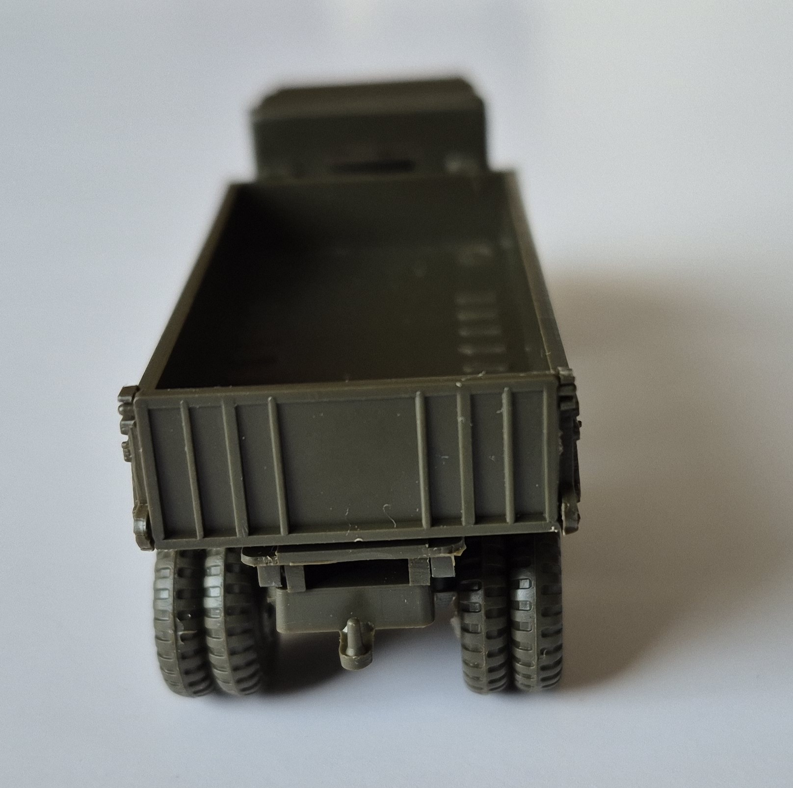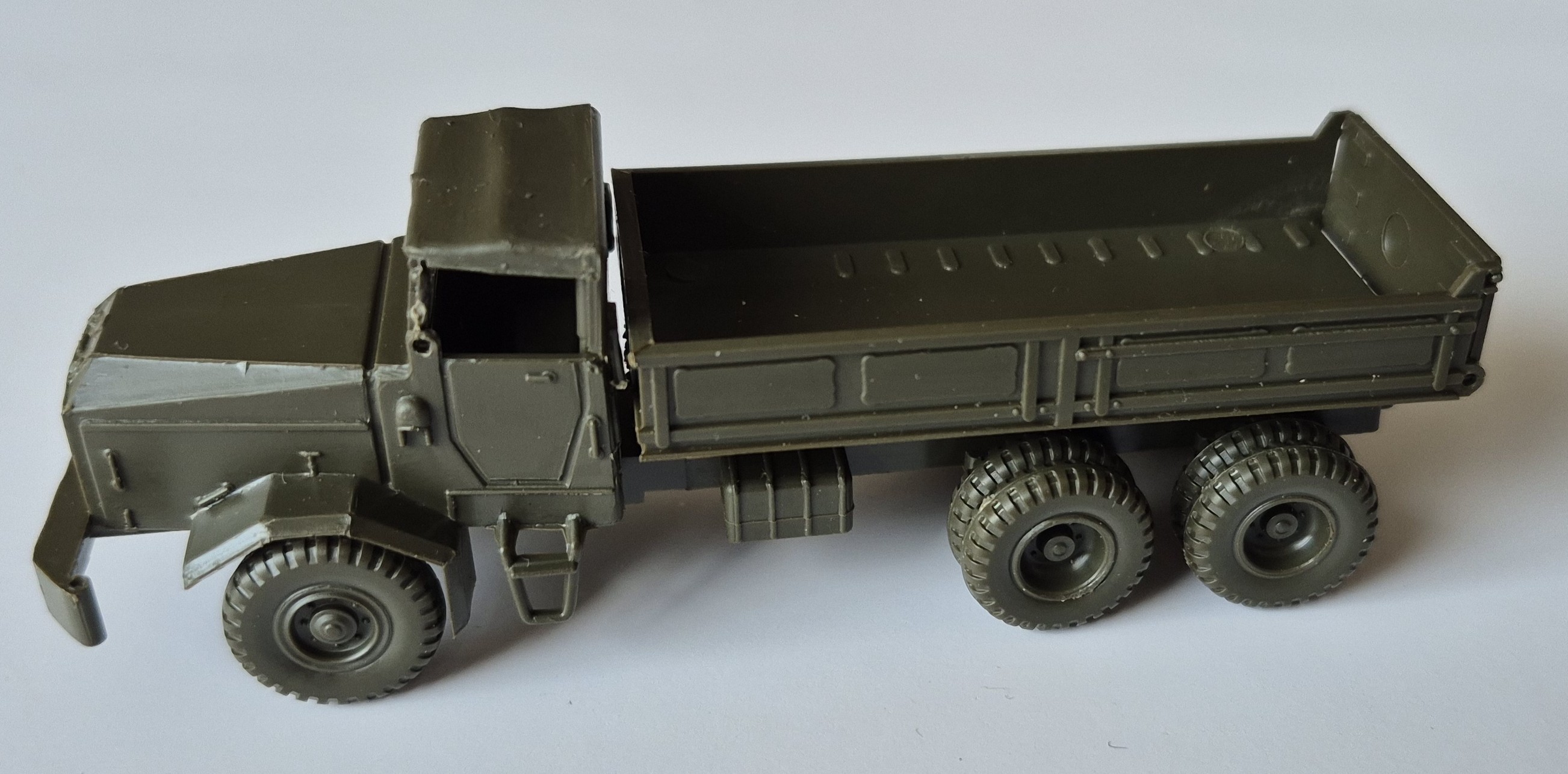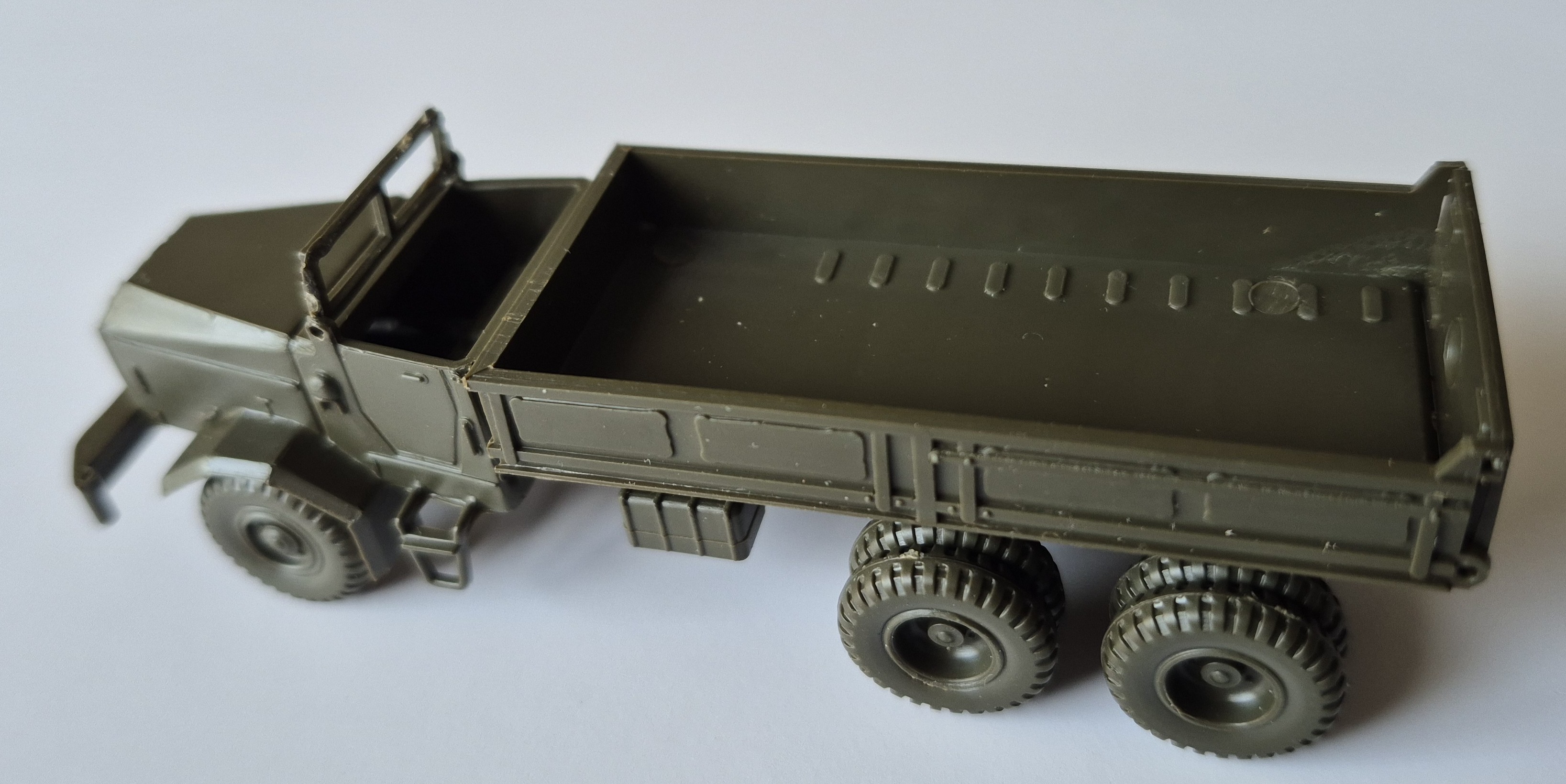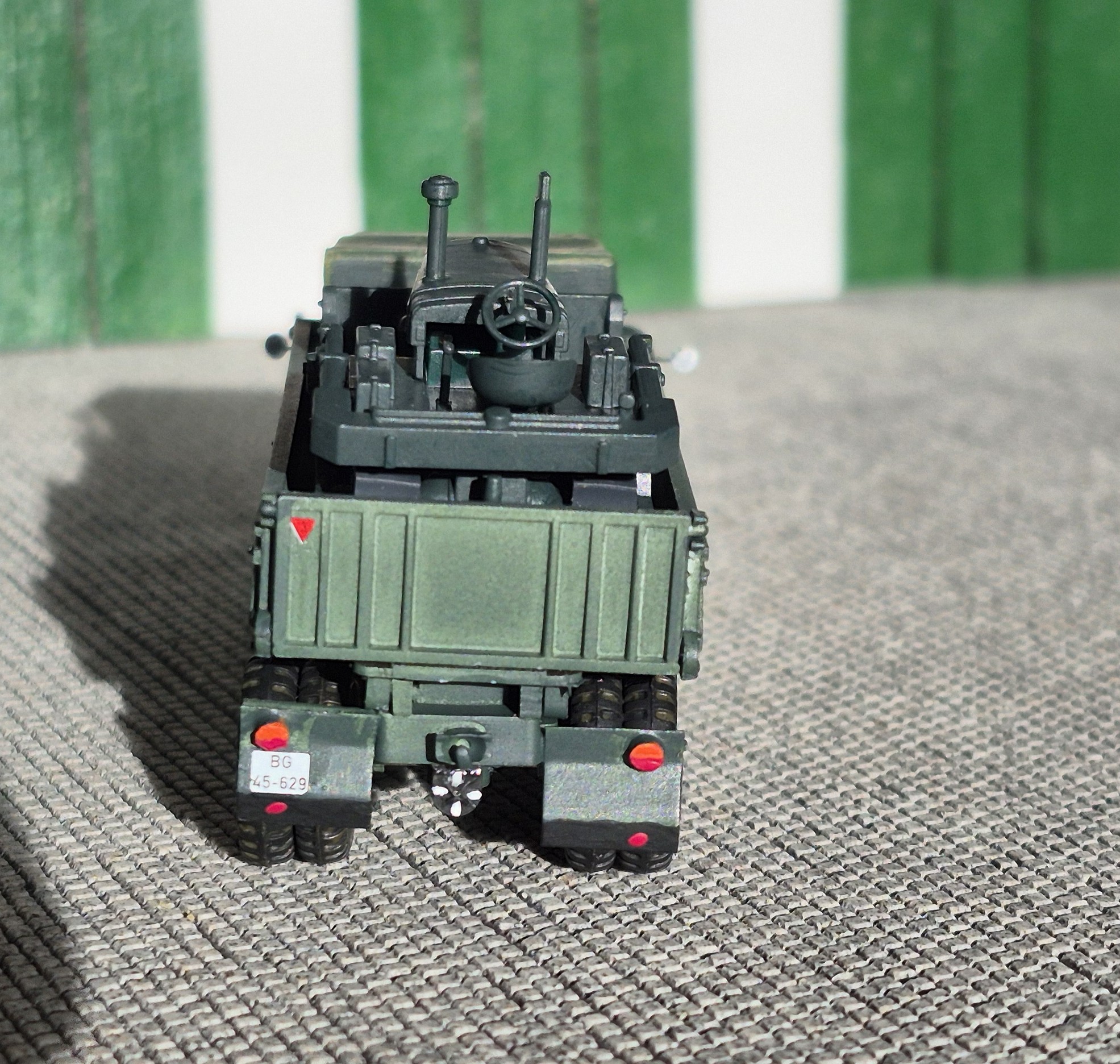 So, ich habe wieder fertig! Hat etwas gedauert, aber ich wollte unbedingt noch eine artgerechte Ladung besorgen. Habe gelesen, daß die Fahrzeuge bei der BW für den Transport von Planierraupen und Schüttgut verwendet wurden (Pioniere), dann wirds wohl bei Buschos auch nicht anders gewesen sein.
