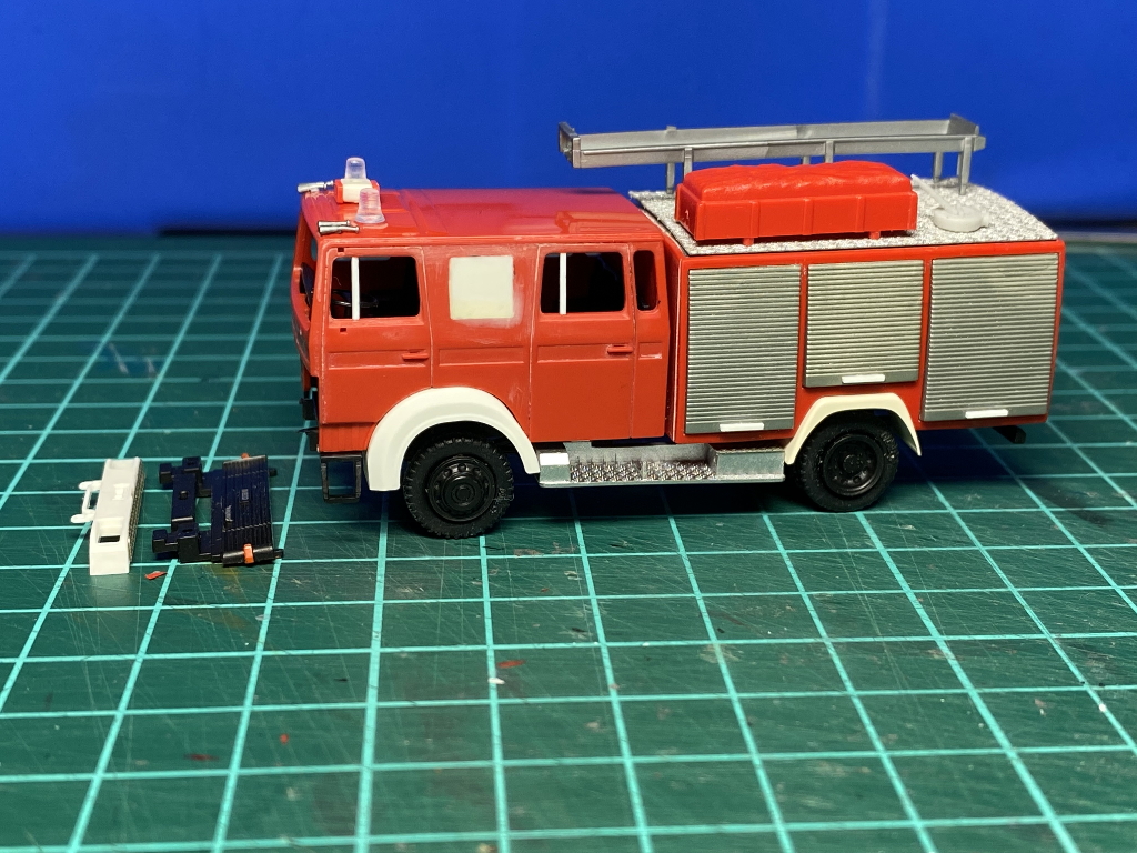 Erwähnenswert wären einzelne Teile aus meinem Teilesortiment, wie der 3D-Druck Wasserringmonitor von Martin-Nolte-Kleinserien MNK-87 sowie die vorderen Blaulichter, die einer alten Hella RKL nachempfunden sind und von Remeber! stammen.