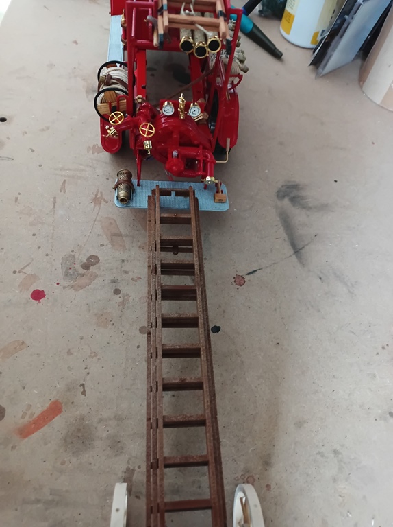 Um dem Fahrzeug noch etwas mehr Pepp zu verleihen. Überlege ich derzeit noch einen passenden Anhänger daran zu hängen. Wahrscheinlich wird es eine Anhängeleiter oder ein Leiternanhänger (Modell Schweiz). Hier gab es schon mal die ersten Stellproben. Die typisch englische fahrbare Holzleiter aus dem Bausatz möchte ich nicht nehmen, weil sie mir nicht gefällt.