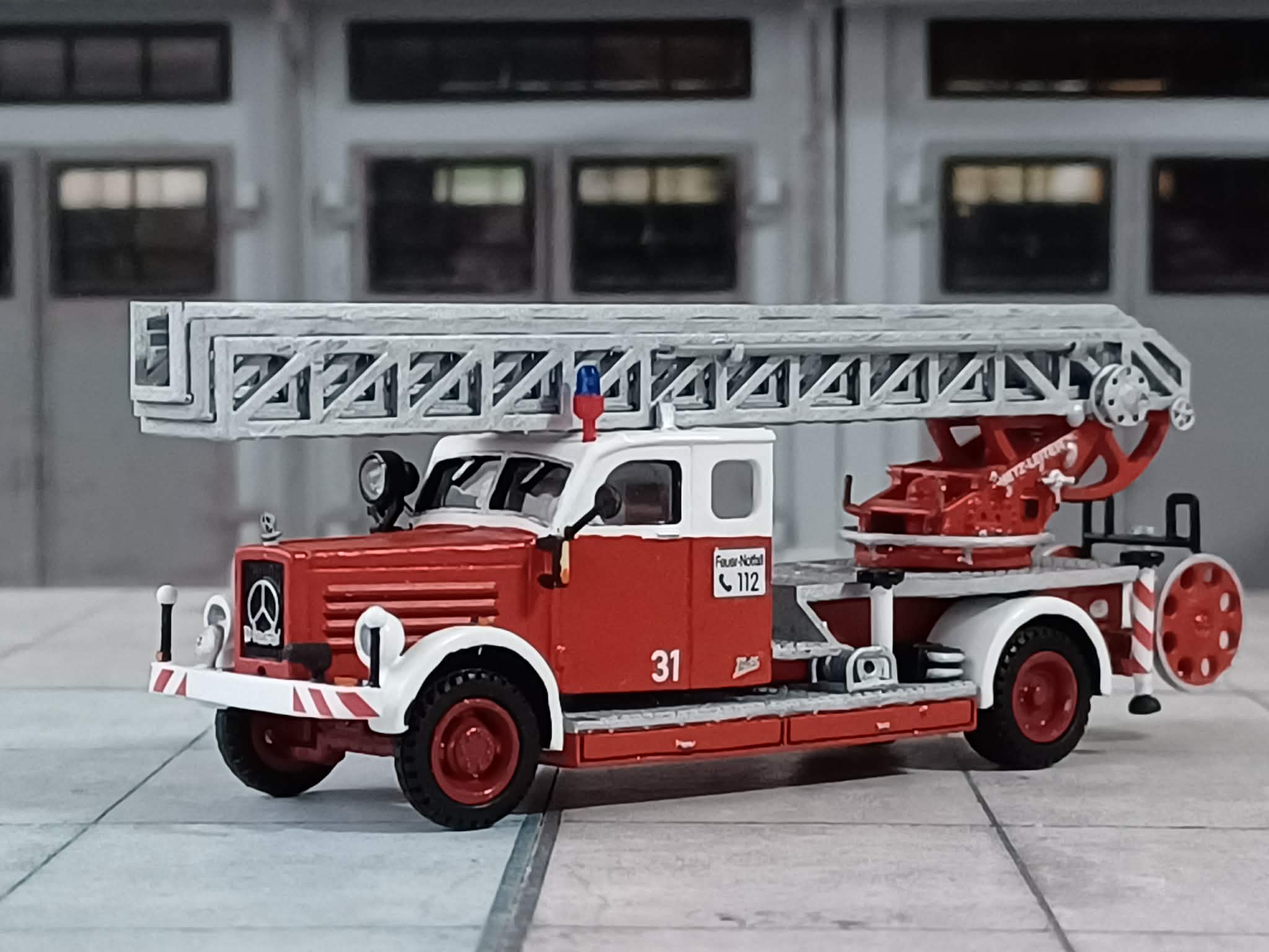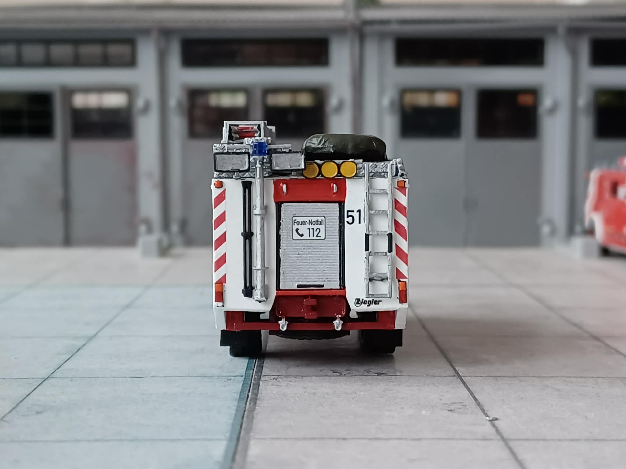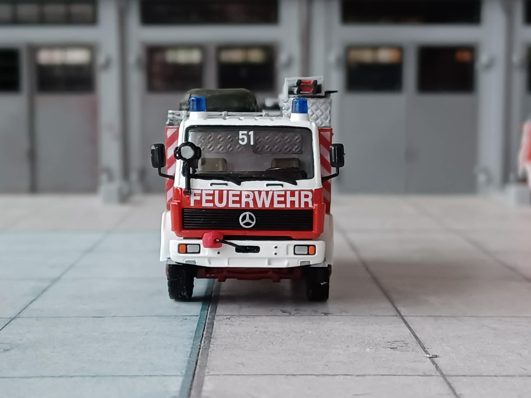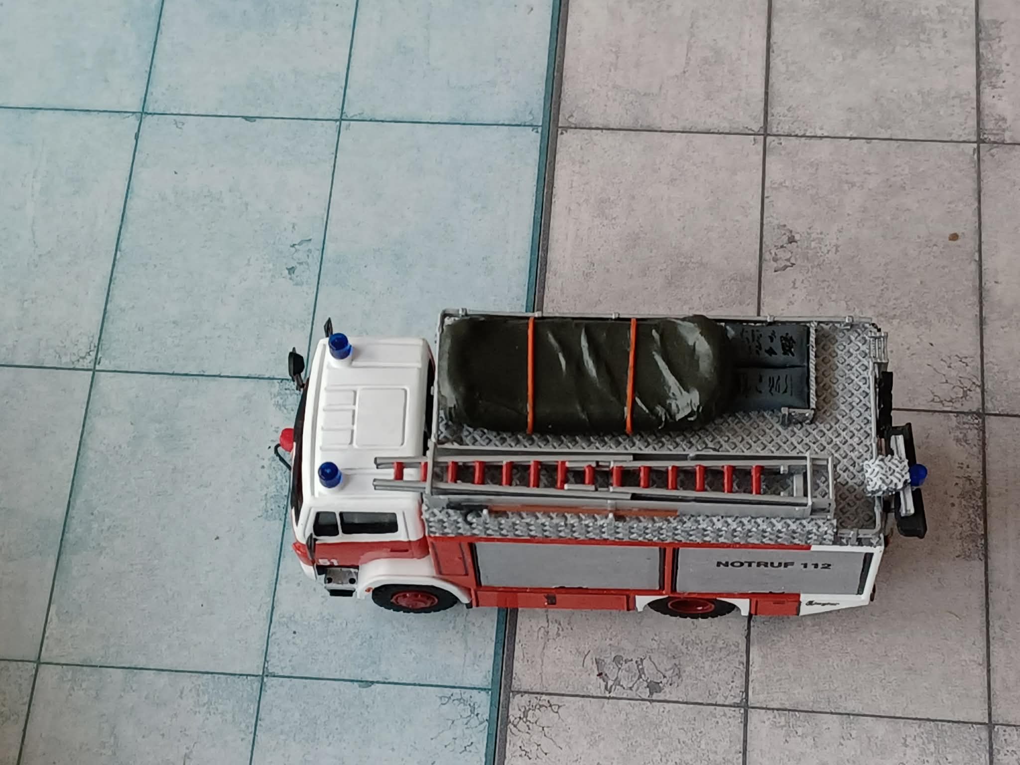Das Modell entstand aus einem Fahrgestell von Preiser, Aufbau (MK LF 16) und Kabine (GW Dekon) von Rietze sowie einigen Kleinteilen und Decals.