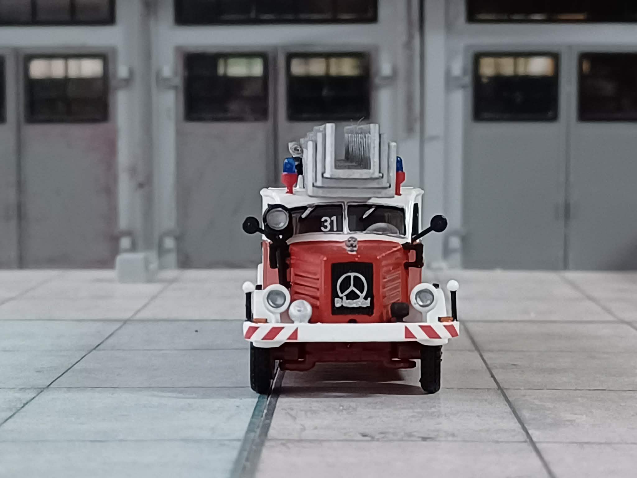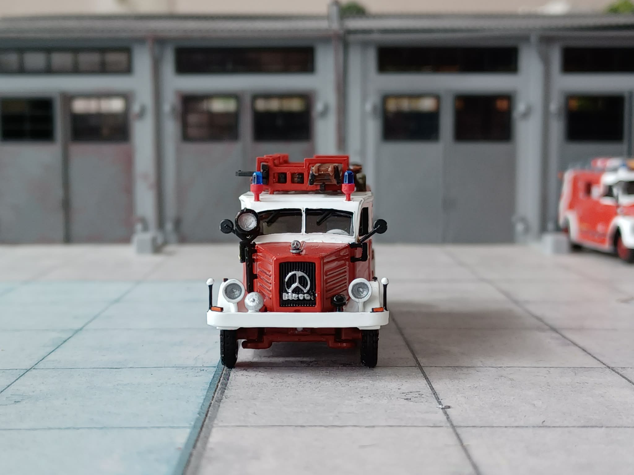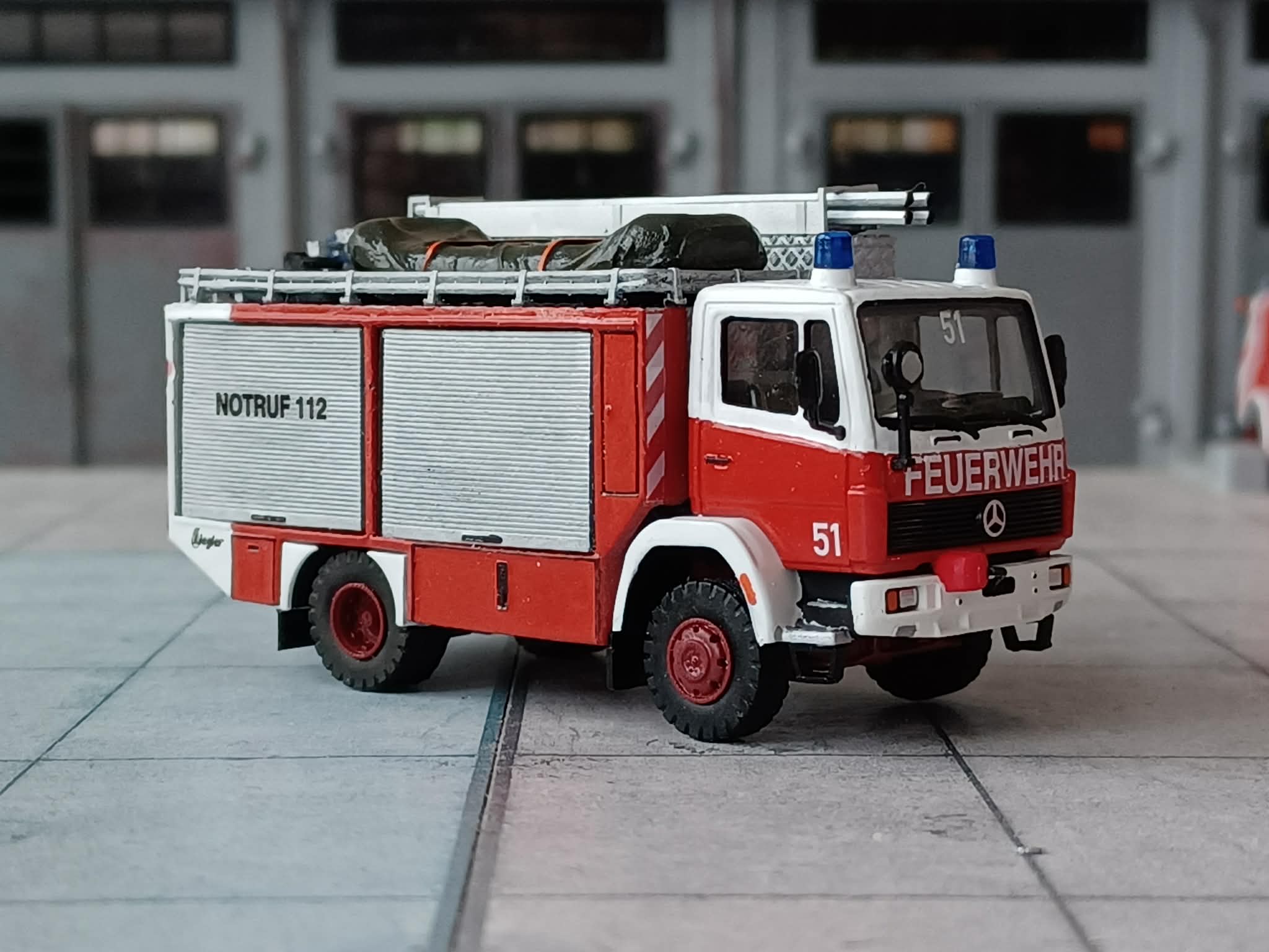 Das Modell entstand aus einem Fahrgestell von Preiser, Aufbau (MK LF 16) und Kabine (GW Dekon) von Rietze sowie einigen Kleinteilen und Decals.