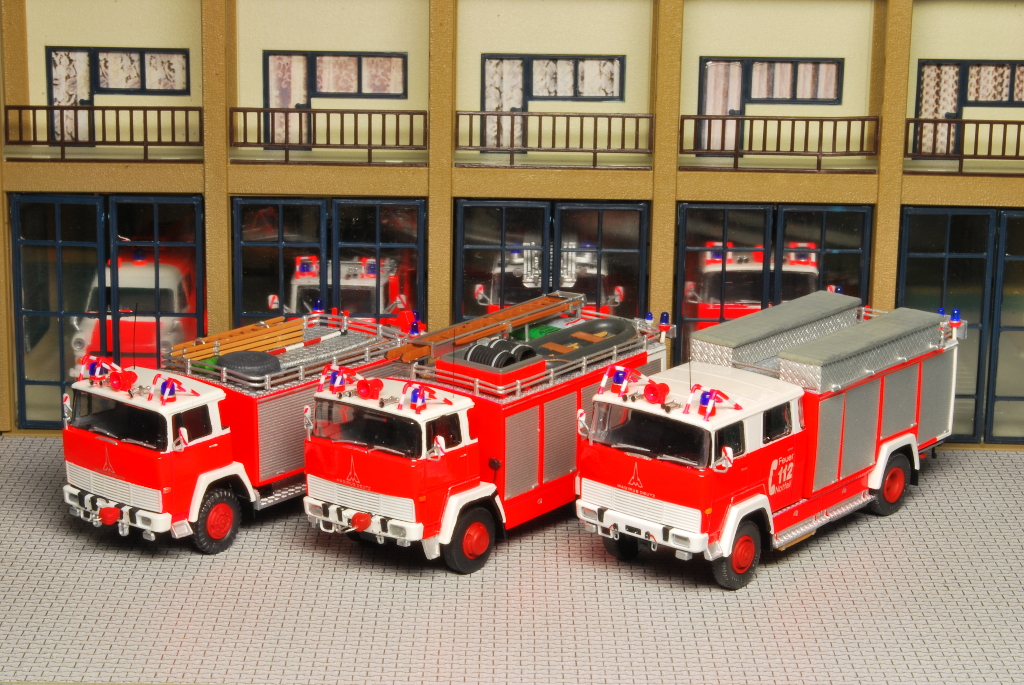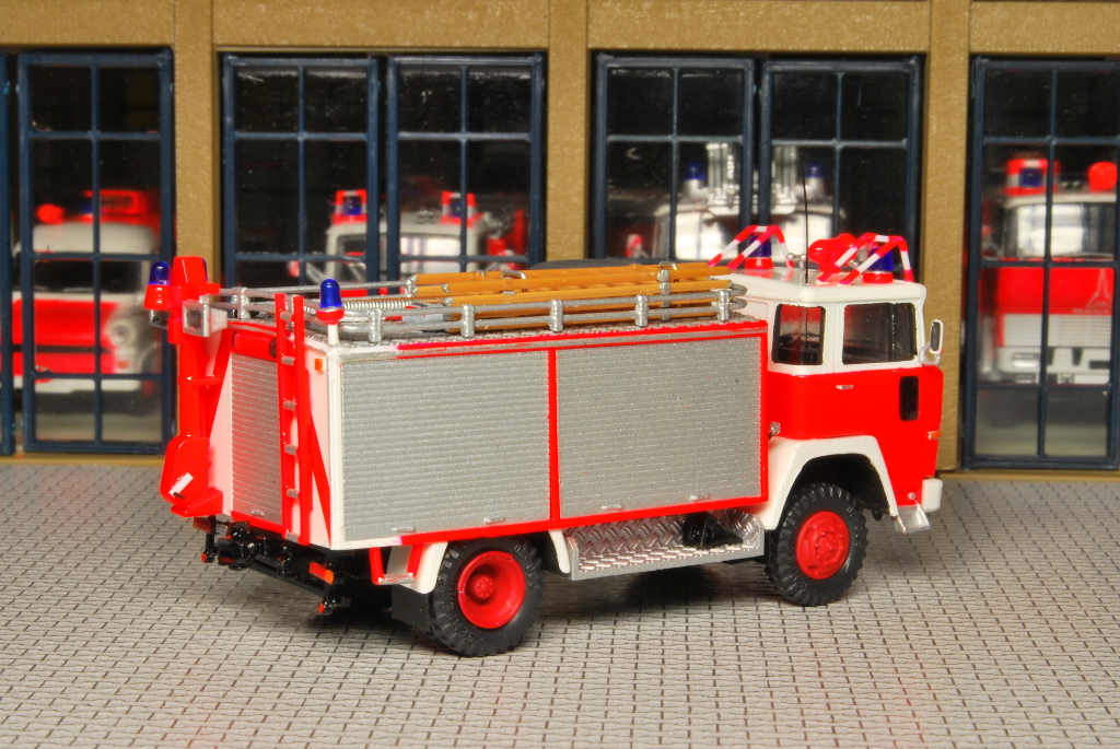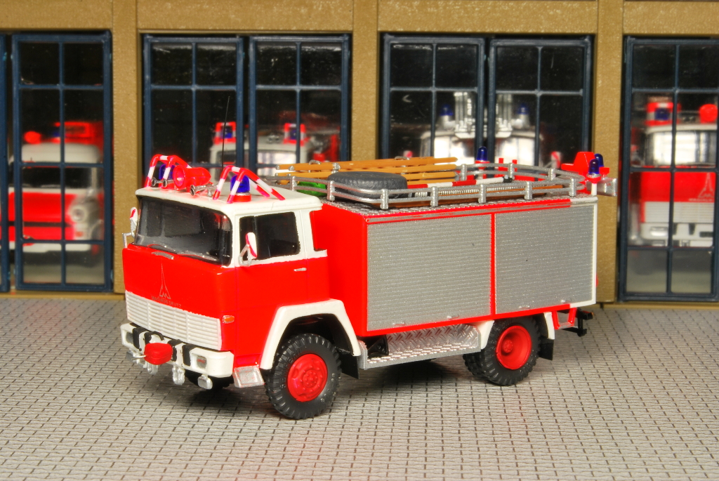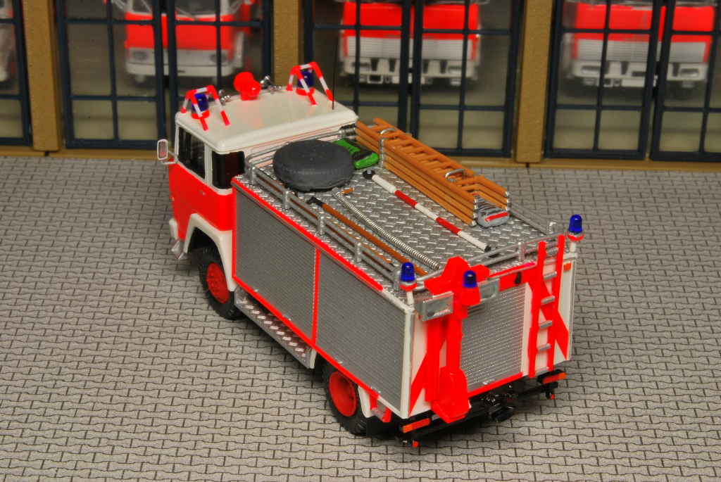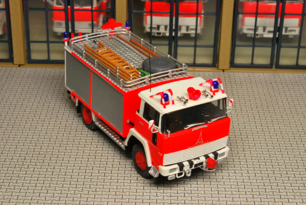 Beim Rüstwagen handelt es sich um ein Kleinserienmodell von Allgäu, das im großen und ganzen aus der Schachtel entstanden ist. Der RW fährt allerdings auf Roco Rädern zum Einsatz. Die beiliegende Dachbeladung, bestehend aus Dachkasten und Schlauchboot, habe ich nicht verbaut. Stattdessen lagern nun an dieser Stelle vier Steckleiterteile (Roco), eine Abschleppstange (Preiser), zwei Bindemittelsäcke (Minitanks + Decal von MBSK), ein in Tempo verpacktes Reserverad aus Bastelkiste, ein Abgasschlauch (Gitarrensaite + Evergreen), ein Einreißhaken (Bastelkiste) sowie ein Hebebaum (Eigenbau aus Evergreen und Messingdraht). Auf den beiden Trittbrettern lagern links und rechts die Windenkeile (Scale-Model-Team) für den Einsatz der Seilwinde (Preiser+Edelstahllitze).