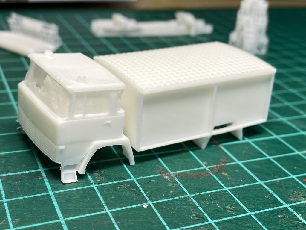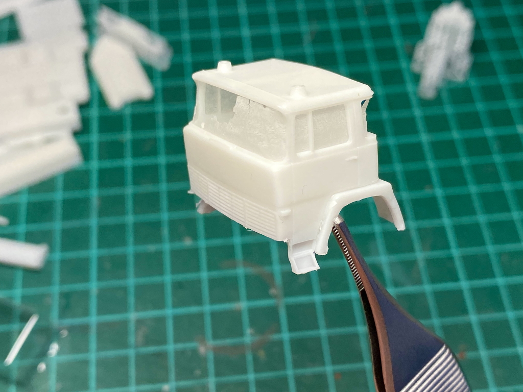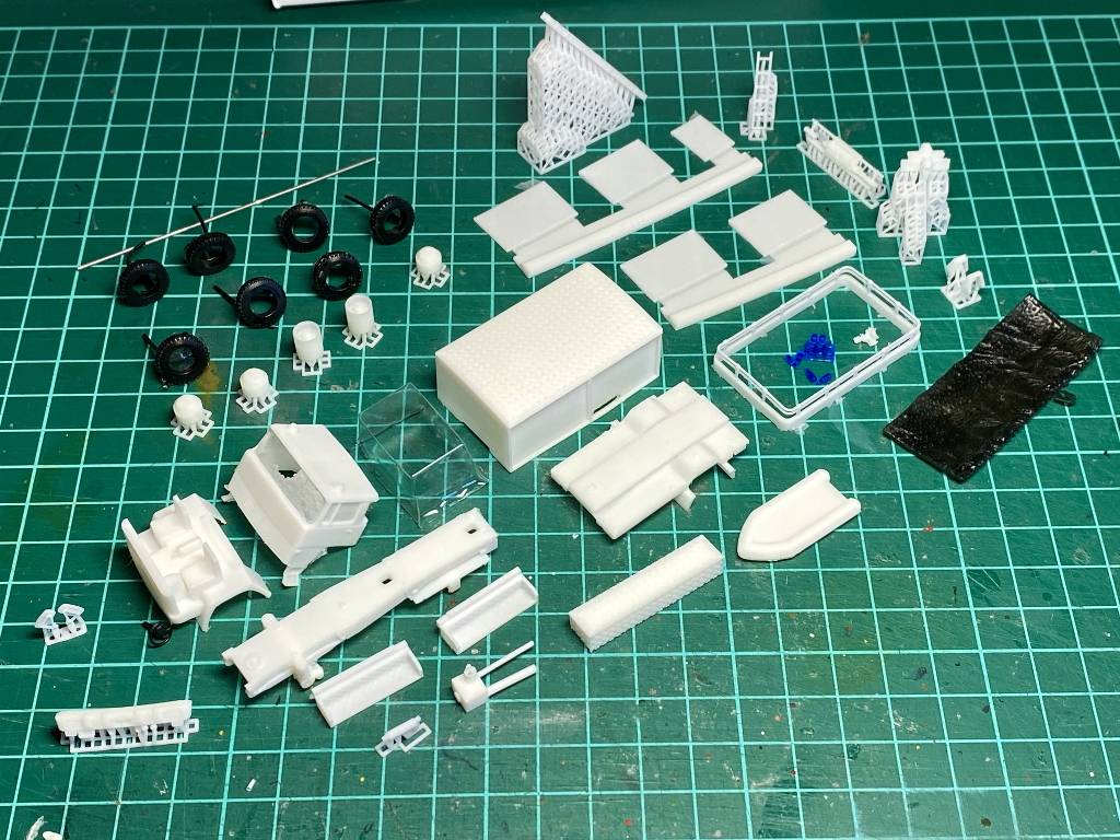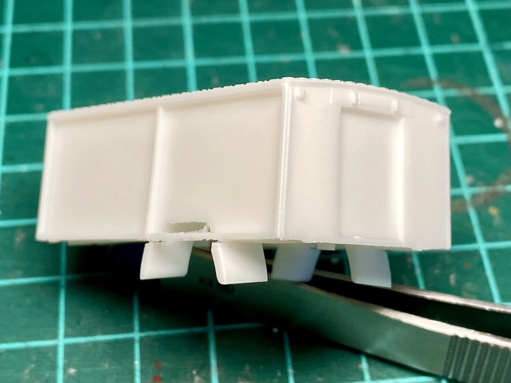 Beim Rüstwagen handelt es sich um ein Kleinserienmodell von Allgäu, das im großen und ganzen aus der Schachtel entstanden ist. Der RW fährt allerdings auf Roco Rädern zum Einsatz. Die beiliegende Dachbeladung, bestehend aus Dachkasten und Schlauchboot, habe ich nicht verbaut. Stattdessen lagern nun an dieser Stelle vier Steckleiterteile (Roco), eine Abschleppstange (Preiser), zwei Bindemittelsäcke (Minitanks + Decal von MBSK), ein in Tempo verpacktes Reserverad aus Bastelkiste, ein Abgasschlauch (Gitarrensaite + Evergreen), ein Einreißhaken (Bastelkiste) sowie ein Hebebaum (Eigenbau aus Evergreen und Messingdraht). Auf den beiden Trittbrettern lagern links und rechts die Windenkeile (Scale-Model-Team) für den Einsatz der Seilwinde (Preiser+Edelstahllitze).