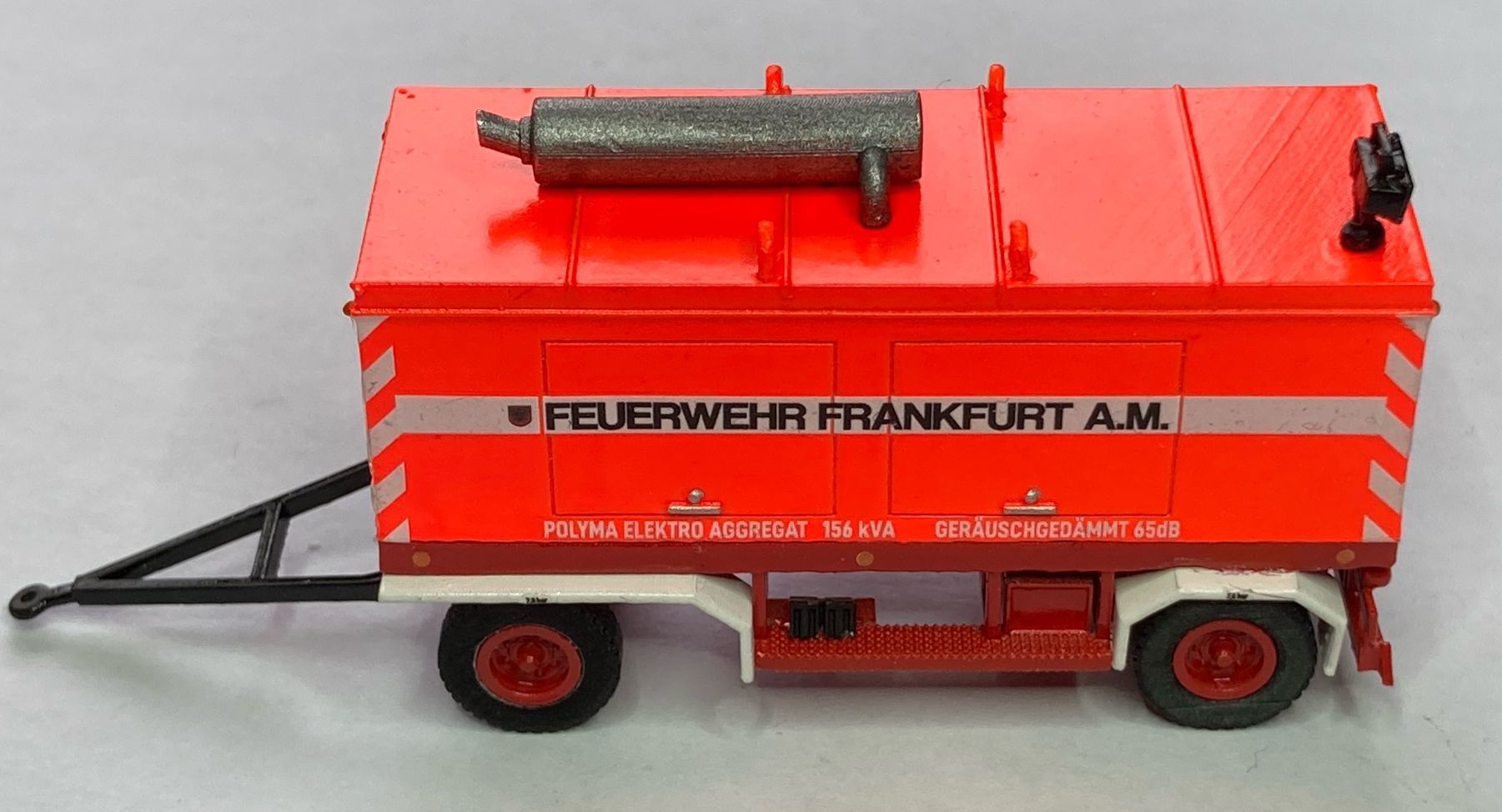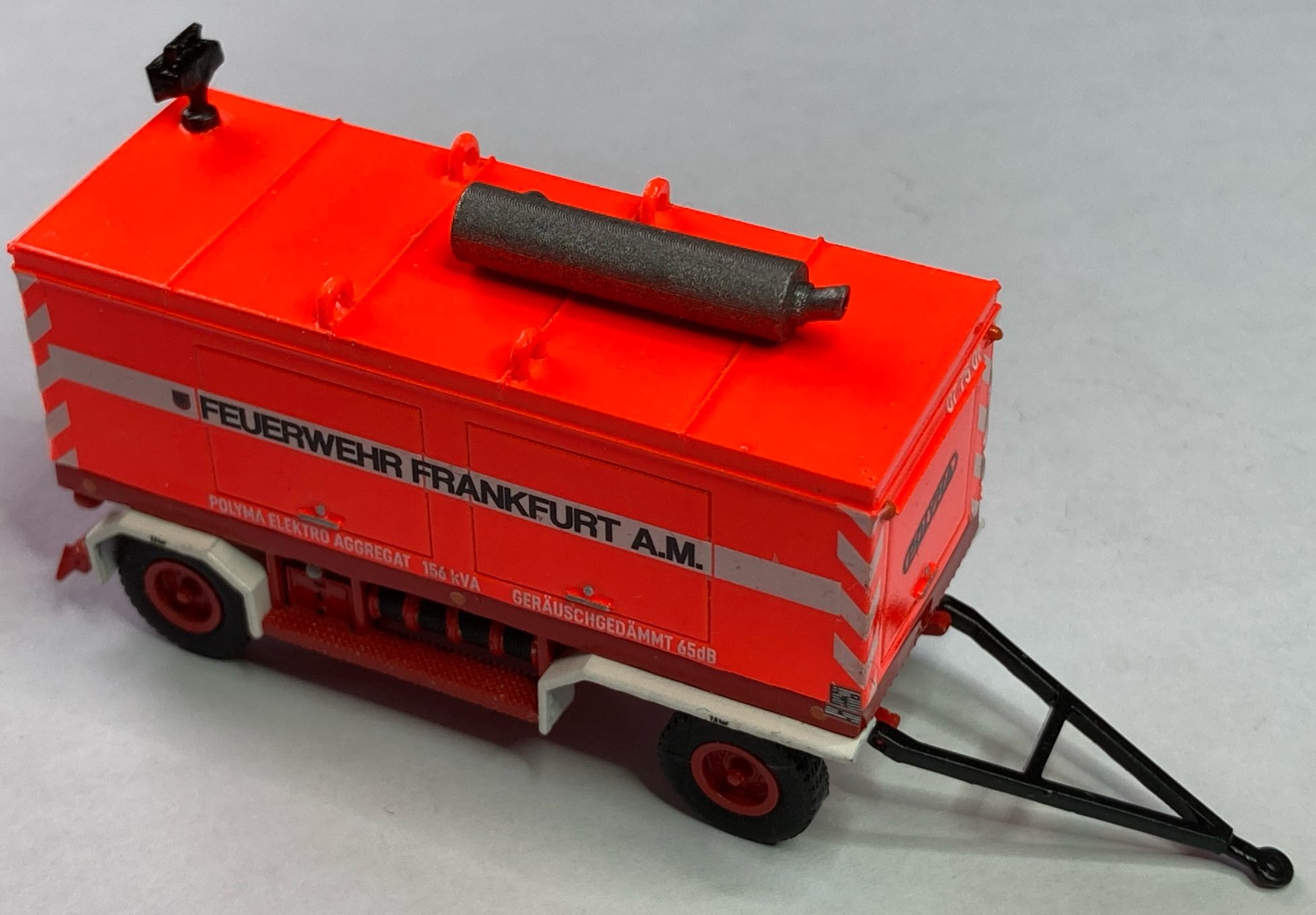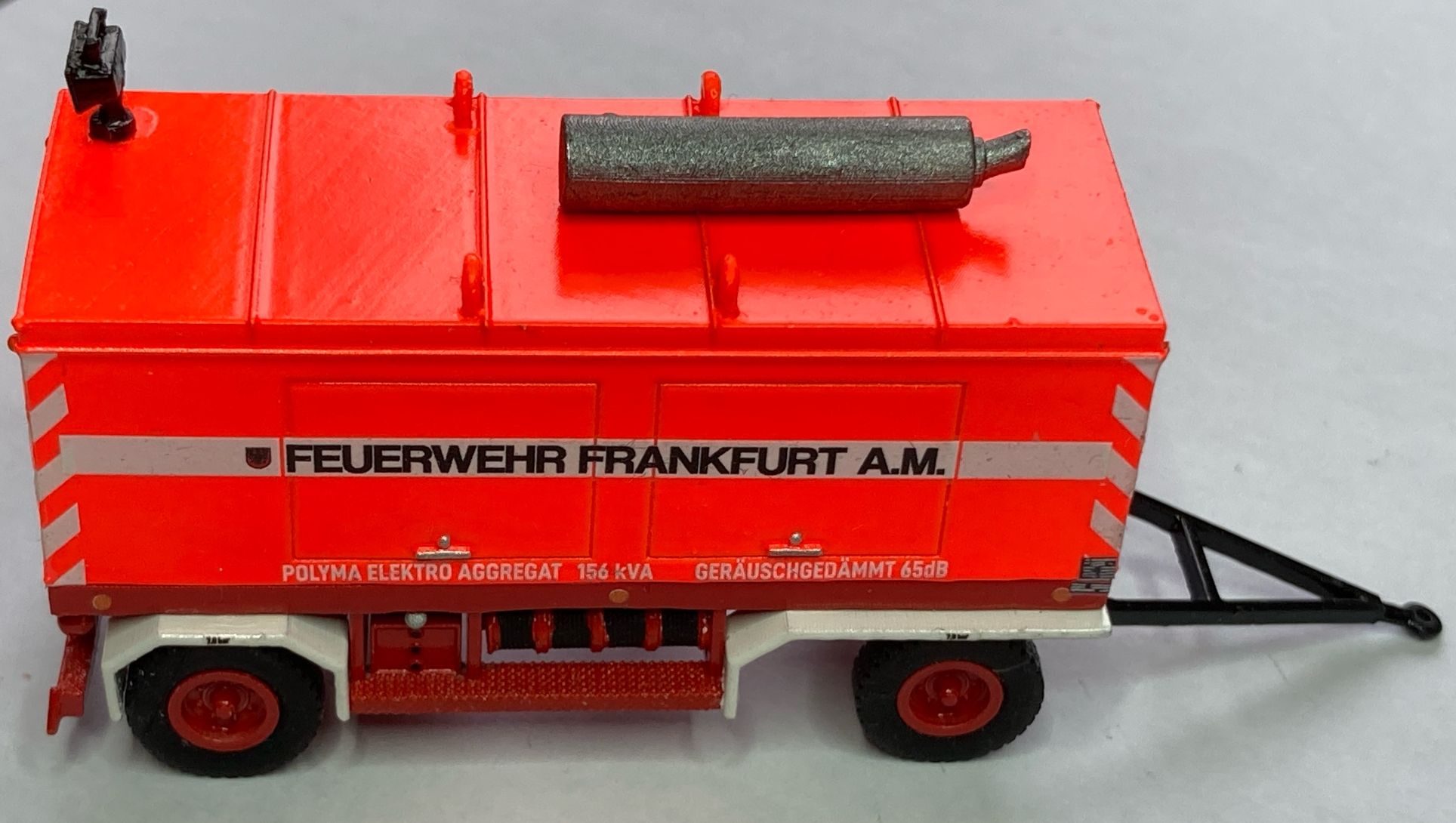 Nachdem hier im Forum schon eine sehr schöne Netzersatzanlage auf Basis des Mickon-Bausatzes präsentiert worden ist, möchte ich heute die Frankfurter Version vorstellen. Das Modell wurde fertig lackiert von mir zugekauft. Ergänzt habe ich die vier Ösen auf dem Dach (Wofür sind die eigentlich gedacht?), den Arbeitsscheinwerfer und das Typenschild. Kleine Anpassungen habe ich an den Kotflügeln vorgenommen, diese gerichtet und fixiert. Anbei einige Fotos, eines davon mit passendem Zugfahrzeug aus der damaligen Epoche.