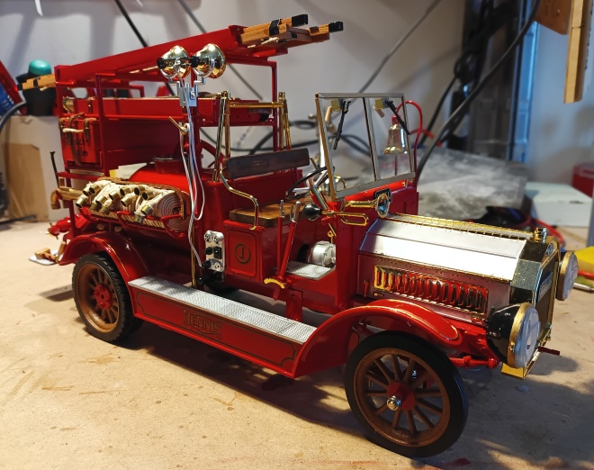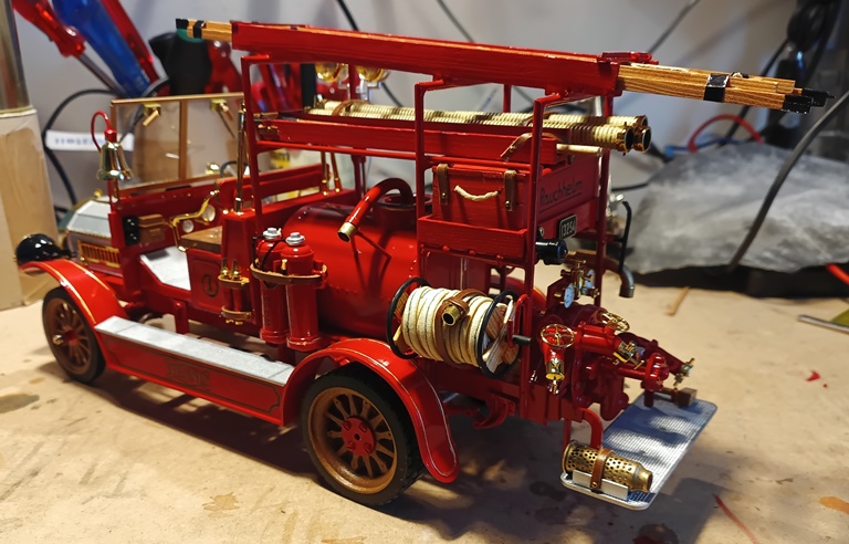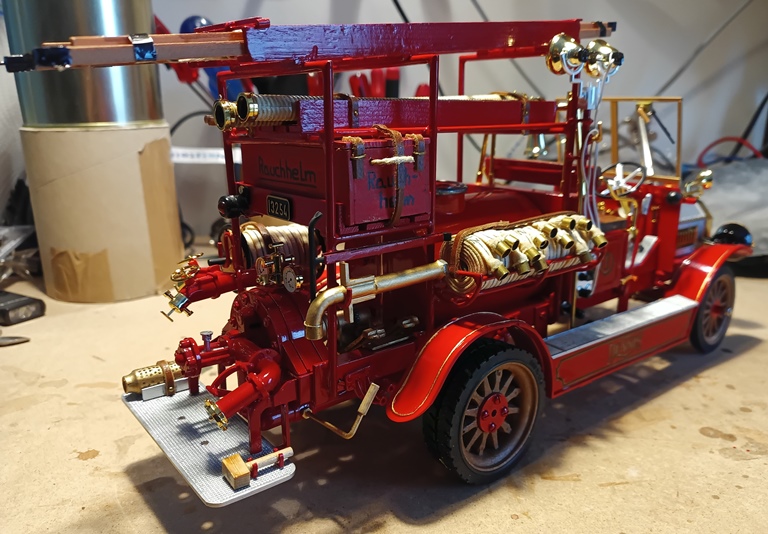 Um dem Fahrzeug noch etwas mehr Pepp zu verleihen. Überlege ich derzeit noch einen passenden Anhänger daran zu hängen. Wahrscheinlich wird es eine Anhängeleiter oder ein Leiternanhänger (Modell Schweiz). Hier gab es schon mal die ersten Stellproben. Die typisch englische fahrbare Holzleiter aus dem Bausatz möchte ich nicht nehmen, weil sie mir nicht gefällt.
