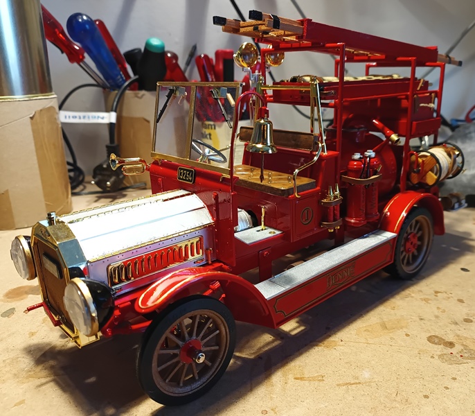 Der Dennis steht einsatzbereit auf dem Werktisch. Die Farbe ist noch nicht ganz trocken.