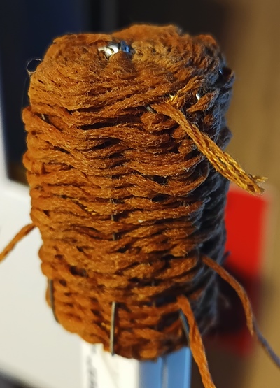 Ein erster Prototyp trocknet gerade, nachdem ich diesen mit verdünntem Holzleim zur Stabilisierung eingepinselt habe. Später muss noch etwas Farbe dran um die metallisch glänzenden Stabilisierungsdrähte zu kaschieren. Den oberen Abschluß werde ich mit Stoff darstellen. So grob wie auf dem Foto sieht die Flechtung in Realität allerdings nicht aus.
