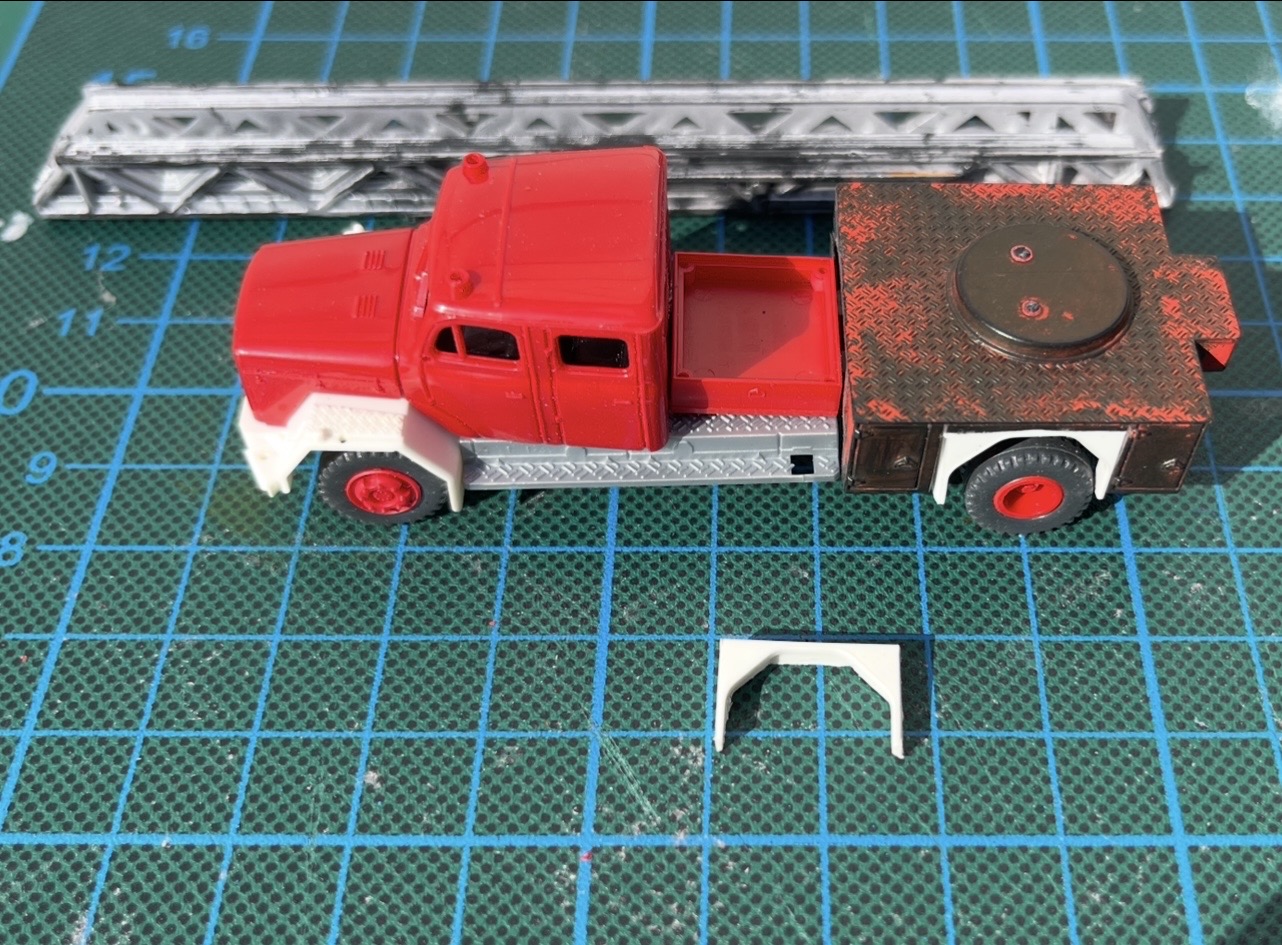 Während das Allrad-FG aus dem Preiser-Bausatz #1292 für die Frankfurt 4x2-Gelenkbühne deutlich zu hochbeinig ist, ist es für die DL 50 perfekt geeignet. Auch das Podium der 1:72-DL 30 passt in den Abmessungen recht gut für das (wesentlich breitere!) Podium der DL 50, sodass ich begonnen habe, die eckigen Roco-Radausschnitte darin einzuarbeiten. Der Rest des Podiums wird bei Gelegenheit im EIgenbau entstehen.