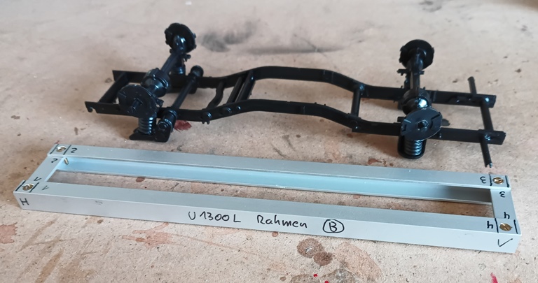 Der neue Rahmen ist fertig Einzelteile der Lenkachse inklusiv der Befestigung am Rahmen Nach der Montage des Vorderachse konnte die genaue Position des Bauteils für den Kabinenboden festgelegt werden. Der Kabinenboden wurde mit passgenauen Abstandklötzchen befestigt, was auch bei den Grundplatten der Aufbauten so erfolgen soll.