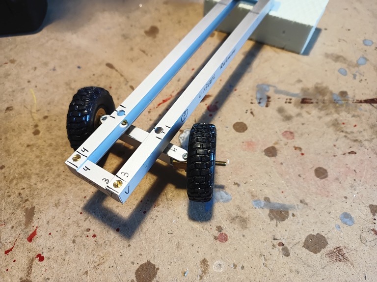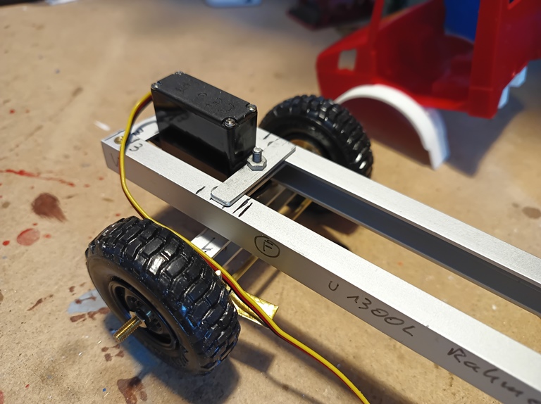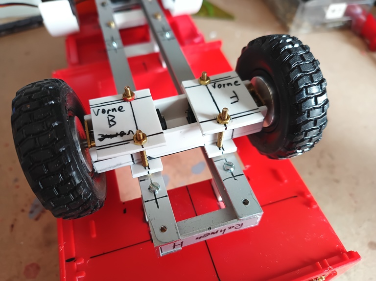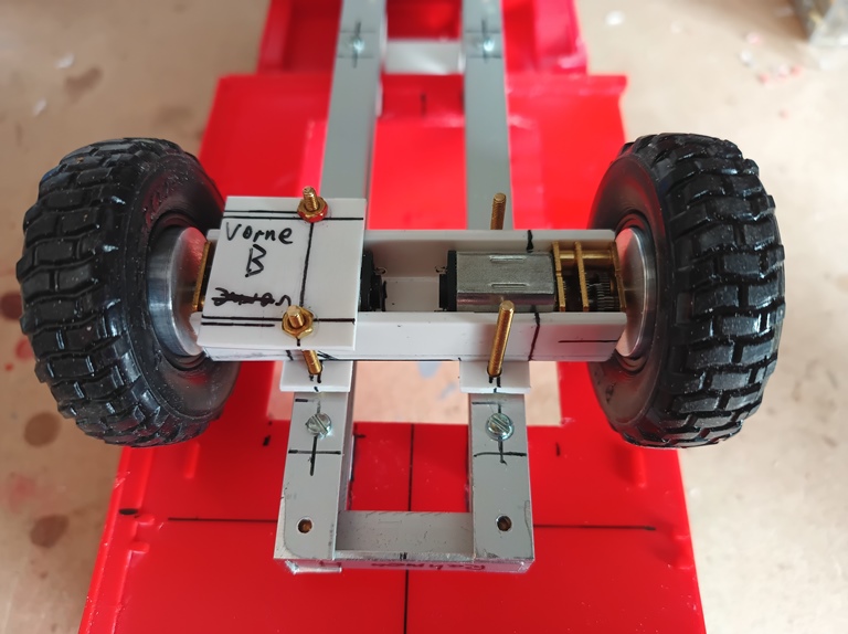 Ebenso ist der Antrieb für die Lenkung eingebaut. Auch die Grundplatten der beiden verschiedenen Aufbauten sind bereits mit dem Rahmen verbohrt und die notwendigen Gewinde zur Befestigung in die Abstandsklötzchen eingeschnitten. Hier eine der beiden Aufbauvarianten als RW 1. Jetzt heißt es erst einmal auf die bestellten Antriebsmotoren warten.