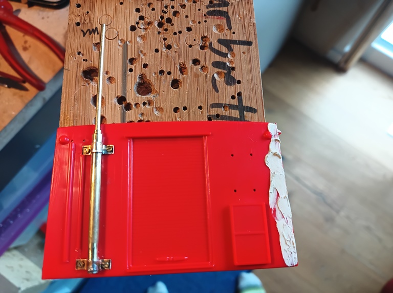 Nachdem die Antriebsmotoren eingetroffen waren konnte ich an die Konstruktion der Hinterachse gehen. Entstanden ist eine Version, die sich in der Breite recht frei skalieren lässt. Nur bei viel schmäleren Fahrzeugen muss ich mir etwas Neues einfallen lassen, da würden sonst die Motoren aneinanderstoßen. Eventuell könnte ich auch auf dünneres Material umsteigen. Hier ist noch 2mm Polystyrol verarbeitet. Auch die Auswechselbarkeit der Dachplatten auf der Kabine ist fertig. Unter das Kabinendach wurde ein dünner magnetischer Blechstreifen geklebt. Die Dachplatten selbst erhielten je 3 kleine 3mm Magnet2. Da ein RC- Modell ohne Sonderfunktionen schnell langweilig wird habe ich mir etwas einfallen lassen. Der Aufbau des RW1 erhält einen ausfahrbaren Lichtmast verpasst. Die Bausatzteile können hierzu nicht verwendet werden. Aus Messingröhrchen habe ich einen neuen Lichtmast gebaut. Das