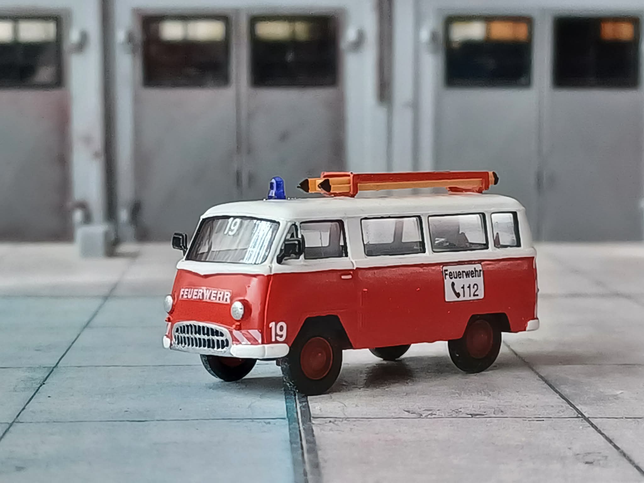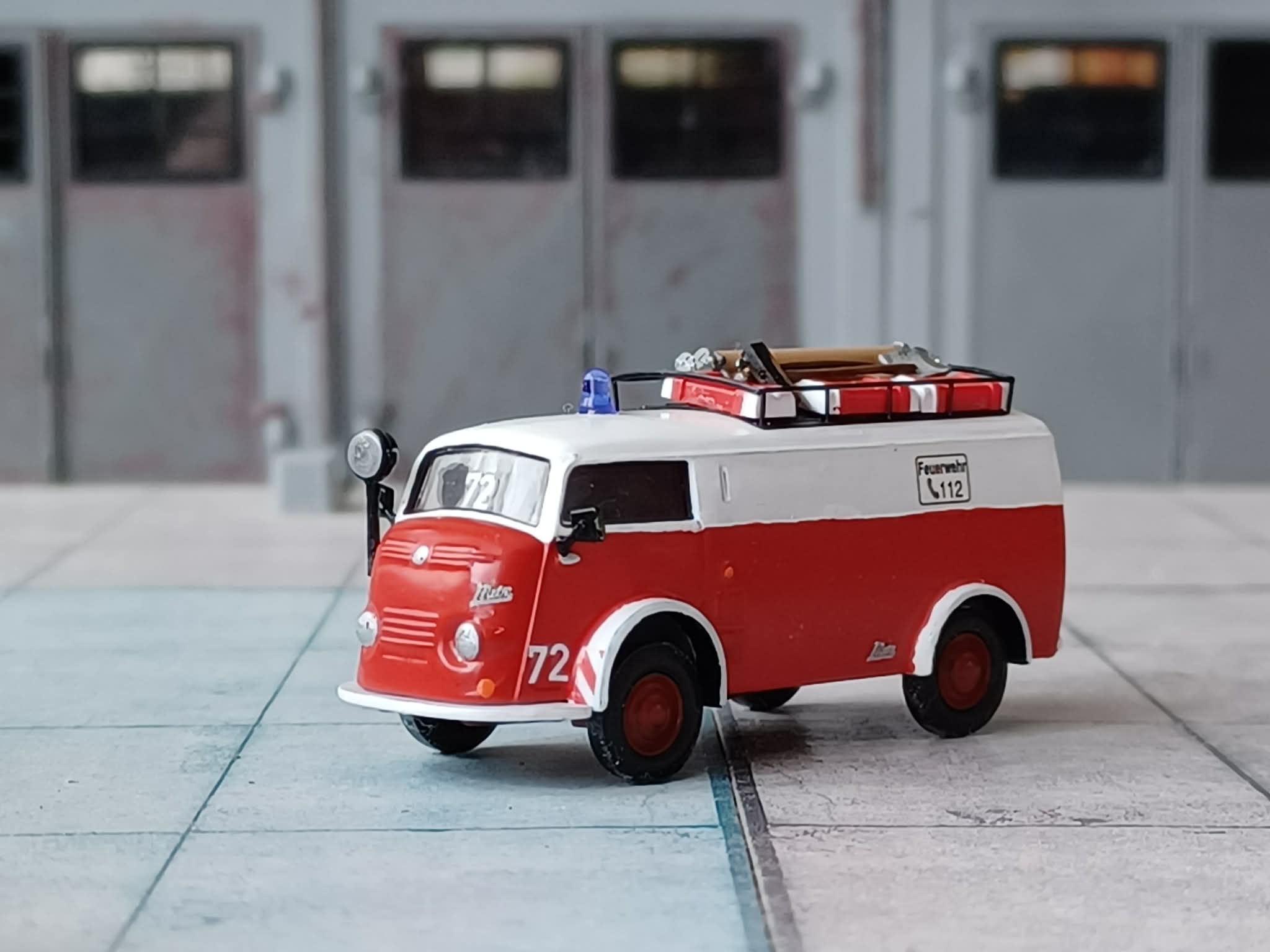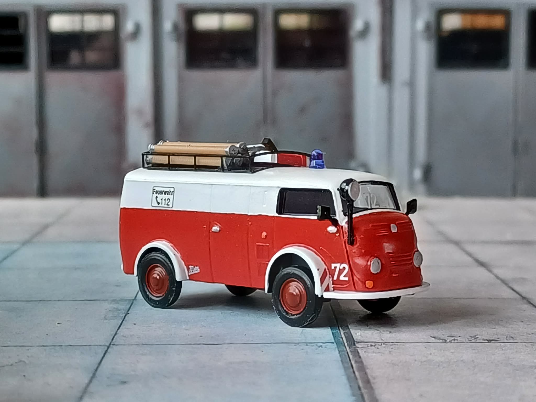 1955 beschaffte die gleiche Wehr einen Mannschaftstransportwagen. Hier wurde es ein Tempo Wiking. Das Fahrzeug transportiere die Steckleiter und Kleingeräte. Auch dieses ist bei dem Kameraden bis heute erhalten. Das Modell ist von Epoche und wurde zerlegt, lackiert und mit Kleinteilen und Decals versehen.