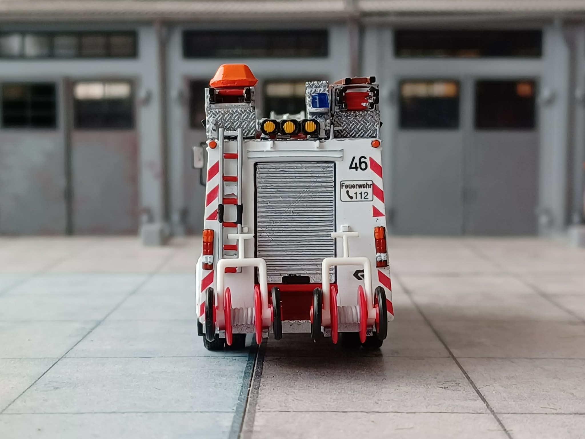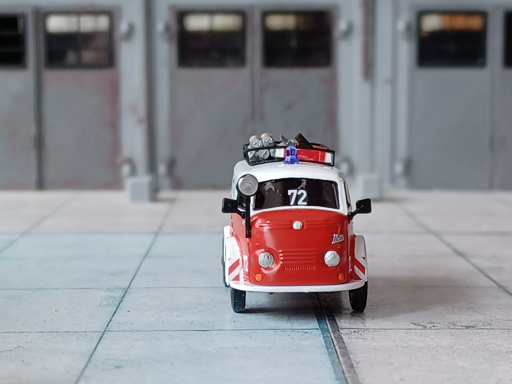 1945 wurde aus den Beständen der Feuerschutzpolizei ein Lastkraftwagen übernommen und in den Werkstätten umlackiert. Aufgebaut auf meinem Mercedes-Benz L3000 ist dieser noch bis Mitte der 60er Jahre gefahren und dann verkauft worden. Meist wurde das Fahrzeug zum Transport von Brennstoffen oder sonstigen Materialien benutzt und war fast nie auf Einsatzfahren zu sehen. Bemerkenswert ist auch das die ursprünglichen blauen Blinkleuchten nie getauscht wurden. Das Modell entstand aus einem 3D Druck Bausatz von Tim Voges sowie einigen Kleinteilen und Decals