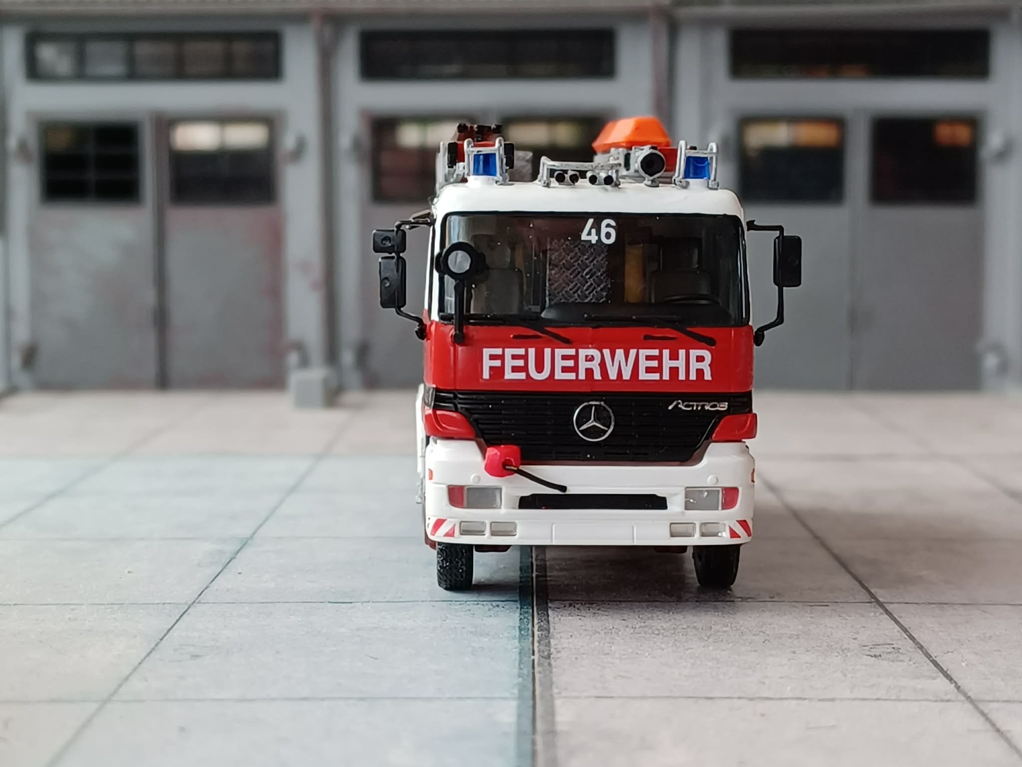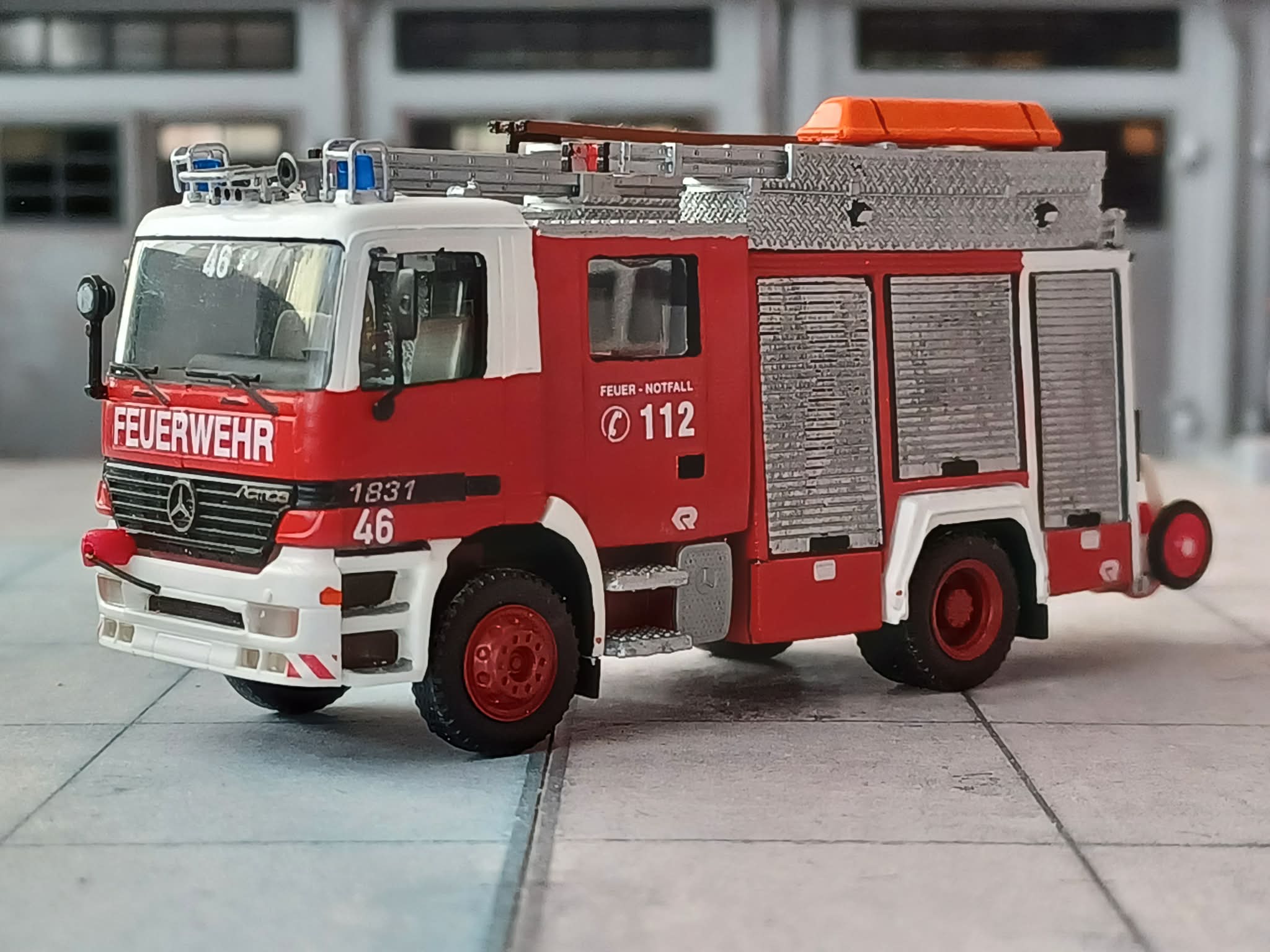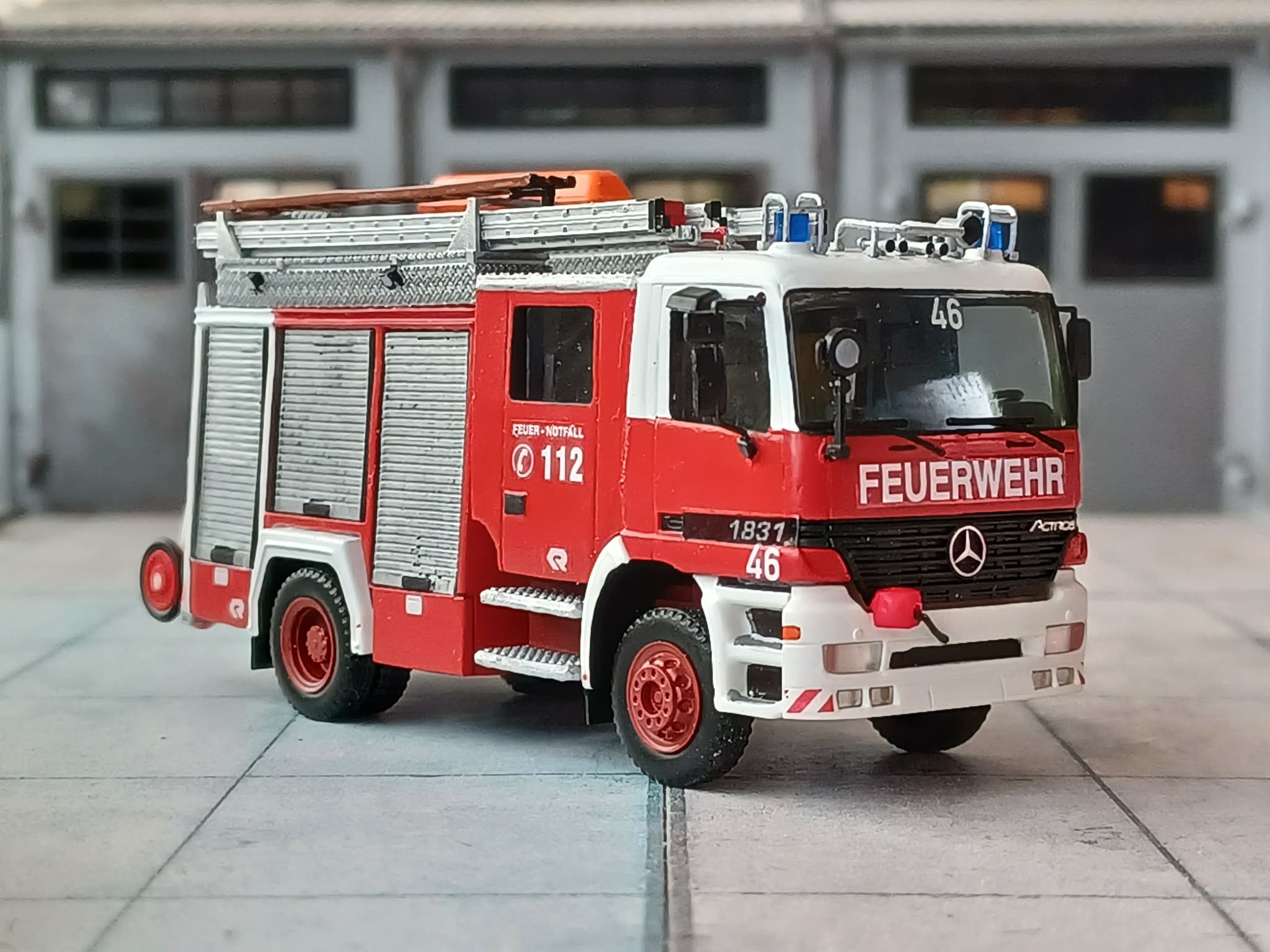 1996 beschafffte man auf dem damals neu erschienenen Mercedes-Benz Actros MP1 ein Hilfeleistungslöschfahrzeug HLF 16/24, Aufbau Rosenbauer. Das Fahrzeug ist heute noch im Reservebestand vorhanden und wird vorzugsweise zur Ausbildung der Jugendfeuerwehr genutzt. Das Modell entstand aus dem Umbausatz von Niklas Bürger, Fahrgestell und Kabine von Herpa. Dazu ein paar Kleinteile und Decals.
