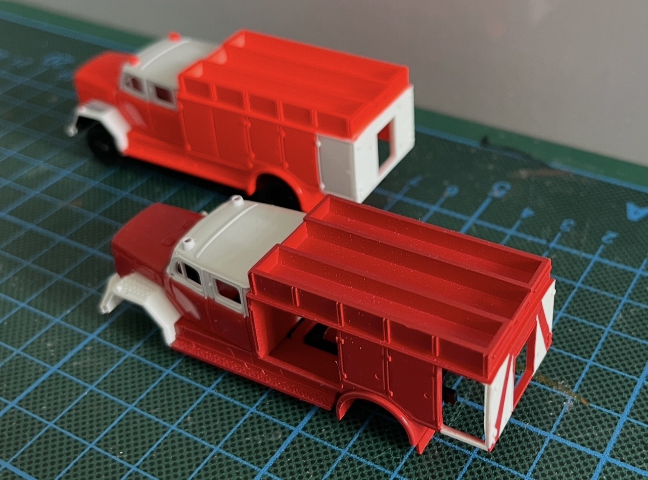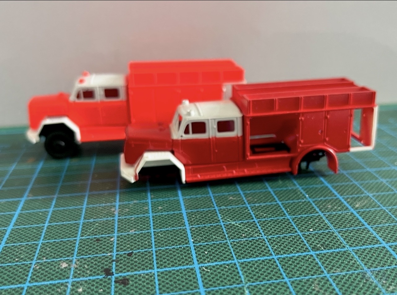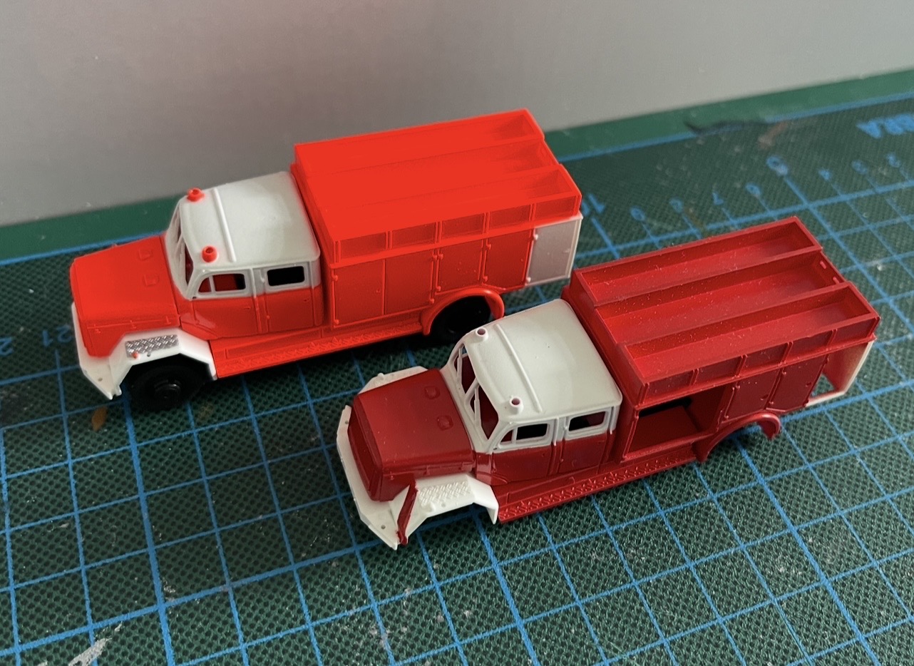 Während das Allrad-FG aus dem Preiser-Bausatz #1292 für die Frankfurt 4x2-Gelenkbühne deutlich zu hochbeinig ist, ist es für die DL 50 perfekt geeignet. Auch das Podium der 1:72-DL 30 passt in den Abmessungen recht gut für das (wesentlich breitere!) Podium der DL 50, sodass ich begonnen habe, die eckigen Roco-Radausschnitte darin einzuarbeiten. Der Rest des Podiums wird bei Gelegenheit im EIgenbau entstehen.
