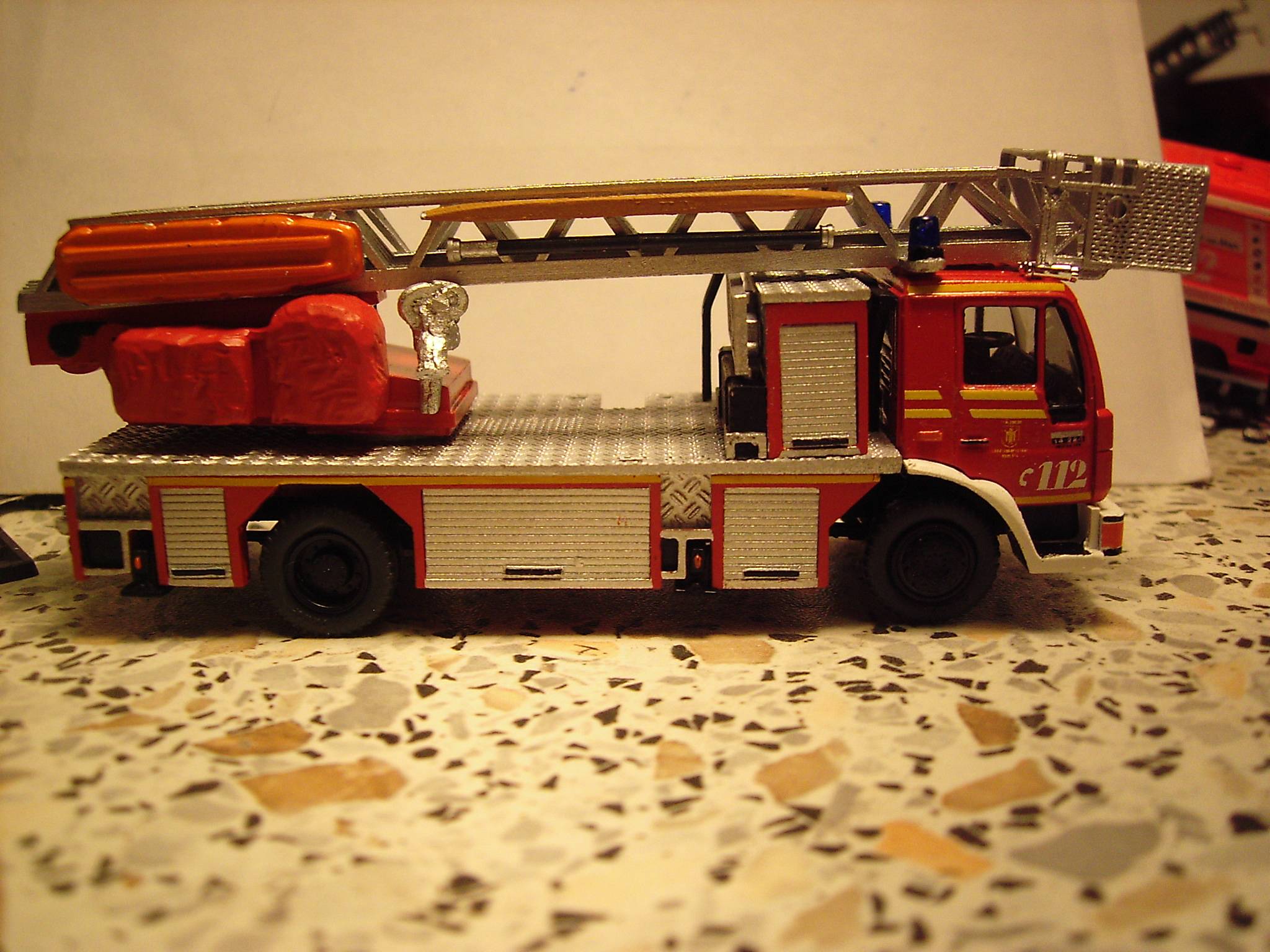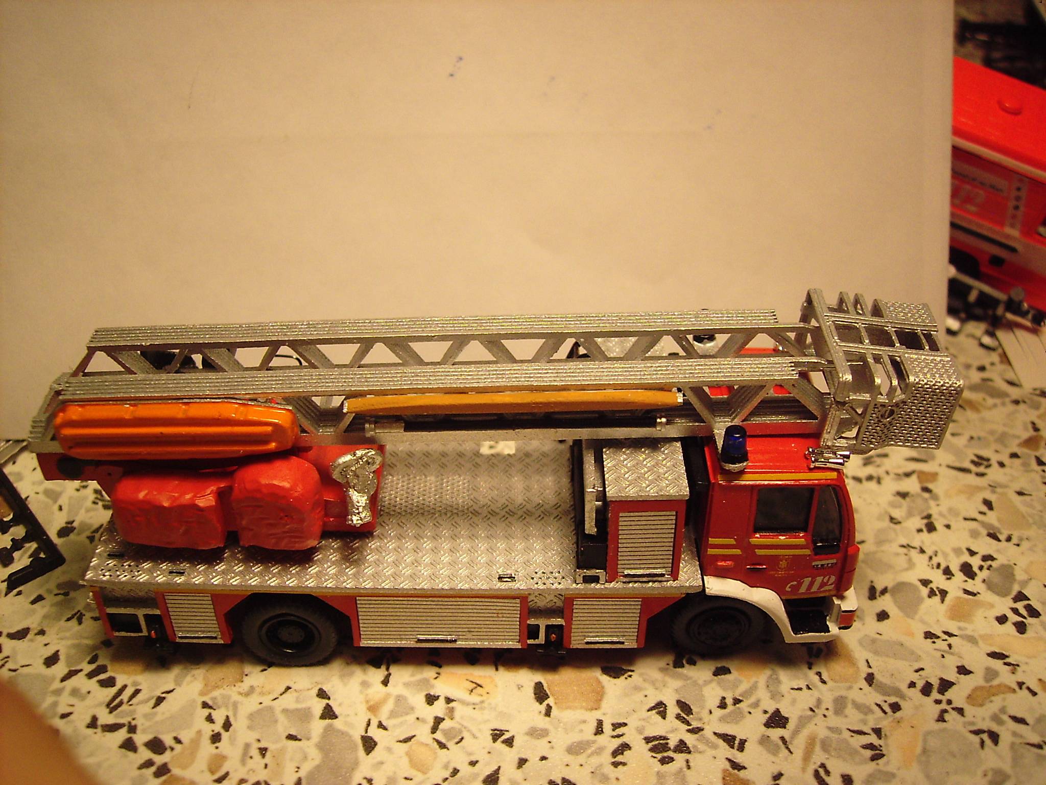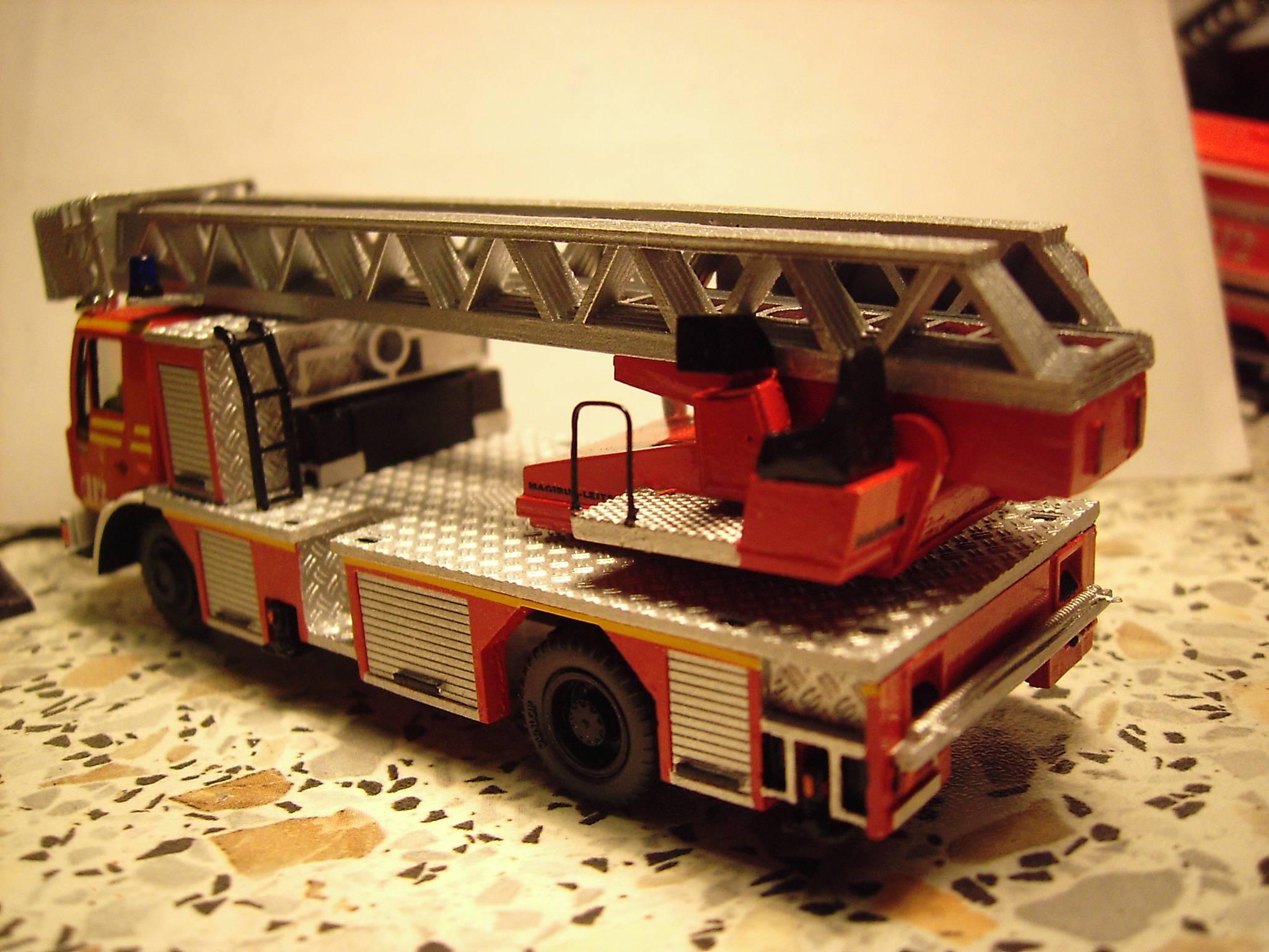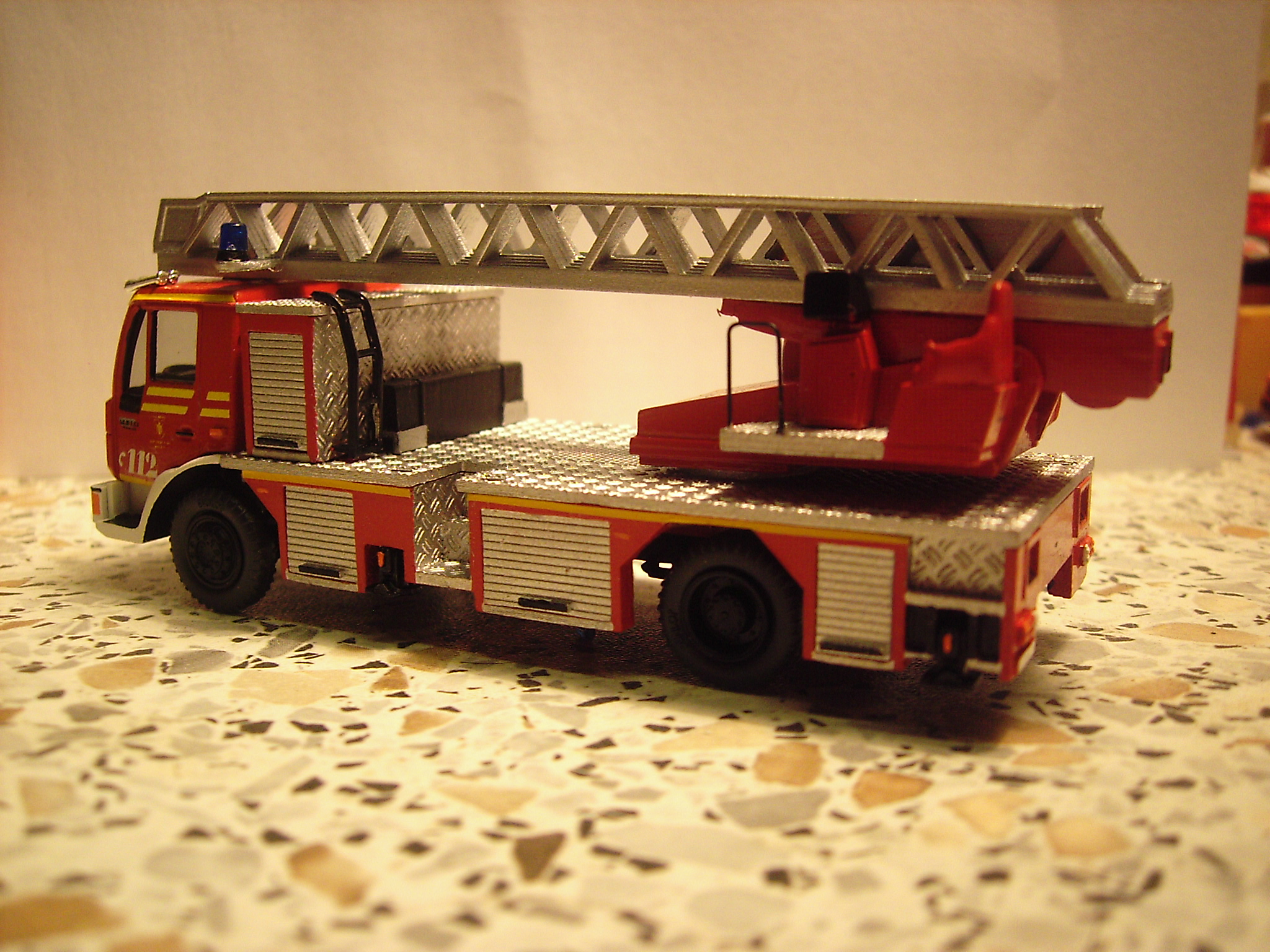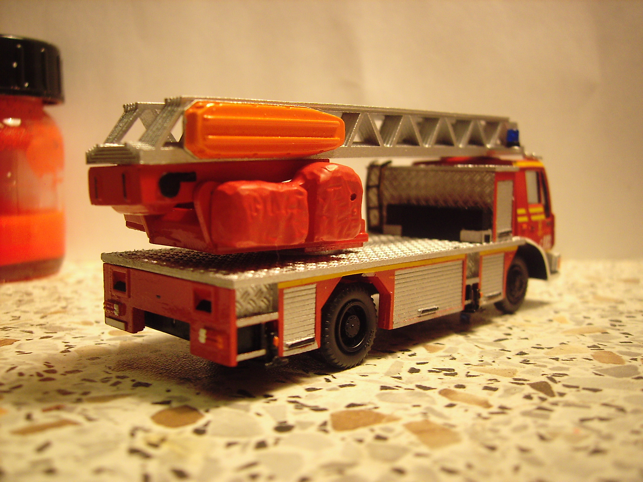 Die Leiter erhielt noch die Halterung für den Abgasschlauch am Heck , seitlich am Leiterpark wurde eine Klappleiter ( Aus Profilen von Evergreen ) und ein Schlauch für den Monitor befestigt ( Entstand aus 2 herpa Saugschläuchen ) . Außerdem wurde das Geländer am Drehstuhl und der Monitor aus der Bastelkiste nachgerüstet . Am Schluß kamen noch ein paar Decals .