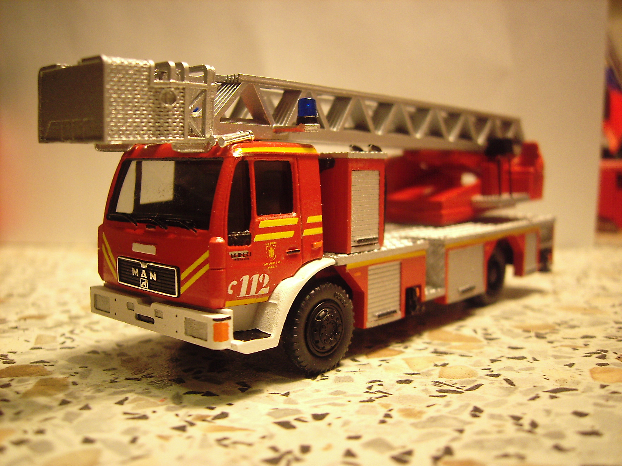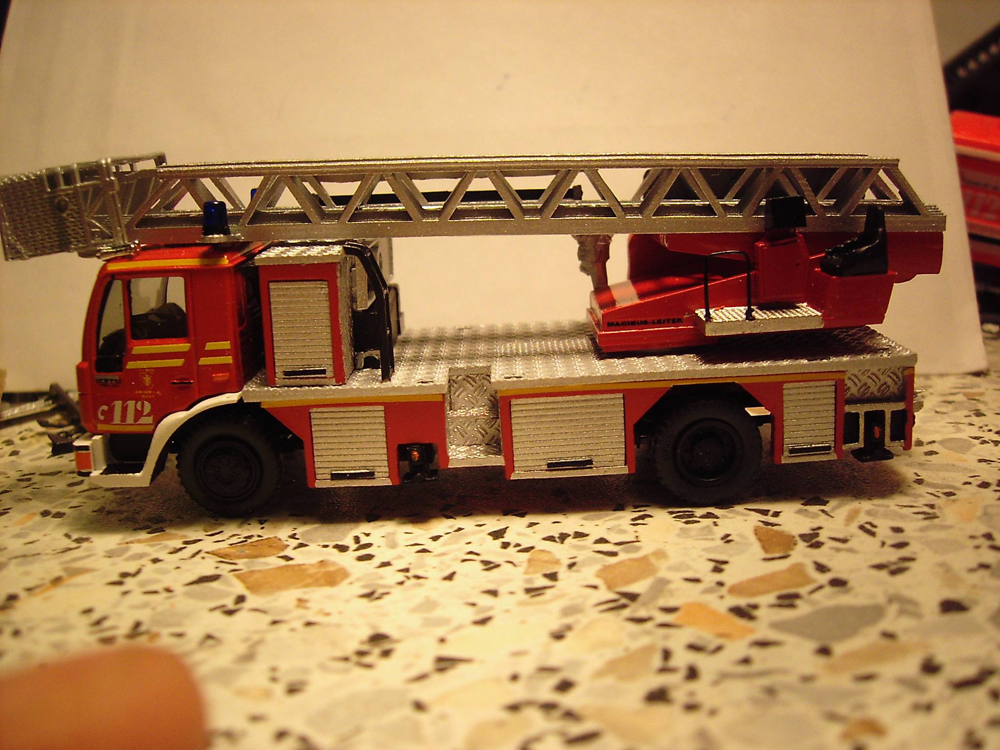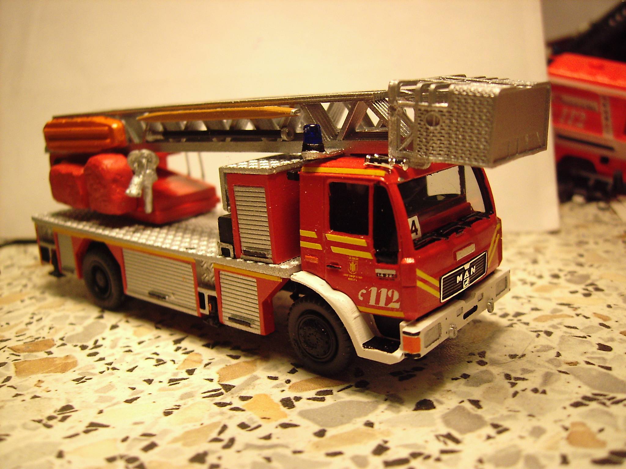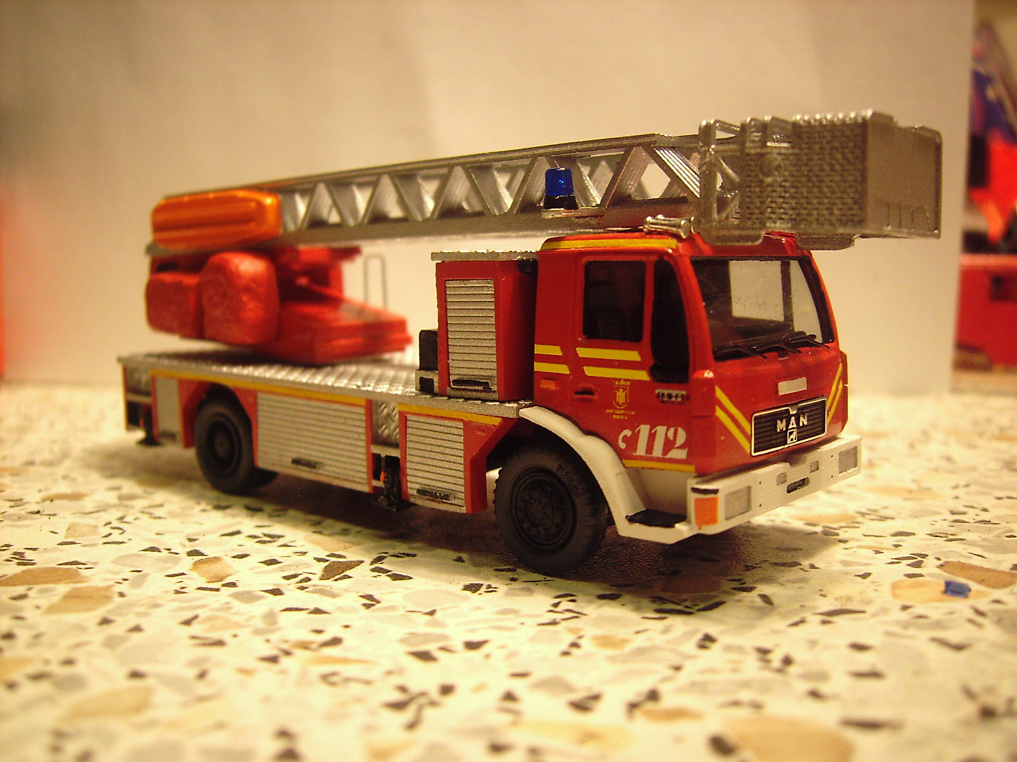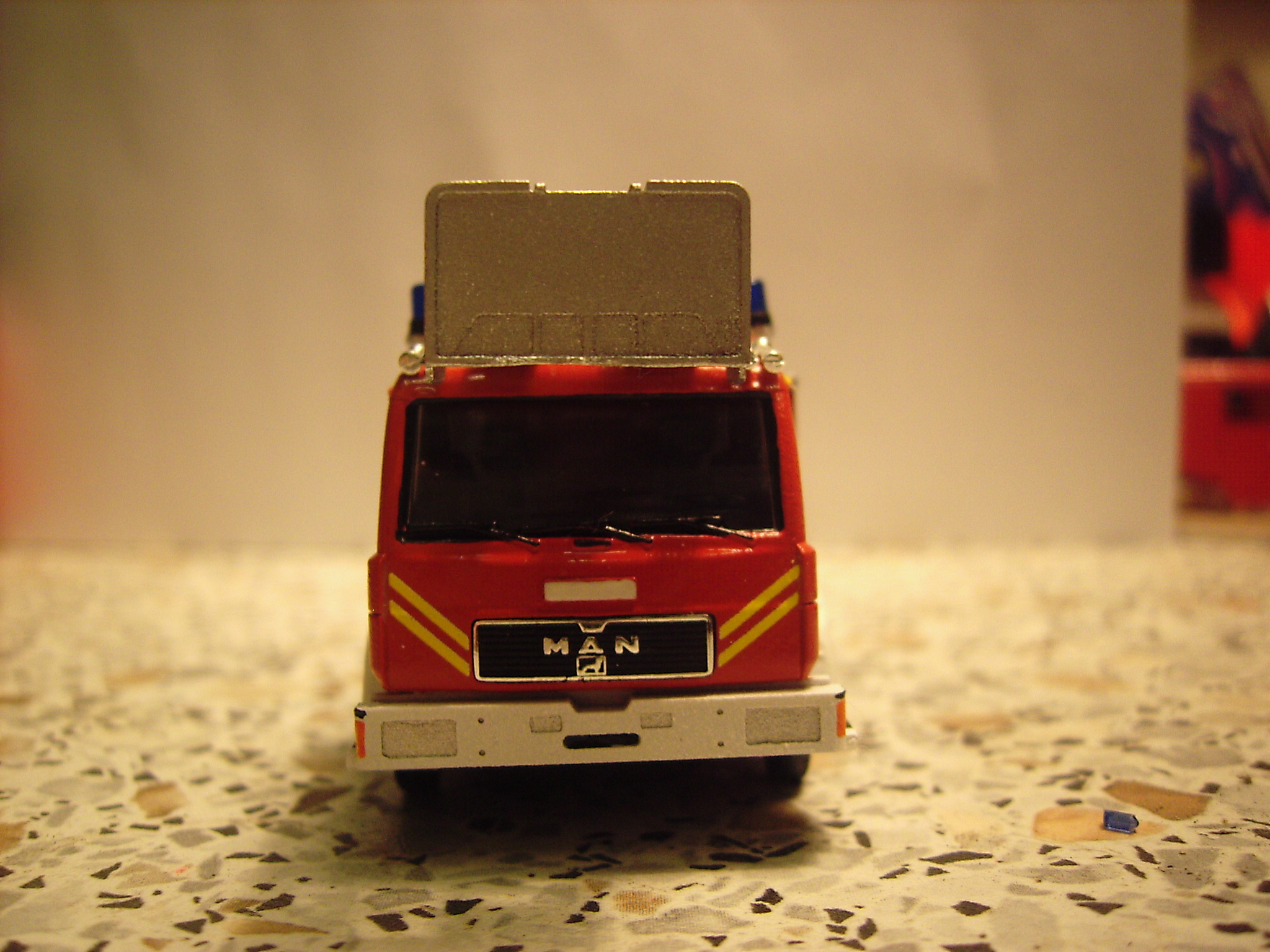 Die Leiter erhielt noch die Halterung für den Abgasschlauch am Heck , seitlich am Leiterpark wurde eine Klappleiter ( Aus Profilen von Evergreen ) und ein Schlauch für den Monitor befestigt ( Entstand aus 2 herpa Saugschläuchen ) . Außerdem wurde das Geländer am Drehstuhl und der Monitor aus der Bastelkiste nachgerüstet . Am Schluß kamen noch ein paar Decals .