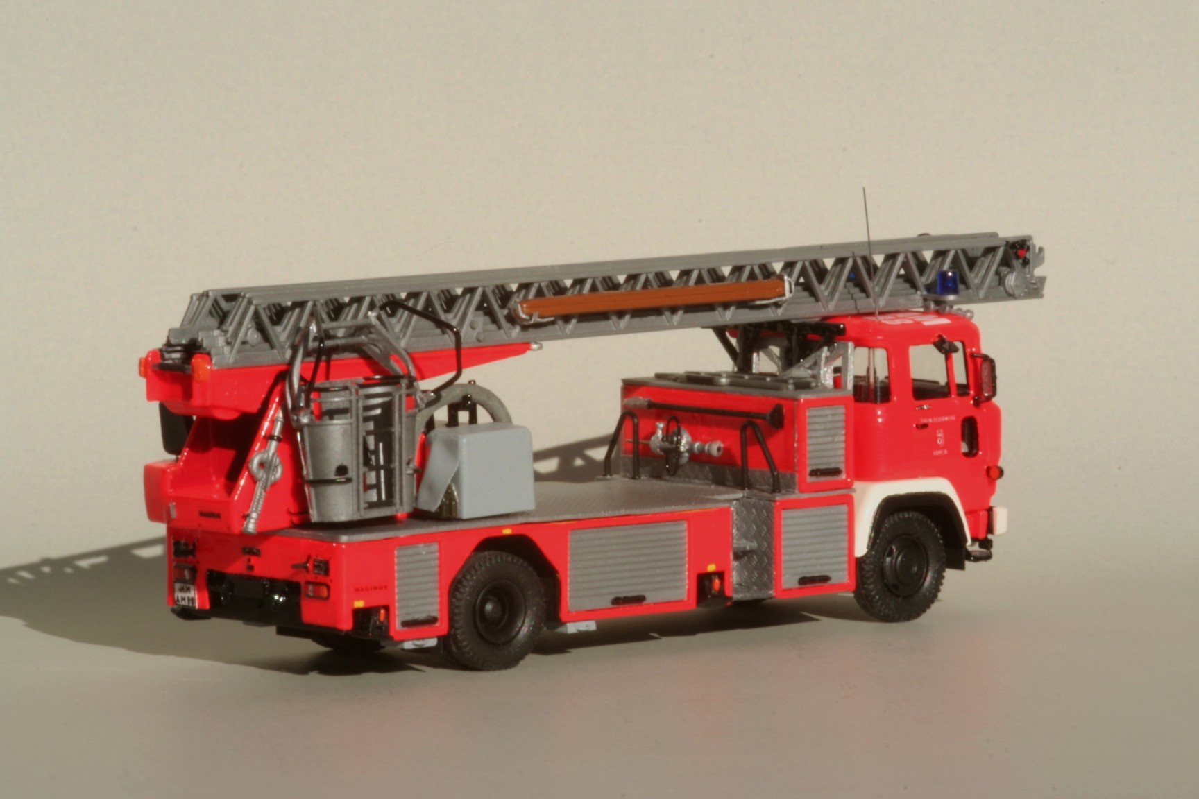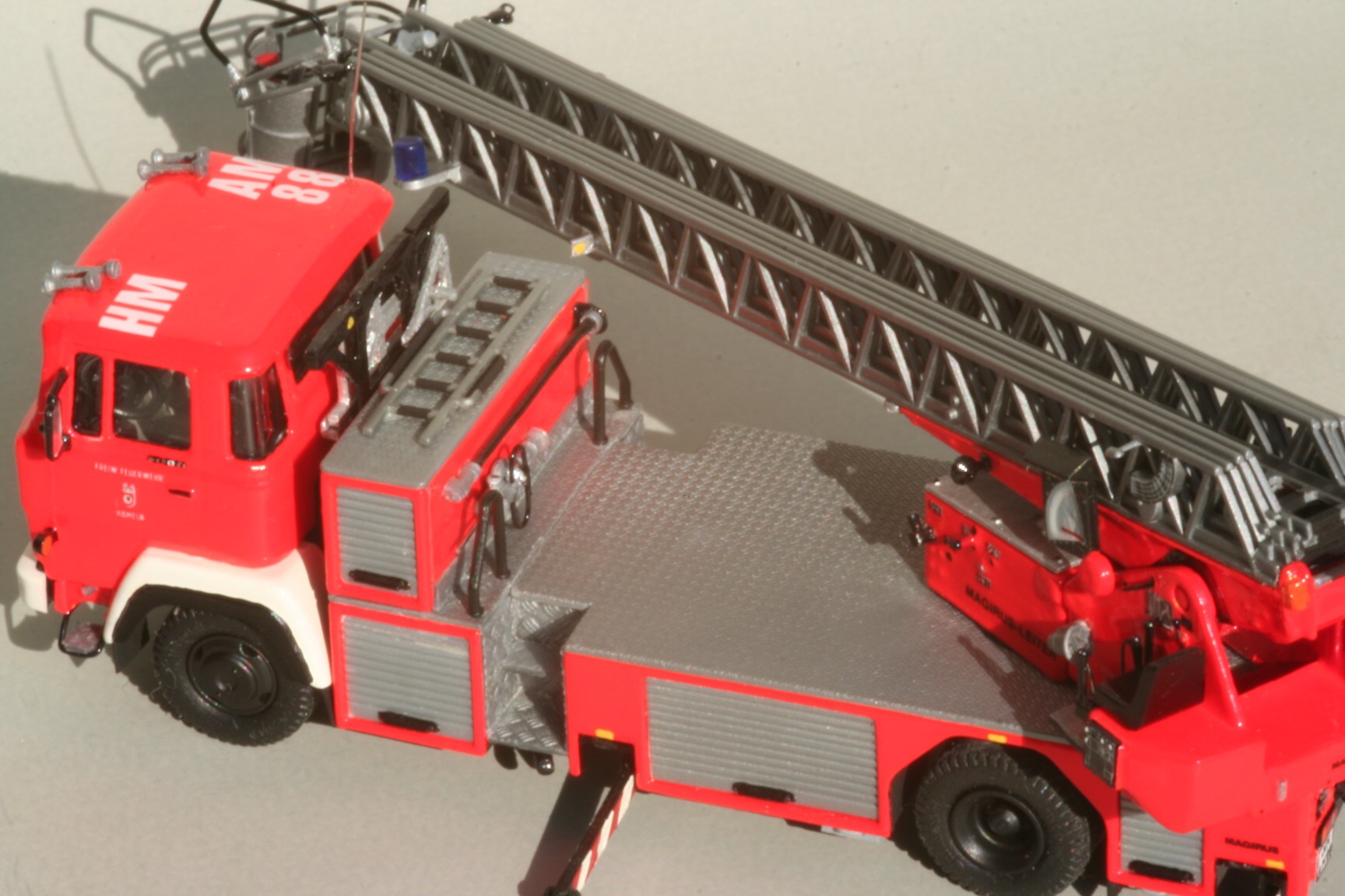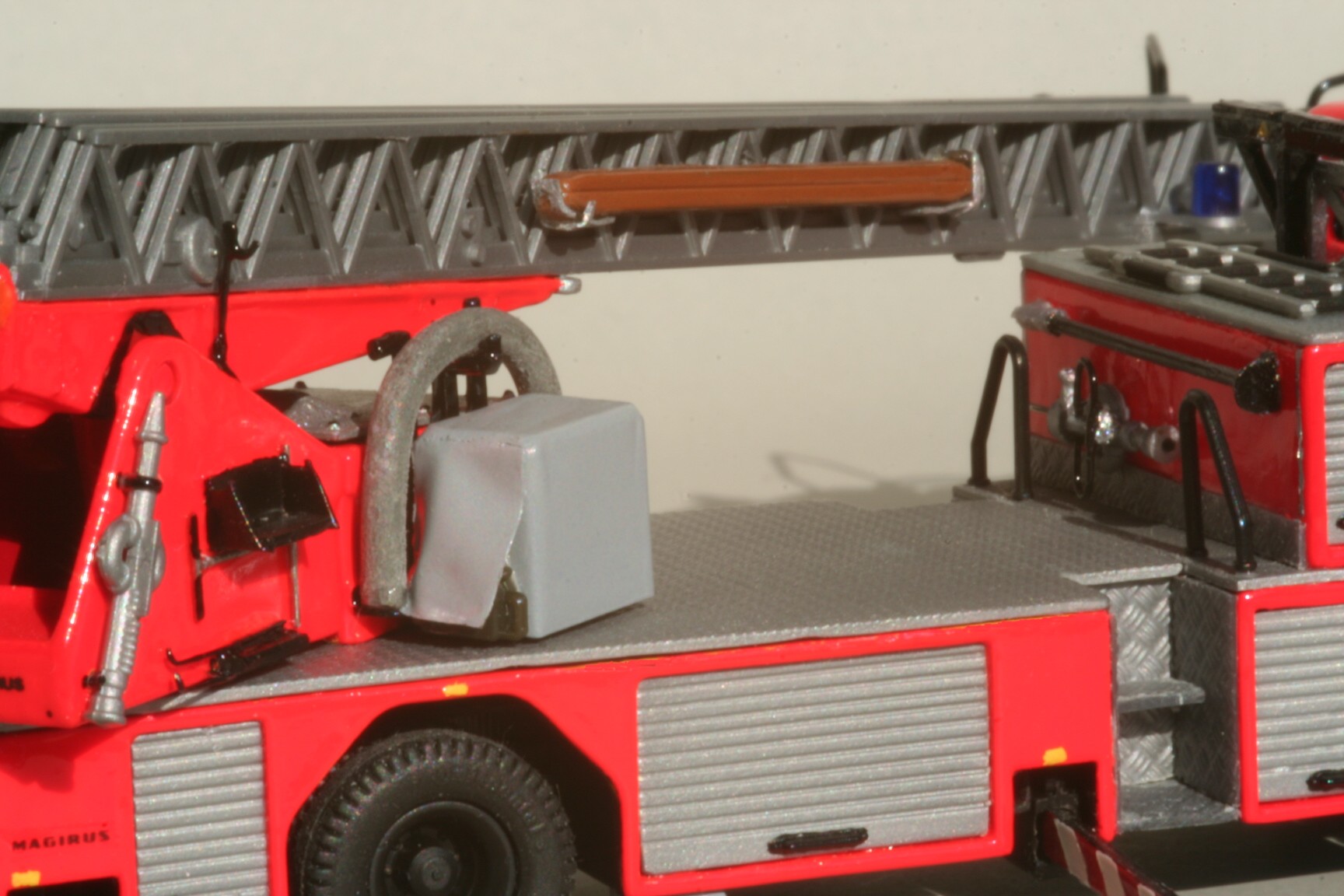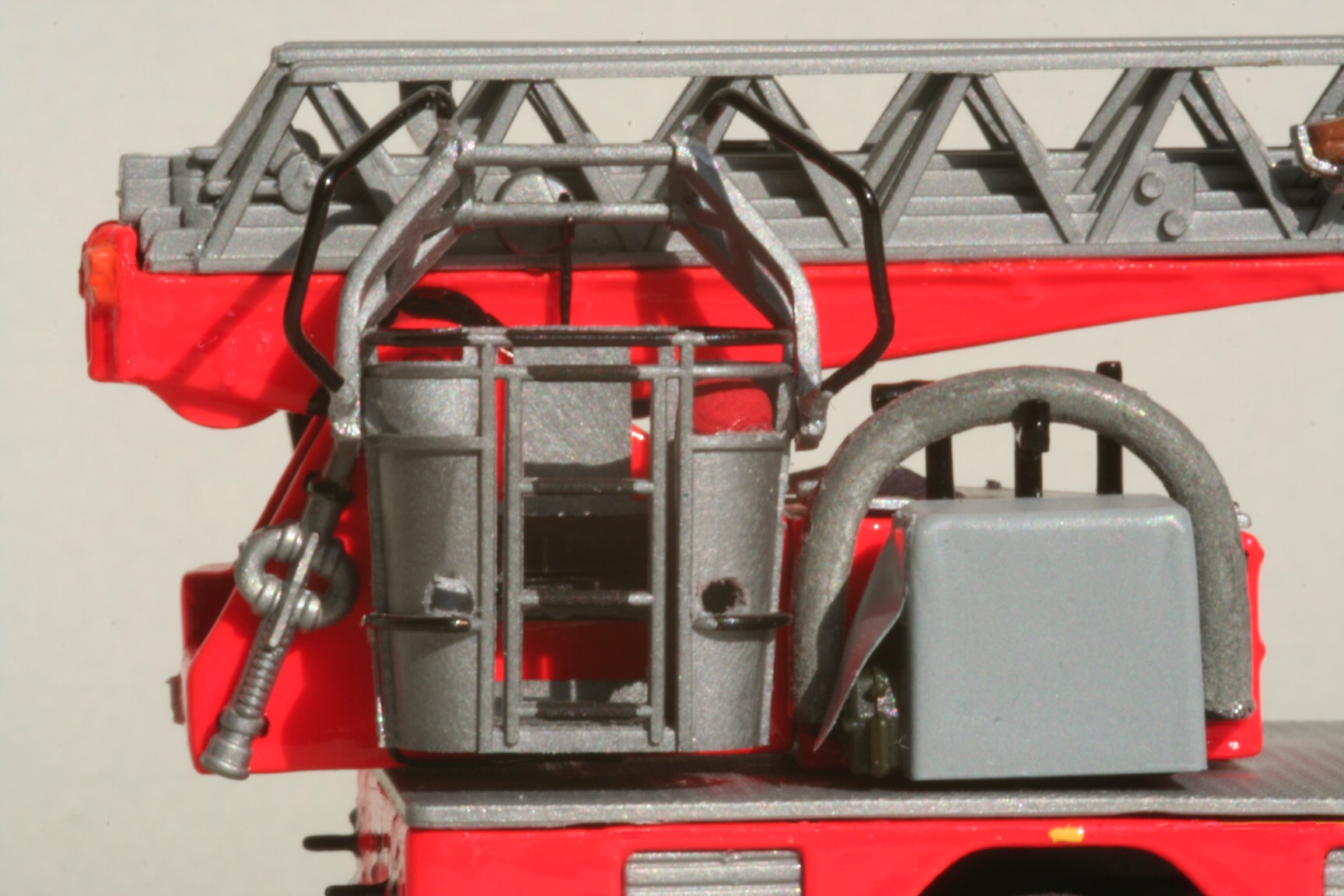 So erhielt der Korb Haltebügel für das Übersteigen vom Korb in den Leiterpark und einen Hydraulikzylinder zur Zwangssteuerung des Korbes. Im Fahrerhaus wurde der Beifahrersitz durch eine Sitzbank für zwei Beifahrer ersetzt, die Sitzbezüge durch Farbe nachgeahmt und ein PG 12 eingebaut. Beiderseits der Hinterache sind unter den Gerätekästen die Unterlegplatten für die Abstützungen angebracht. Falls die Platten benötigt werden, kann man sie an Drahtgriffen anfassen. An den Abstützungen wurden die vorgesehenen Decals nicht angebracht. Die rot-weißen Markierungen bestehen stattdessen aus Farbe, da diese im Modellbetrieb weniger empfindlich gegenüber Decals ist(siehe Bild oben rechts).