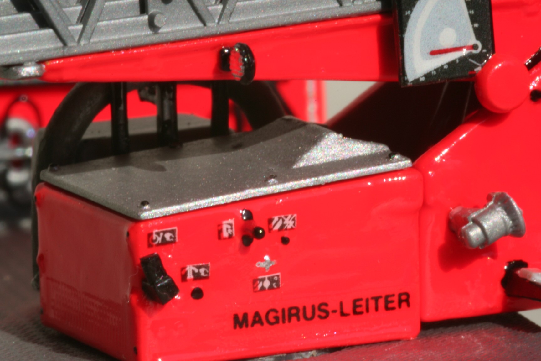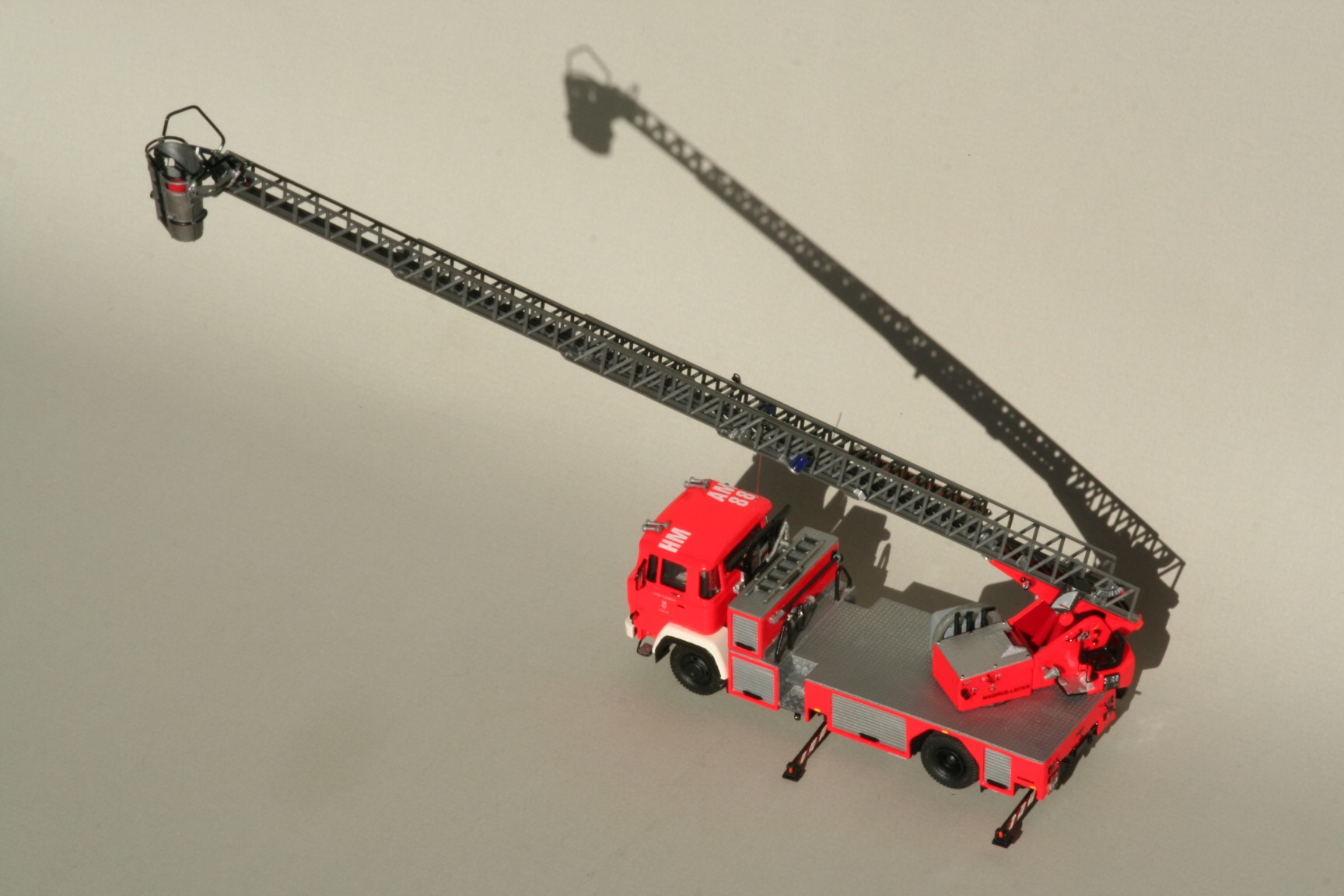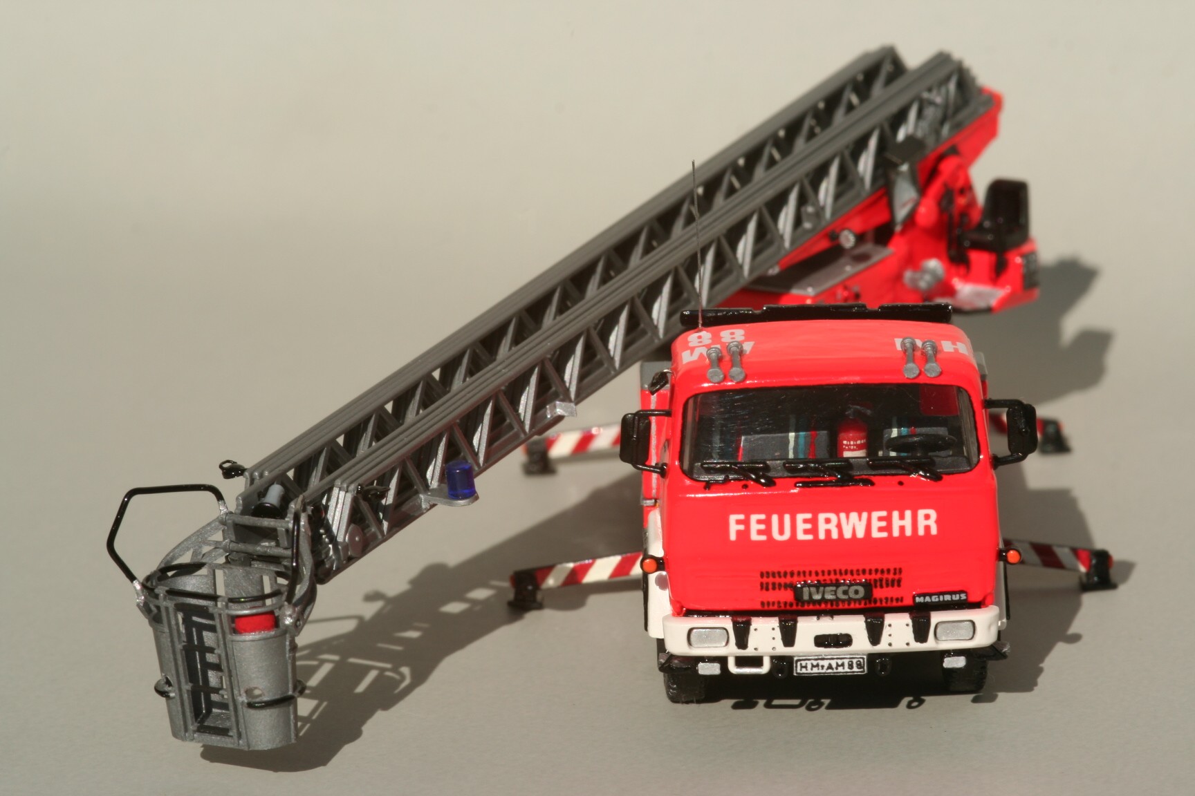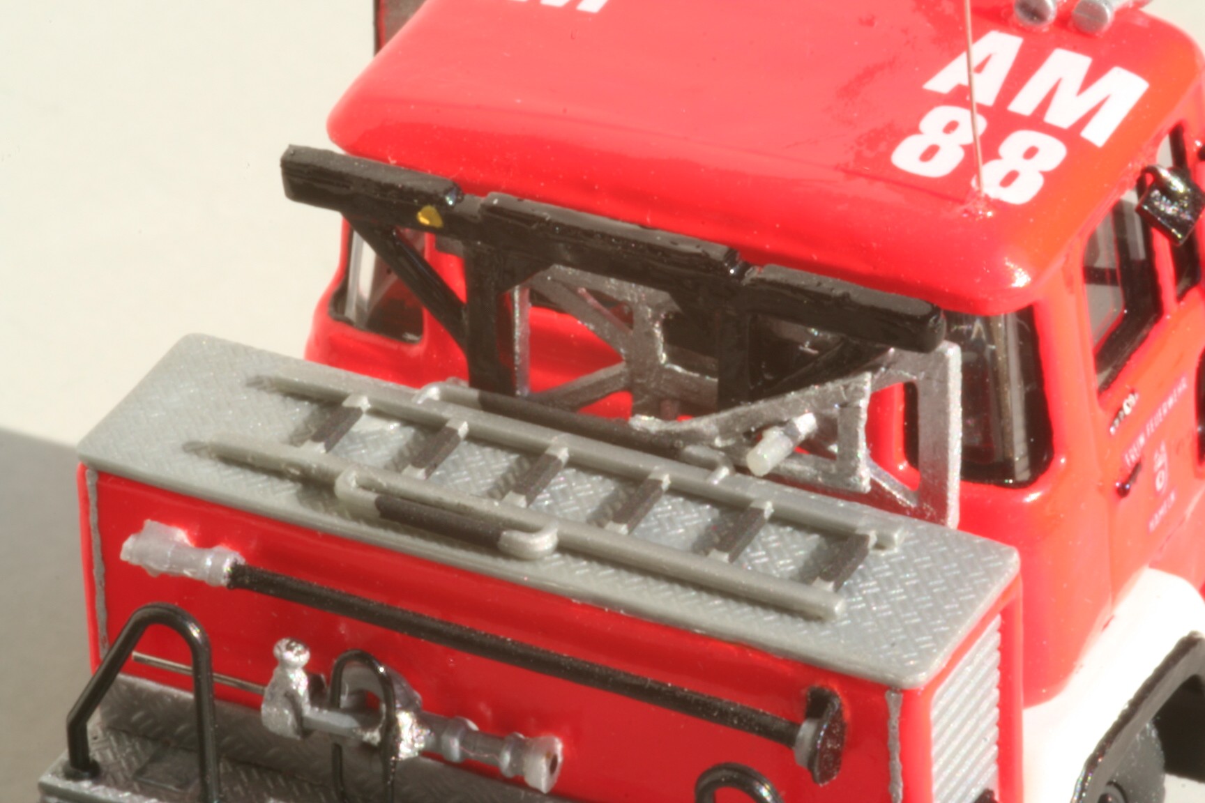 So erhielt der Korb Haltebügel für das Übersteigen vom Korb in den Leiterpark und einen Hydraulikzylinder zur Zwangssteuerung des Korbes. Im Fahrerhaus wurde der Beifahrersitz durch eine Sitzbank für zwei Beifahrer ersetzt, die Sitzbezüge durch Farbe nachgeahmt und ein PG 12 eingebaut. Beiderseits der Hinterache sind unter den Gerätekästen die Unterlegplatten für die Abstützungen angebracht. Falls die Platten benötigt werden, kann man sie an Drahtgriffen anfassen. An den Abstützungen wurden die vorgesehenen Decals nicht angebracht. Die rot-weißen Markierungen bestehen stattdessen aus Farbe, da diese im Modellbetrieb weniger empfindlich gegenüber Decals ist(siehe Bild oben rechts).