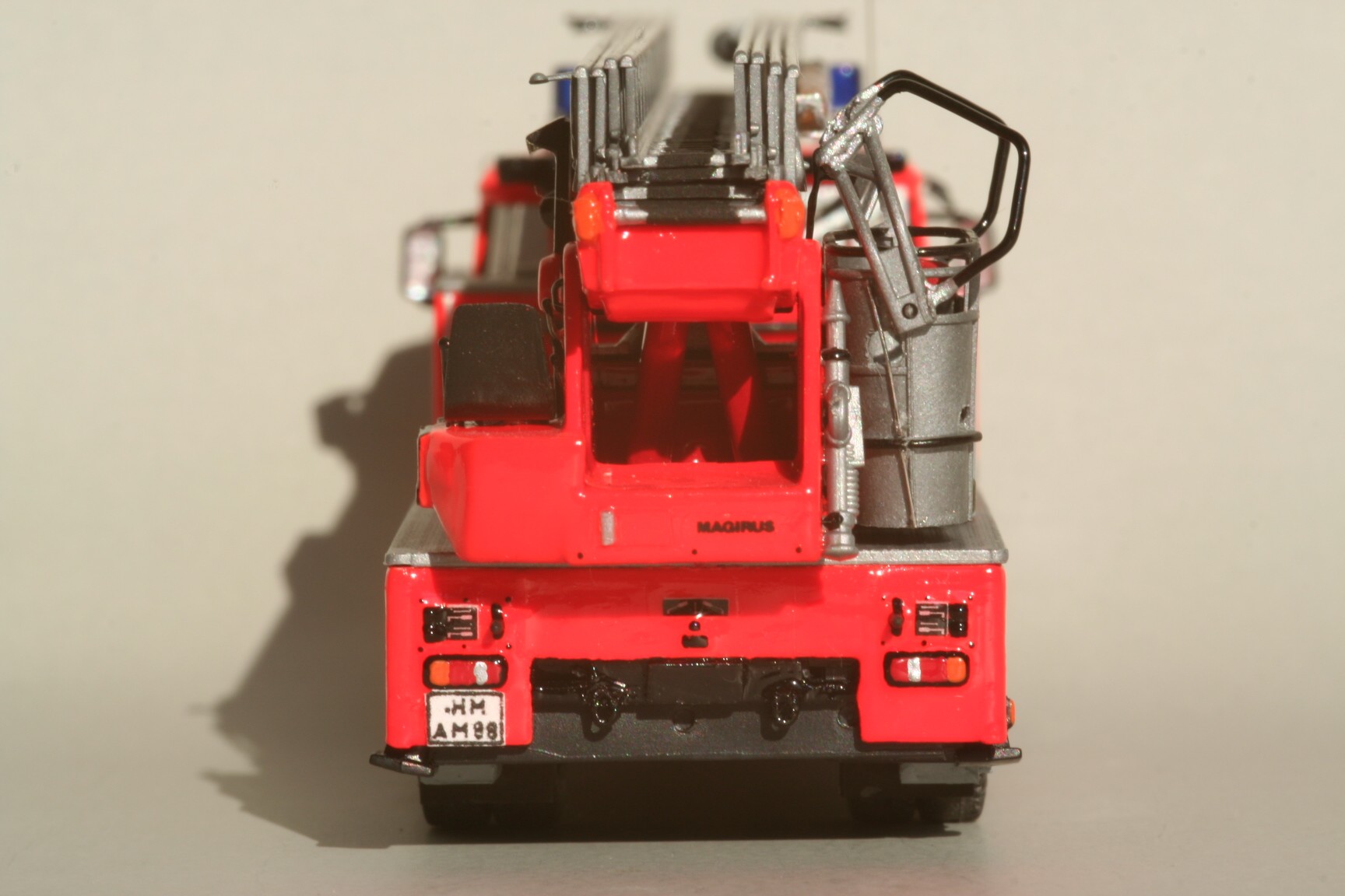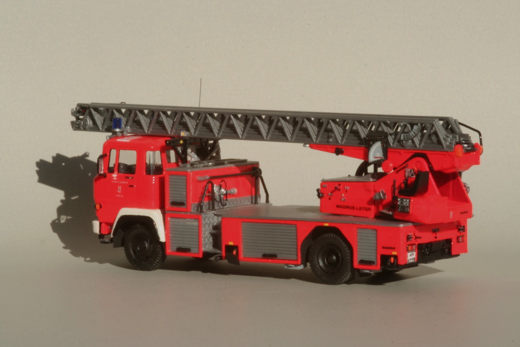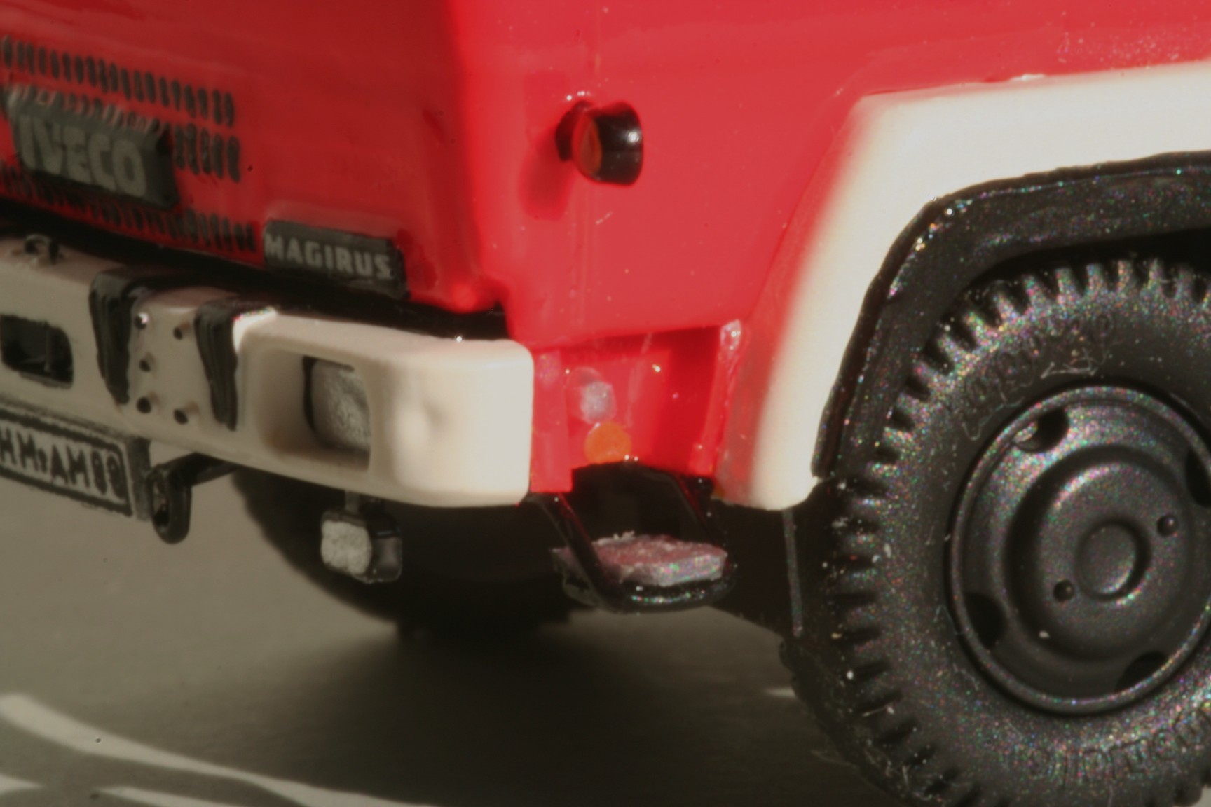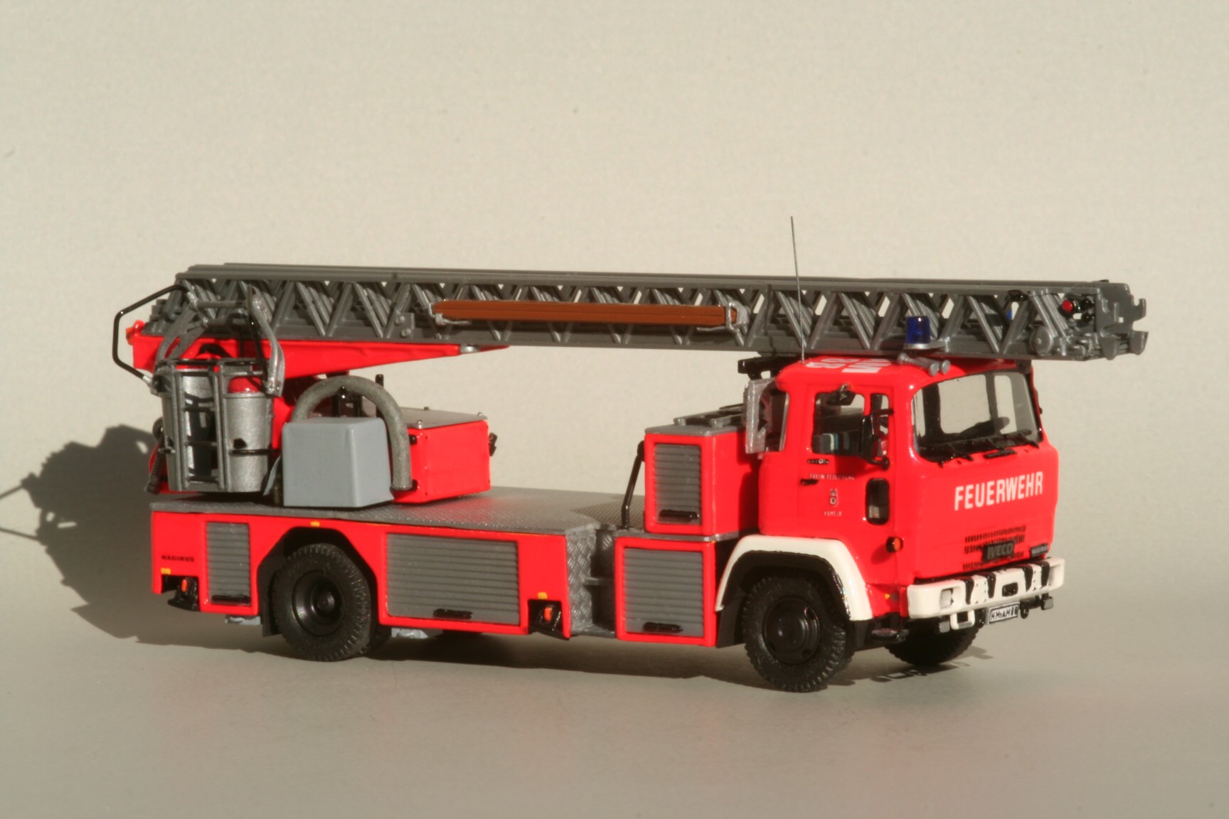 So erhielt der Korb Haltebügel für das Übersteigen vom Korb in den Leiterpark und einen Hydraulikzylinder zur Zwangssteuerung des Korbes. Im Fahrerhaus wurde der Beifahrersitz durch eine Sitzbank für zwei Beifahrer ersetzt, die Sitzbezüge durch Farbe nachgeahmt und ein PG 12 eingebaut. Beiderseits der Hinterache sind unter den Gerätekästen die Unterlegplatten für die Abstützungen angebracht. Falls die Platten benötigt werden, kann man sie an Drahtgriffen anfassen. An den Abstützungen wurden die vorgesehenen Decals nicht angebracht. Die rot-weißen Markierungen bestehen stattdessen aus Farbe, da diese im Modellbetrieb weniger empfindlich gegenüber Decals ist(siehe Bild oben rechts).