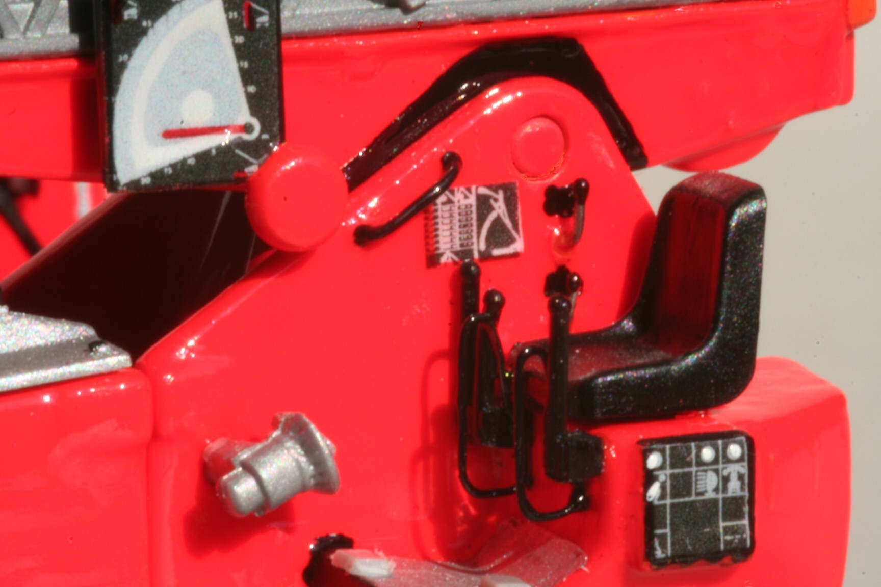 Der nur angedeutete Tritt am Roco-Fahrerhaus wurde abgesägt und durch einen vorbildgetreuen aus Draht und einem kleinen Stück einer Kibri Krähenfußblechplatte ersetzt. Außerdem erhielt das Modell unter der Fahrertür einen Anschluss für das Ladekabel sowie einen weiteren(orange) für eine Druckluftleitung. In der hellbraunen Türpolsterung ist noch die schwarze Armauflage zu sehen. Nur die Kurbel zum Heben und Senken der Seitenscheibe fehlt :wink: . Am Drehstuhl habe ich die etwas grobe Halterung für den Korb abgesägt und durch eine vorbildgetreue ersetzt. So kann der Modellkorb auf der Schräge hochgeschoben werden und bleibt in der Vertiefung oben hängen. Die beiden Stangen zur Arretierung des Korbes an seinem unteren Ende sind deshalb im Modell funktionslos, wurden aber nachgebildet. Außerdem befindet sich unter der Korbhalterung der Auslösehaken für den Korb. Die Korbwandung hat noch Trittnischen erhalten und das Steuerpult im Korb eine rote Stoffabdeckung. Am Generator befindet sich eine Planenabdeckung, die an einer Seite wegen des überstehenden Reservekanisters nicht geschlossen werden kann.