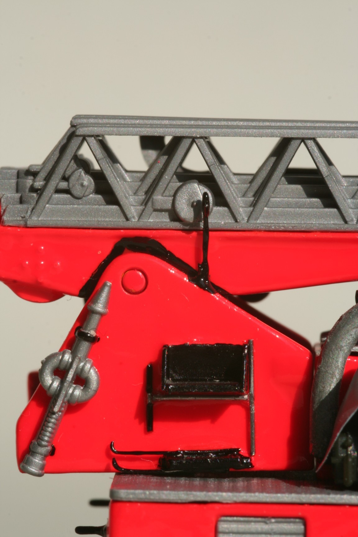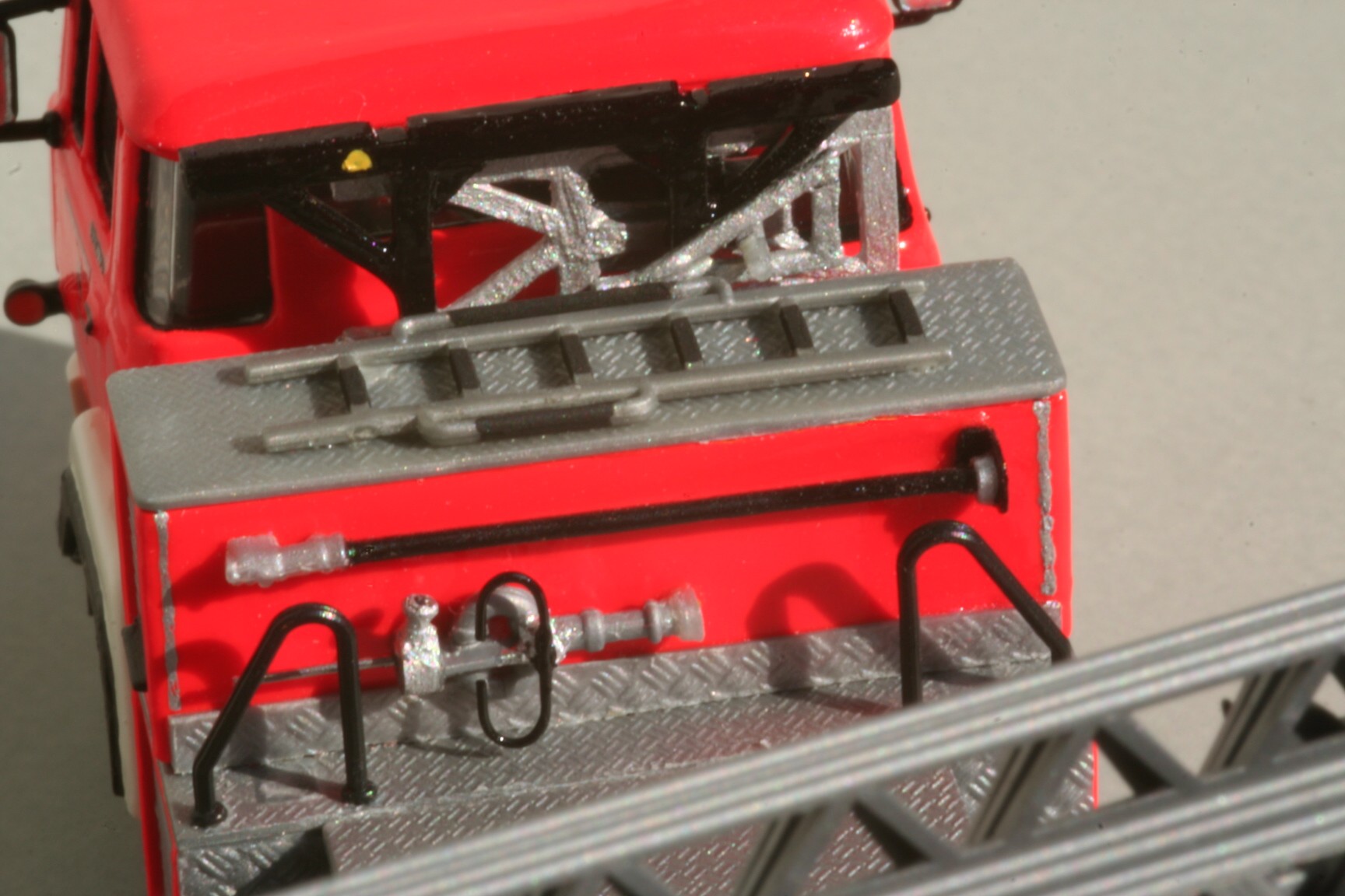 Beim Roco-Modell ist die Detaillierung am Leiterstuhl eigentlich gut. Ich habe aber trotzdem alle hervorstehenden Gravuren abgeschliffen und durch davorgeklebte Teile ersetzt, um die 3D-Wirkung zu verbessern. So bestehen die Griffe aus Draht, ebenso die Steuerhebel für den Handbetrieb. Der Steckzapfen für den Pumpenhebel im Handbetrieb ist aus Plastikabfällen selbst gebaut. Die Krankentragenhalterung ist ebenfalls selbst gebaut und an der Leiterauflage befestigt. An der Rückwand des schmalen Gerätekastens auf dem Podium befindet sich ein Wenderohr mit Aufsteckdorn sowie der schwarze Verbindungsschlauch vom Leiterpark zum Wenderohr, der aus einem Stück der Preiser-Modellschläuche besteht.