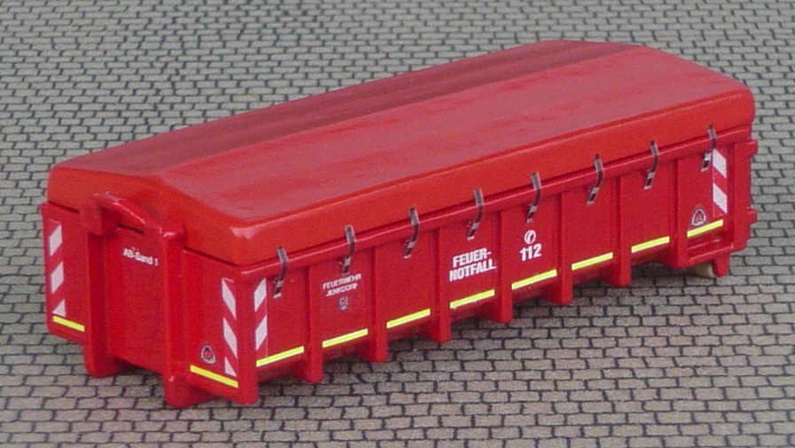 Die halbhohe Mulde mit Plane von Kibri diente mir hier als Basis. Auch sie wurde in RAL 3000 (Humbrol Nr. 19) lackiert und mit entsprechenden Decals von MBSK und DS-Design verfeinert.
