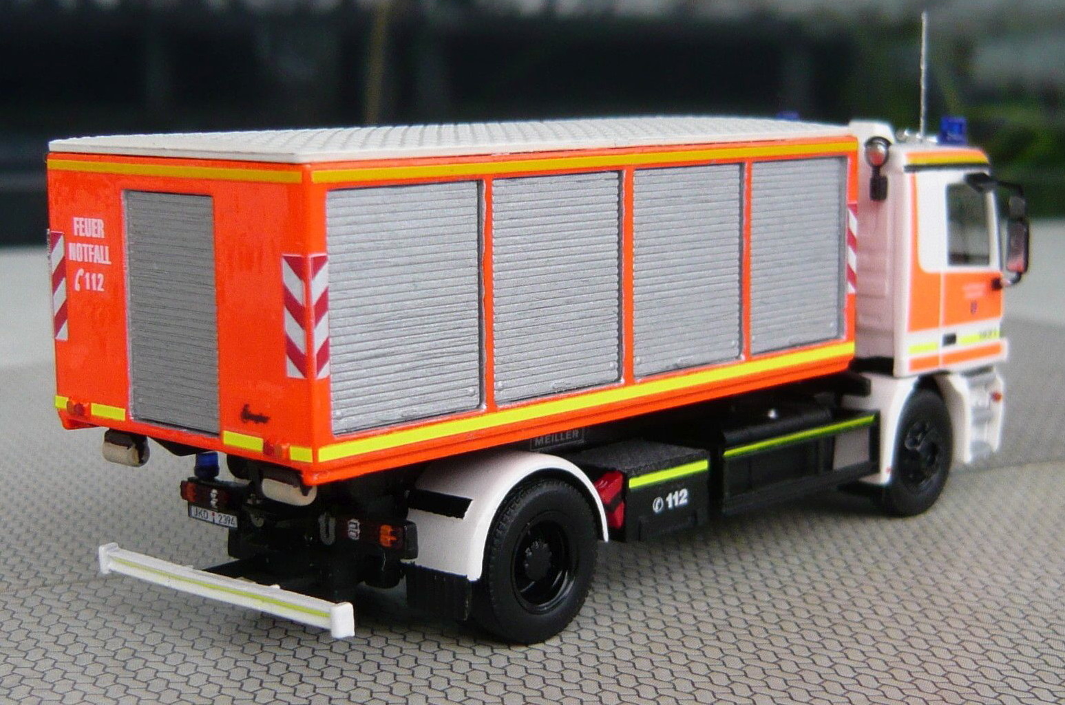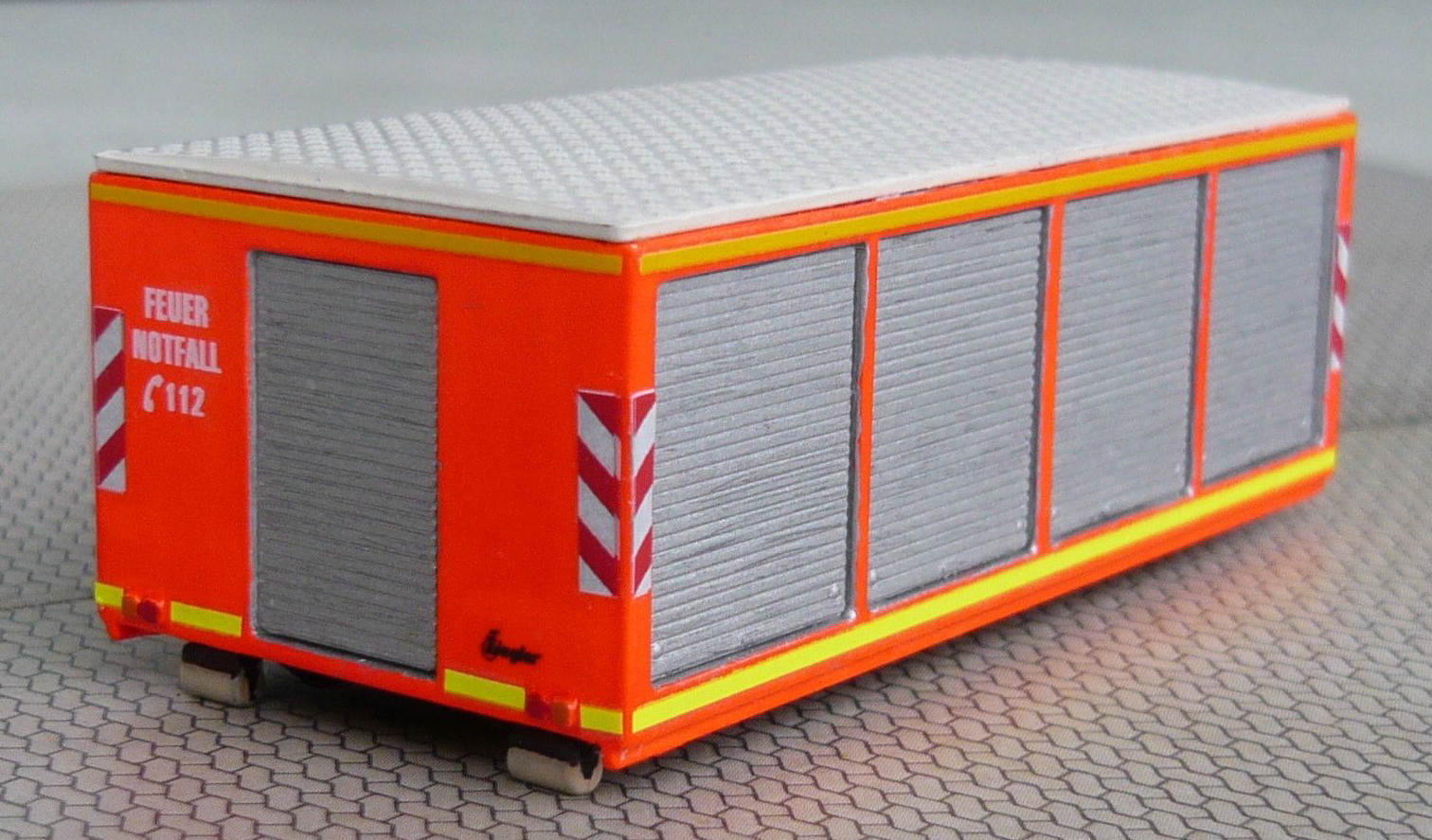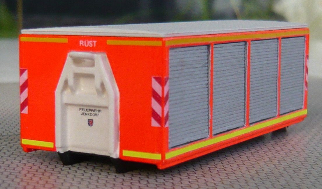 Der altgediente AB von Preiser wurde schon vor weit über 10 Jahren in der damals erhältlichen "Authentic Colour" von Humbrol in RAL 3024 mit dem Pinsel umlackiert. Nachdem er ursprünglich für eine andere (nie verwirklichte) fiktive Feuerwehr von mir gedacht war und ich ihn für den Bastelschrott zu schade fand, habe ich ihn kurzentschlossen der BF Jenkdorf zugeordnet und das typische Erscheinungsbild auch auf diesem Modell umgesetzt. Die Beschriftung stammt von Preiser, MBSK und DS-Design.