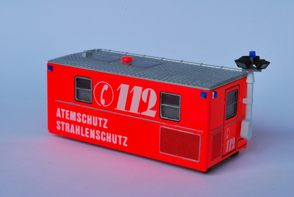 Das Modell basiert auf der bekannten Raumzelle von Preiser, in RAL 3024 lackiert, Decals aus dem Vorrat, Lichtmast ein Eigenbau aus Preiserteilen, Ätzgitter von FKS, Fenster mit Tesafilm mattiert, eckige Straßsteine als Blaulichter.