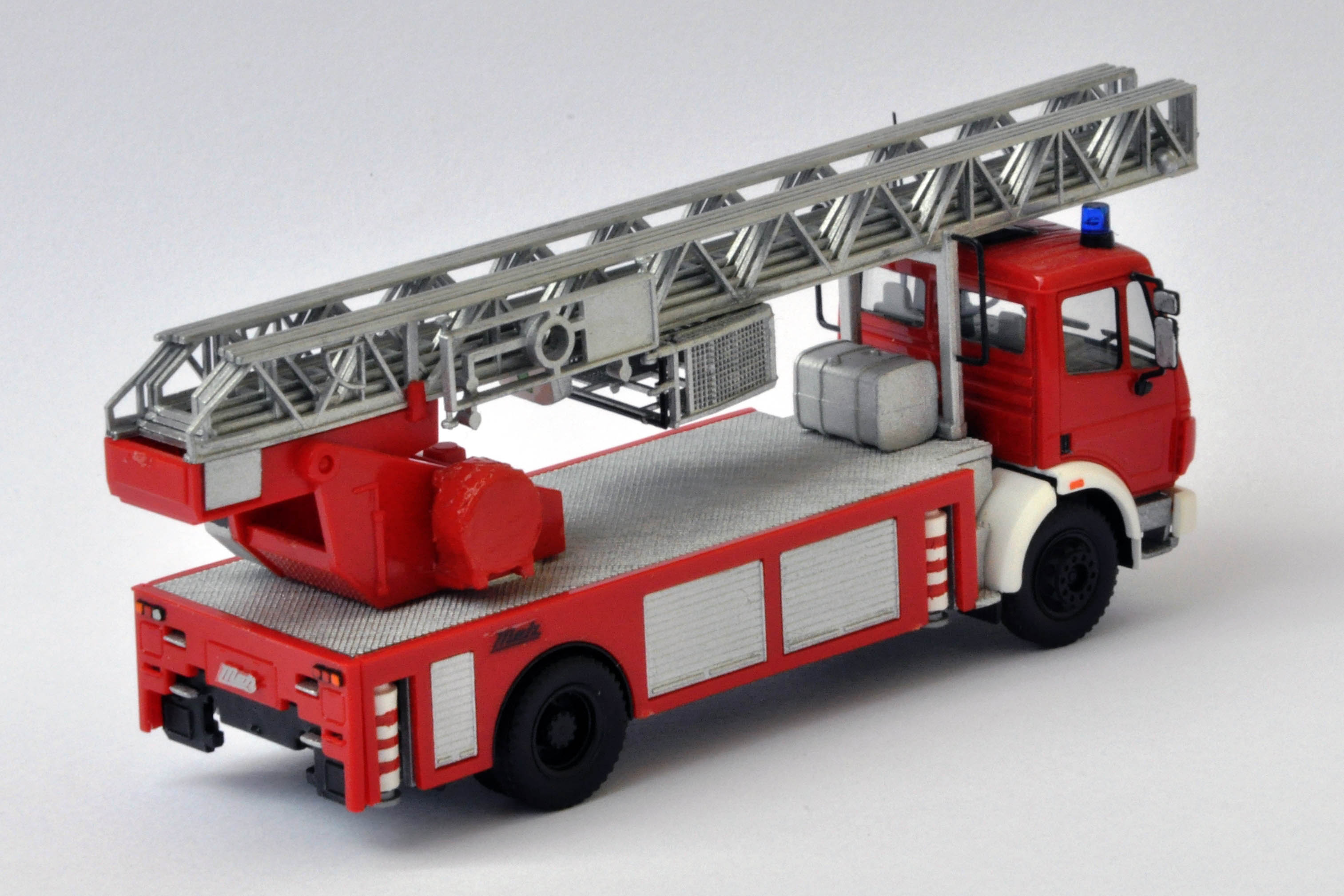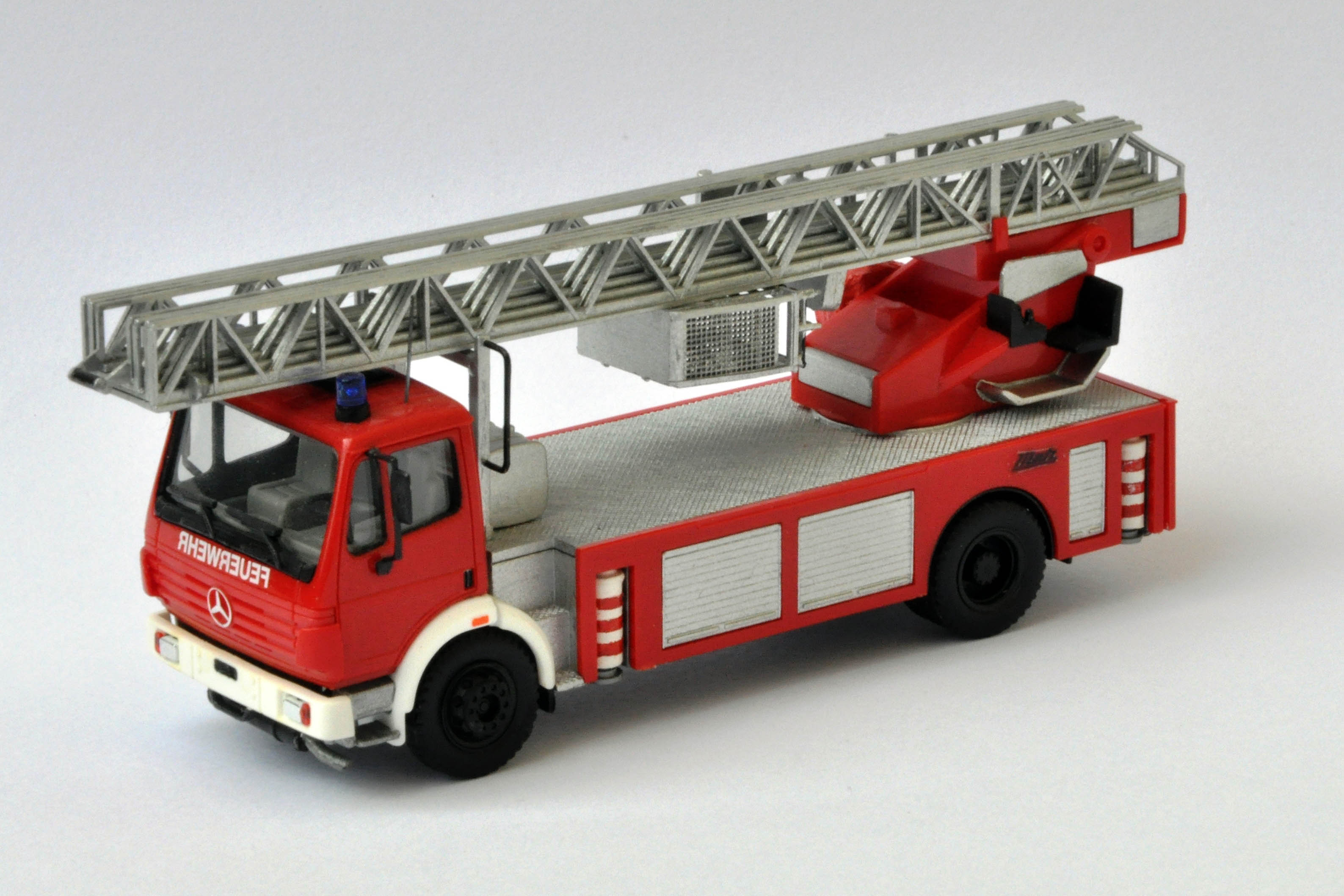 Hier eine DLK 23/12 von Metz auf einem Mercedes SK94. Das Herpa-Modell wurde lediglich ein wenig detailierter gestaltet und der Leiterpark wurde silber