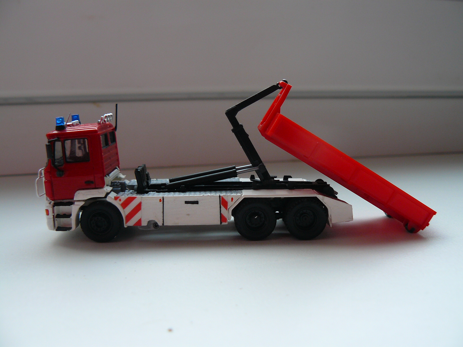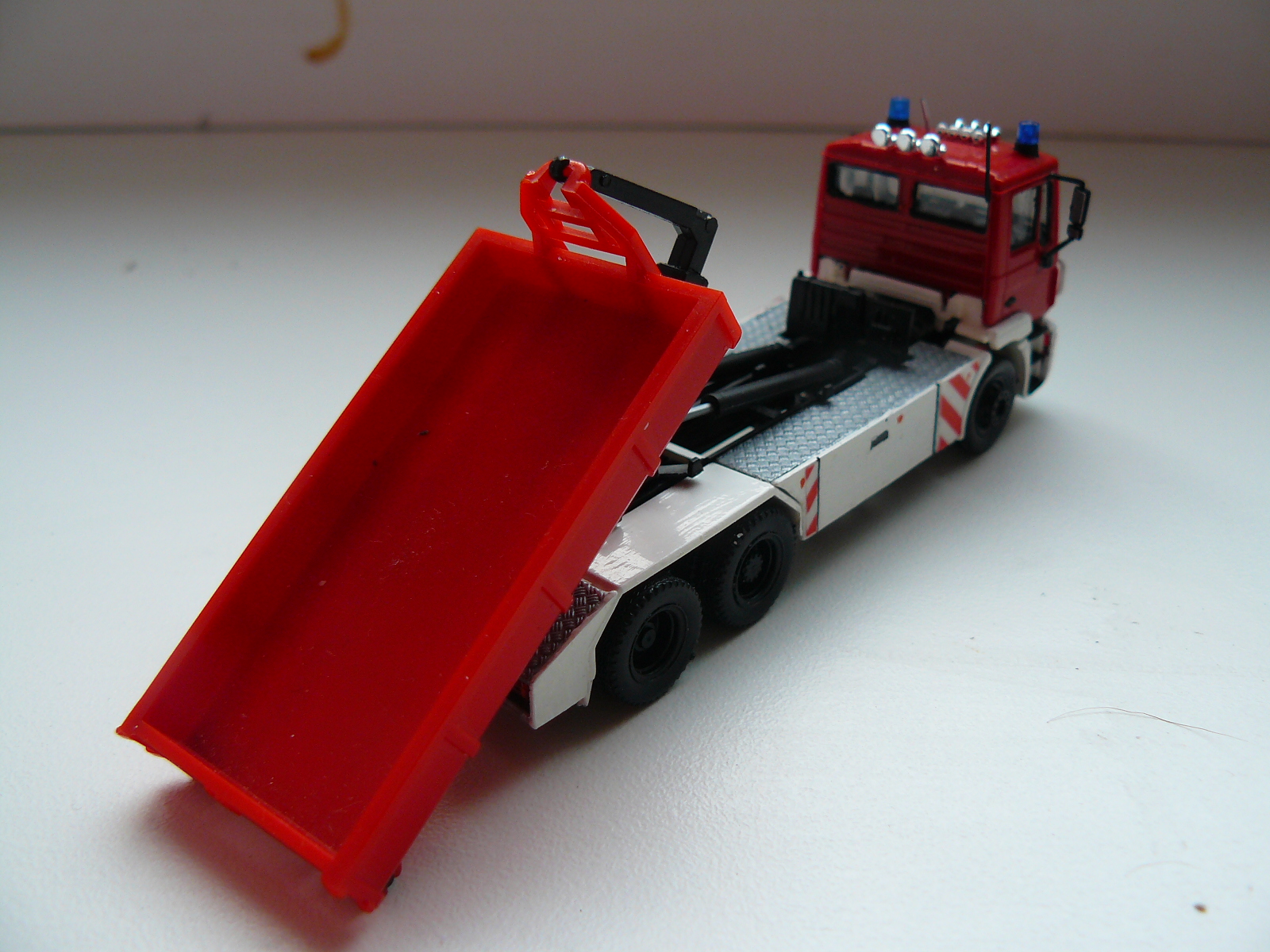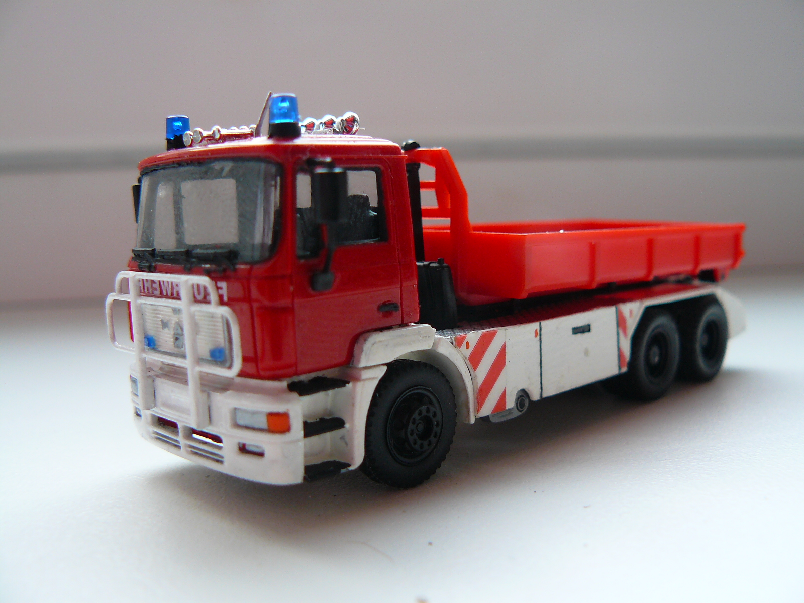 Bei mir gibt es nach diversen LF, Trotlf usw. ein Arbeitstier der Feuerwehr. Es ist ein MAN F2000 WLF mit Truppkabine. Neben einem Frontschutzbügel erhielt das Fahrzeug 2 Antennen ( eine für Funk, die kleine auf dem Dach für Radio), verchromte Martinshörner, drei Arbeitsscheinwerfer und eine neue Seiten- und Heckverkleidung. Das Modell hatte vorher noch eine Kupplung am Heck, welche ich entfernt habe. Die Neue Verkleidung sitzt auf den Halterungen des Unterfahrschutzes, welcher ursprünglich am Modell war. Farblich wurde nur die wenig gemacht. Den unteren Teil mit Kotflügel usw. hab ich nochmal weiss lackiert weil der leicht gelblich wirkte. Achja Frontblitzer hat er auch, die sitzen in der unteren Kühlergrillecke. Und nun lass ich mal Bilder sprechen. Zur Zeit ist er noch mit Flachmulde unterwegs, da ich noch keine anderen AB bekommen habe. Ich hab zwar welche im Netz gefunden, aber der Preis war zu hoch. Ich sag lieber nich was da einer für 2 AB- Container haben wollte.