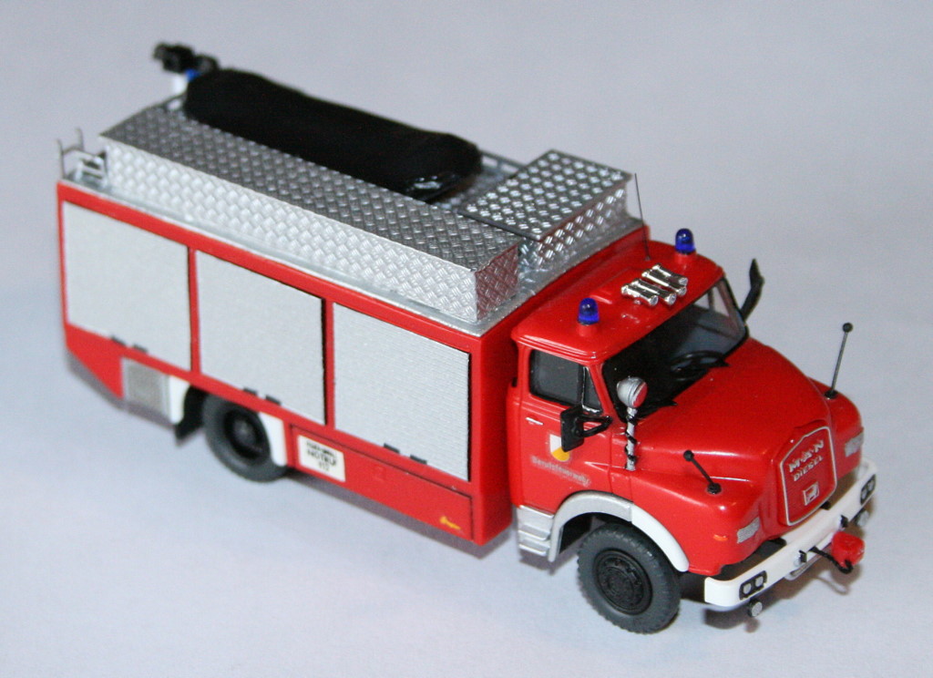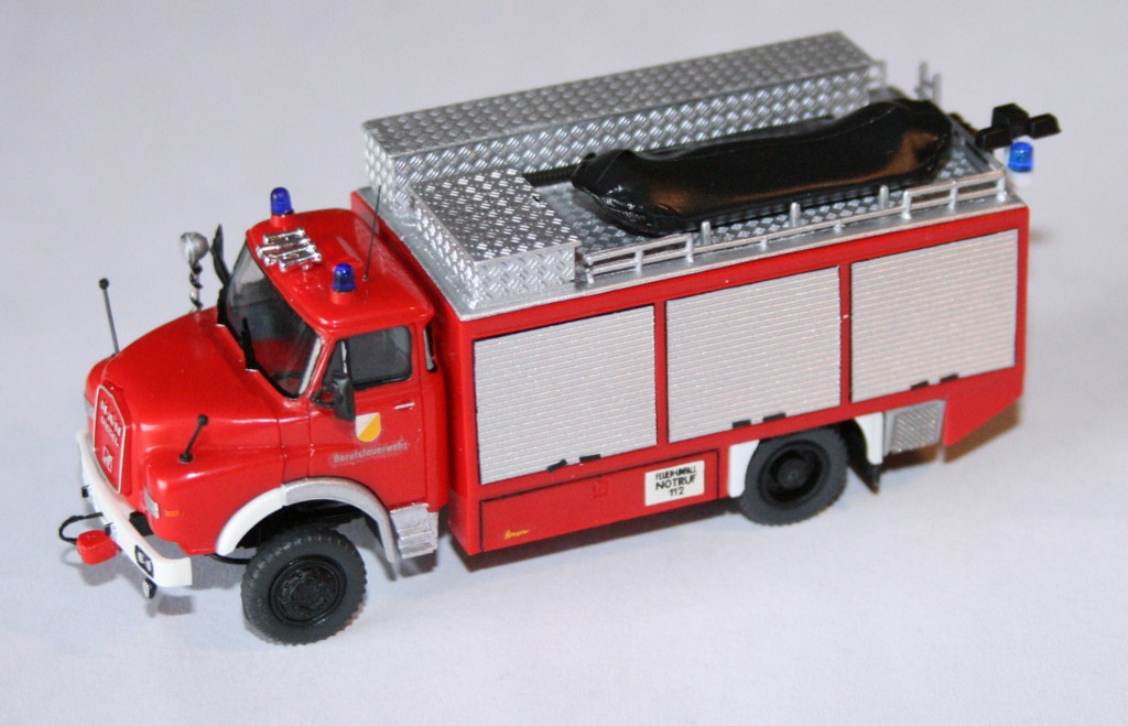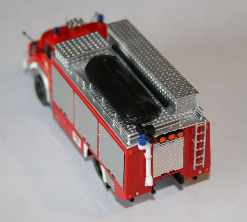 Das Modell entstand aus dem Preiser Feuerwehr-Kipper und dem Herpa RW-Aufbau. Fahrgestell und Kabine sind vom Preiser-Modell. Beim Aufbau wurde eine neue Dachbeladung und neue hintere Trittstufen angebaut. Div. Kleinteile ergänzen das Modell.