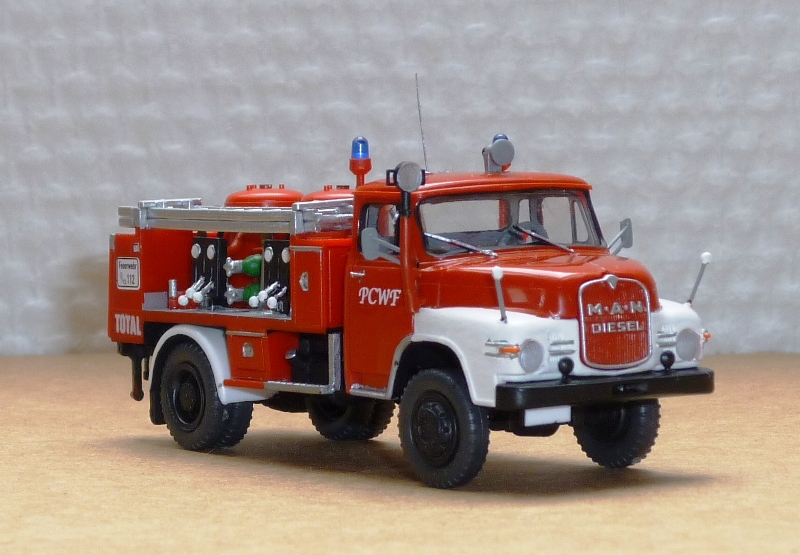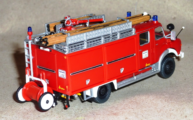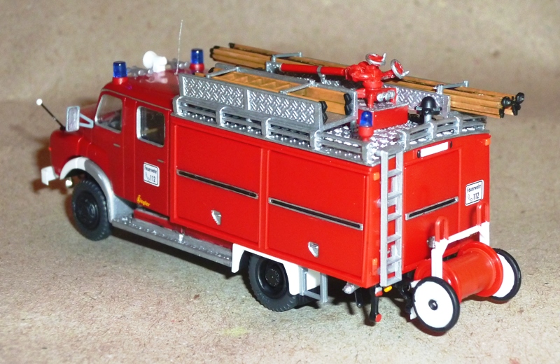 Ein fast reinrassiger Preiser-Umbau. Fahrgestell und Kabine vom RW-ÖL, langer LF 16-Aufbau von Bastian mit Klappen von Merlau, Kleinteile aus der Bastelkiste, Leiterlagerungen und Steckleiterteile von Preiser, Holz-Schiebleiter von Roco (meine letzte :cry: )