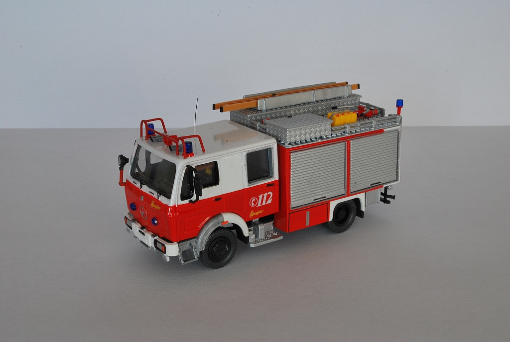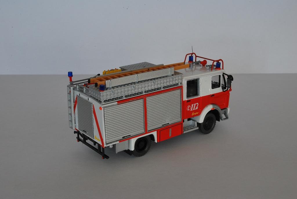 Es ist eine Mischung aus den Preiser Bausätzen 31128 (LF 16) und 31144 (TroTLF). Aus dem LF-Bausatz wurde der Aufbau verwendet und um einen tiefgezogenen Geräteraum aus Plastikplatten ergänzt. Die Staffelkabine ist aus dem Tro-Bausatz. Hier wurden die Mittelfenster verschlossen und verspachtelt. Das Dach wurden mit einem Rosenbauer RM 24 Monitor, zwei Dachkästen und Schaummittelkanistern bestückt.