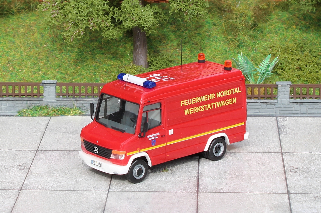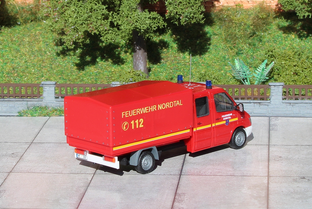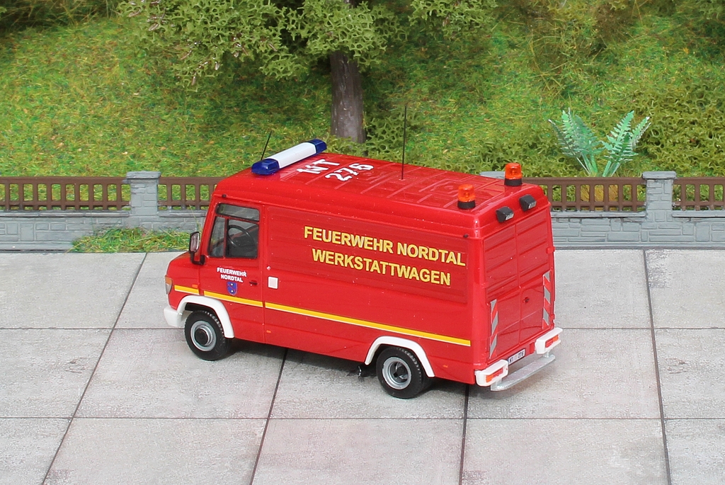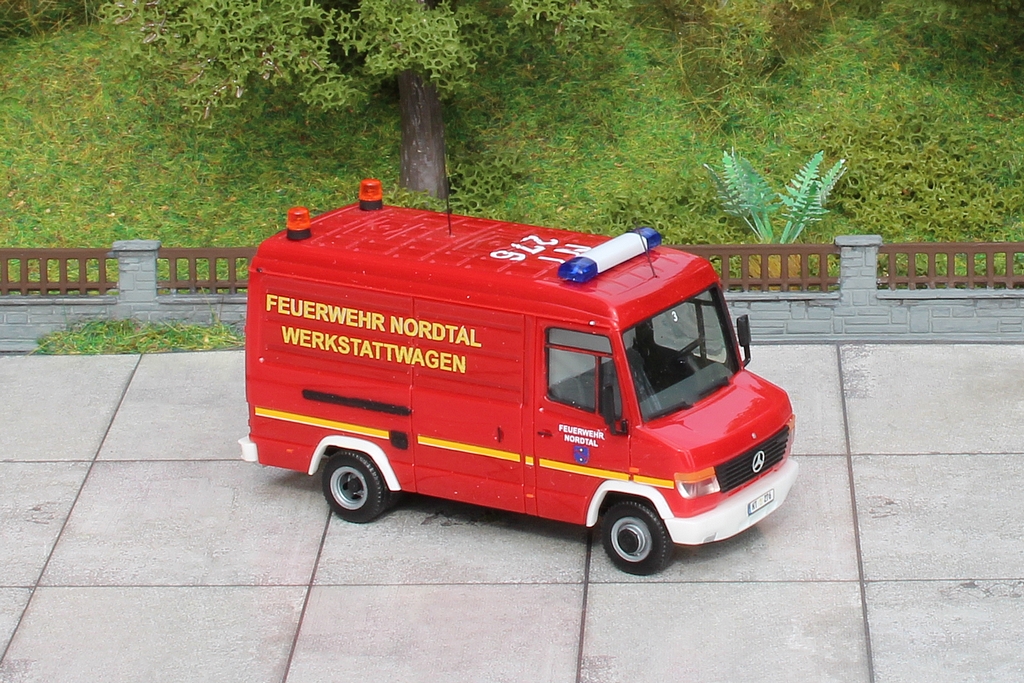 Es handelt sich um ein zivles, rotes Herpamodell, welches weiße Kotflügel, Rundumkennleuchten und eine hintere Umfeldbeleuchtung erhielt. Der Rest wie immer: Decals und Detailbemalung.
